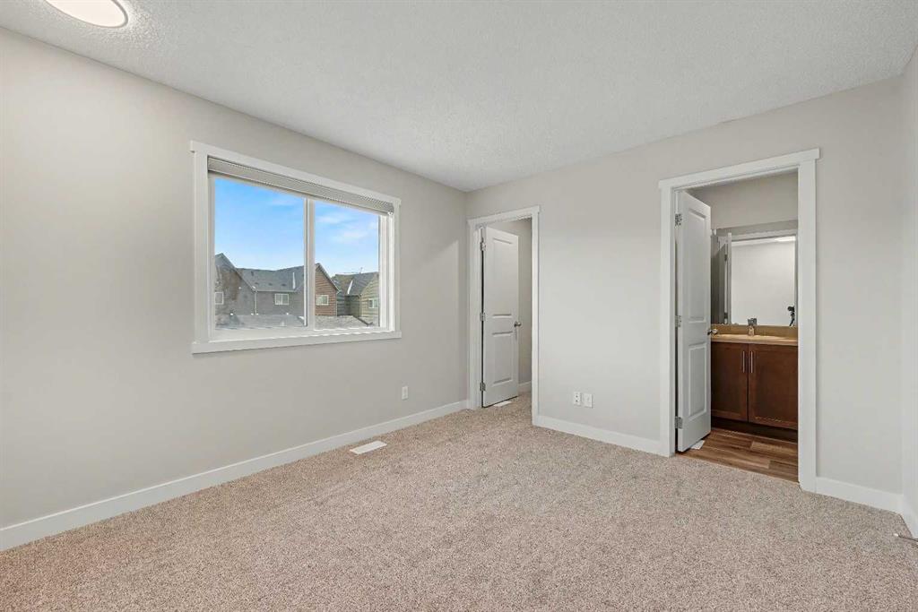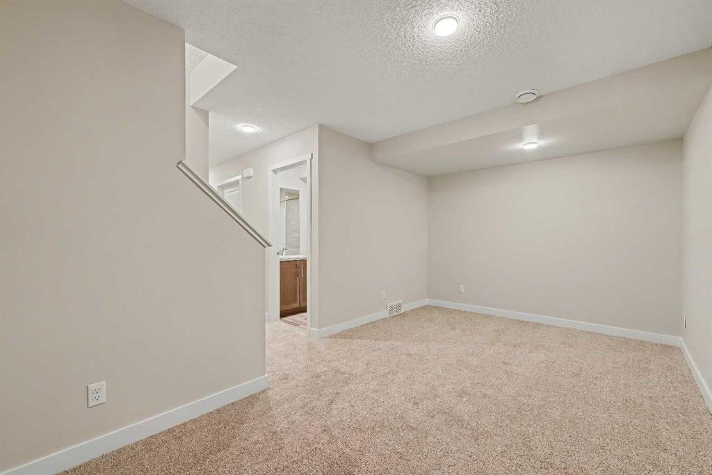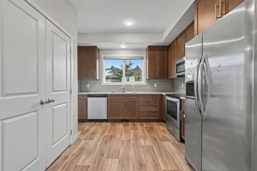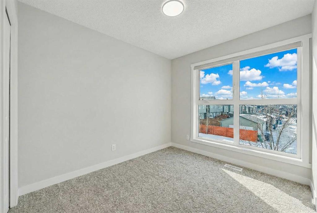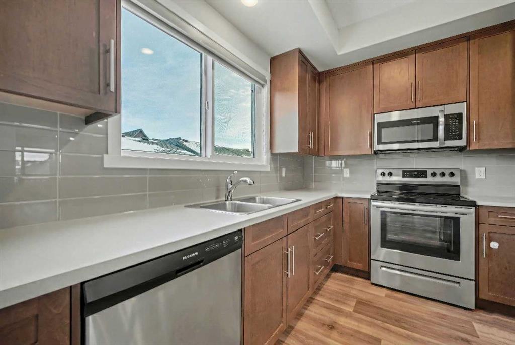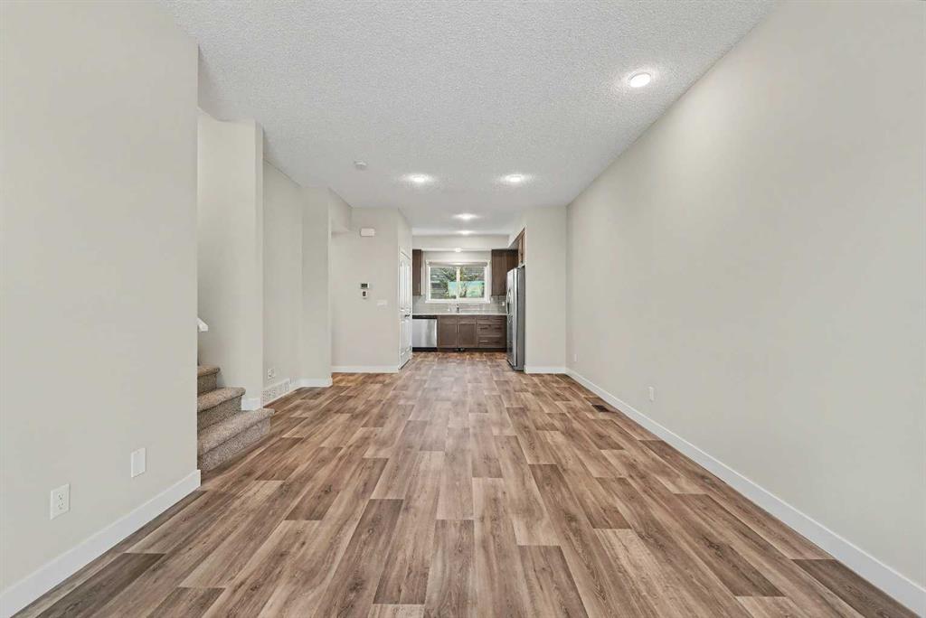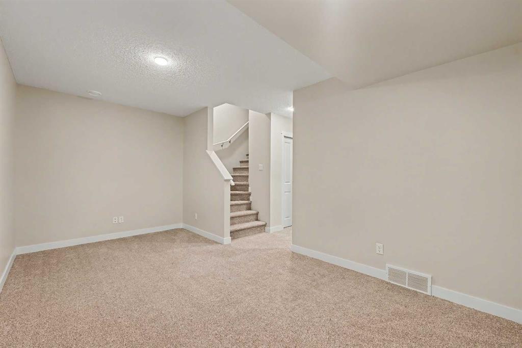 Welcome to this thoughtfully designed and functional 2-storey townhouse in the vibrant NW community of Carrington, offering over 1,800 sq ft of developed living space including a fully finished basement with an additional bedroom and full bathroom, perfect for guests, extended family, or a private home office. The open-concept main floor is bright and inviting, featuring durable luxury vinyl plank flooring and a well-designed layout perfect for everyday living and entertaining. The kitchen is thoughtfully laid out with ample cabinetry, modern tile backsplash, and stainless steel appliances, flowing seamlessly into the dining area for easy hosting. Large windows bring in abundant natural light to the living room, while a convenient 2-piece powder room completes the main level. Upstairs, the spacious primary bedroom offers a walk-in closet and a private ensuite, creating a comfortable retreat. Two additional well-sized bedrooms, a full main bathroom, and upper-level laundry provide excellent functionality for family living. The fully finished basement adds exceptional versatility with a large recreation area, fourth bedroom, and full bathroom, making it perfect for a media room, home office, or guest suite. The backyard is fully landscaped with access to the oversized single car garage accessed from the paved lane. Enjoy outdoor living with a private outdoor space ideal for summer BBQs and relaxation, along with convenient parking options. This home is surrounded by parks, playgrounds, pathways, ponds, and nearby shopping, with quick access to Stoney Trail, Deerfoot Trail, CrossIron Mills, and the airport. A fantastic opportunity to own a move-in-ready home in one of Calgary’s fastest-growing communities.