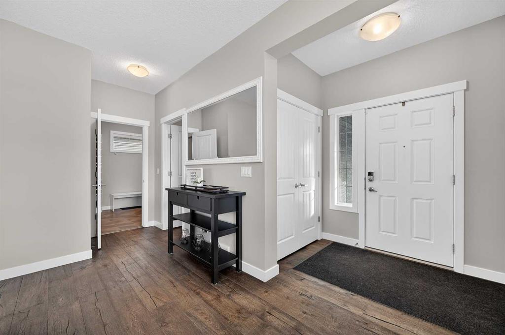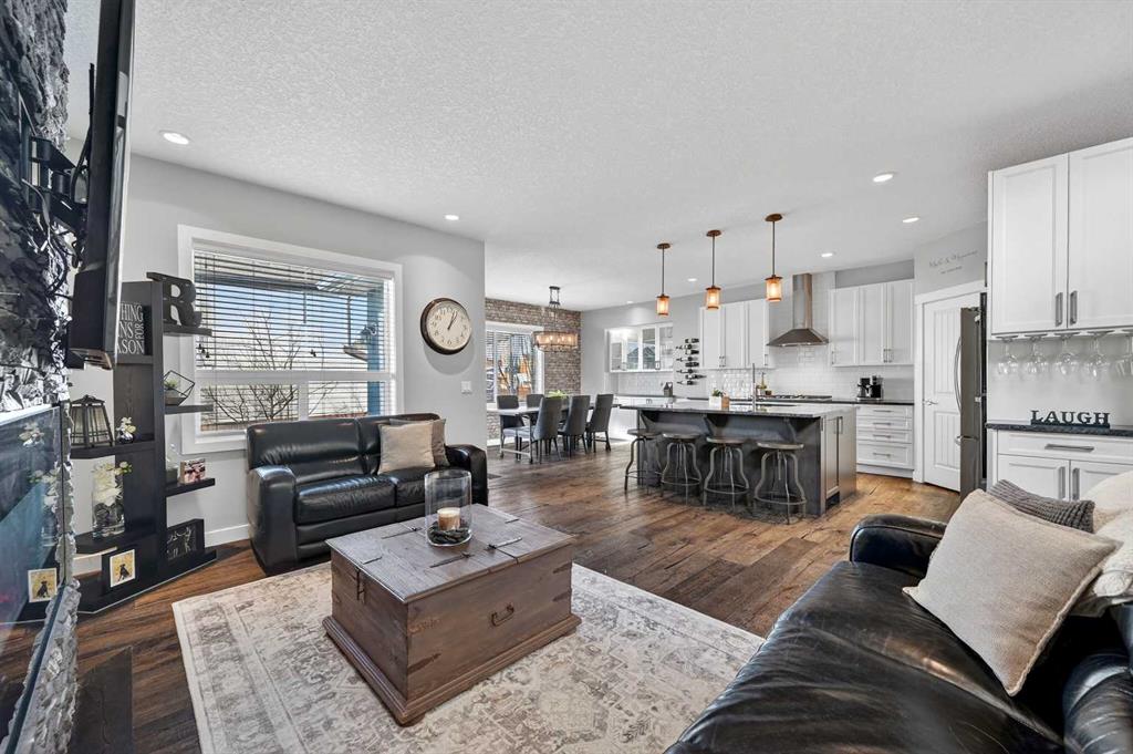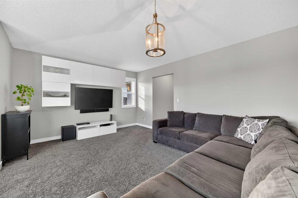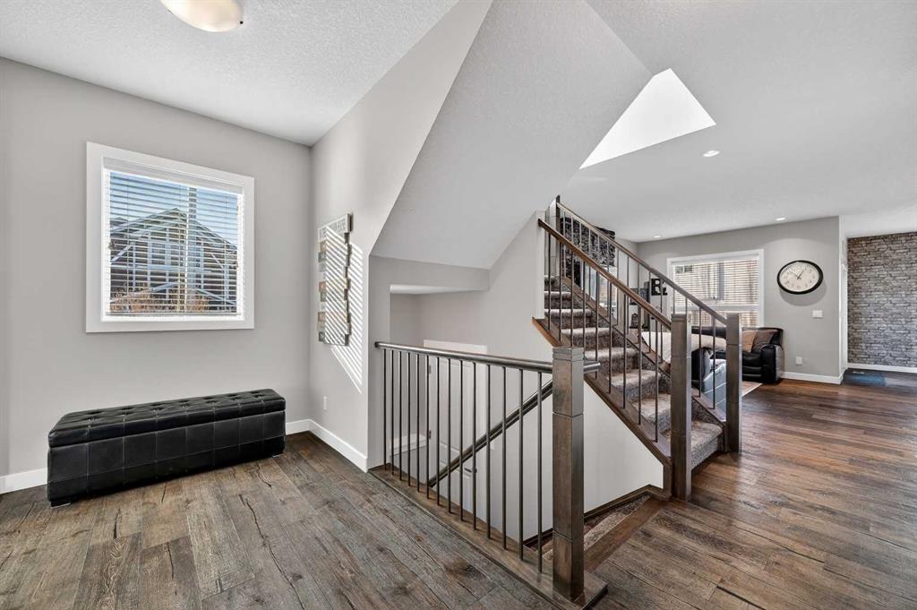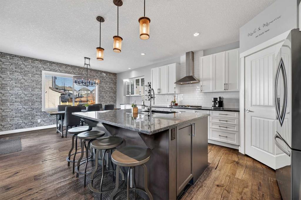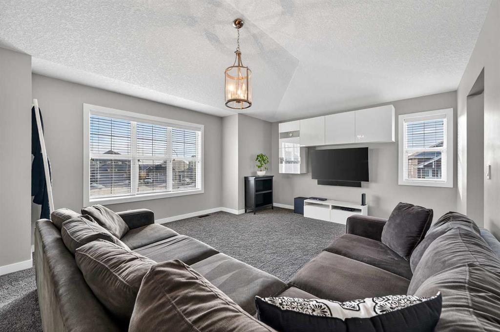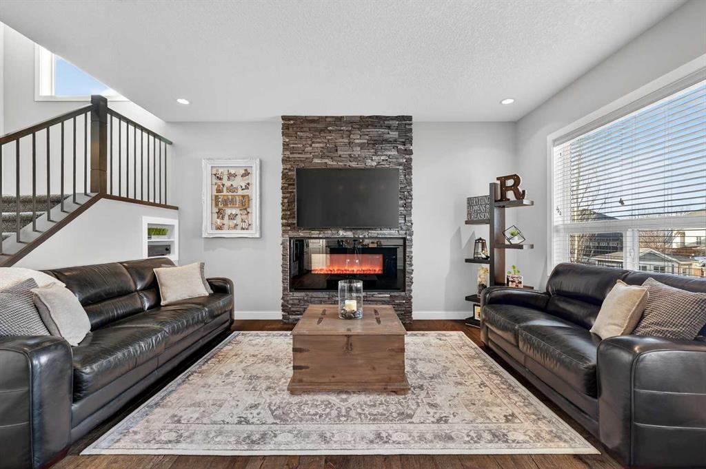 Welcome to this beautifully maintained 2-storey home in the heart of Cranston — a community known for its family-friendly atmosphere, scenic pathways, and quick access to schools, shopping, and the Bow River ridge. Situated on a desirable corner lot, this property offers both space and comfort, along with thoughtful upgrades throughout. Stepping inside, you’re greeted by a large, inviting entryway that opens into a bright main floor with engineered hardwood and 9-ft knockdown ceilings. The open-concept layout creates an easy flow between the dining area and the cozy living room, where a striking stone-faced electric fireplace becomes the natural gathering point. The kitchen is designed for those who love to cook and entertain — featuring stainless steel appliances including a chimney-style hood fan, built-in double ovens, and a gas cooktop. Granite counters, ample white cabinetry, a tile backsplash, a built-in hutch, and a spacious walk-in pantry provide both style and functionality. The oversized island with a silgranit sink, breakfast bar, pendant lighting, and extra storage ties it all together. From the dining area, a door leads to the large exposed-aggregate patio, perfect for summer evenings outdoors. The main level also includes a convenient laundry room with a sink, a 2-piece bathroom, and access to the double attached garage — complete with a built-in dog run and exterior door for easy outdoor access. Central air conditioning and built-in exterior LED lighting add comfort and curb appeal year-round. Upstairs, the primary bedroom offers a peaceful retreat with a generous walk-in closet and a 4-piece ensuite featuring ceramic tile flooring, granite counters, a large soaker tub, a walk-in shower, and a bright window. Three additional well-sized bedrooms, a full 4-piece bathroom, a linen closet, and a spacious bonus room with a vaulted ceiling complete the upper level — giving the whole family room to spread out. The basement is partly finished with framing and electrical already completed, making it easy to customize the space to your needs. It’s laid out for a future bedroom, full bathroom, large family or media room, and plenty of storage. Outside the home, Cranston offers an impressive list of amenities: multiple schools, parks, playgrounds, and the Cranston Residents Association with its year-round programs and facilities. You’re minutes from Seton’s shops, restaurants, YMCA, and South Health Campus, as well as the endless pathways along the Bow River and Fish Creek Park. This is a fantastic opportunity to own a well-cared-for home in one of Calgary’s most sought-after communities — a place where comfort, convenience, and lifestyle come together seamlessly.