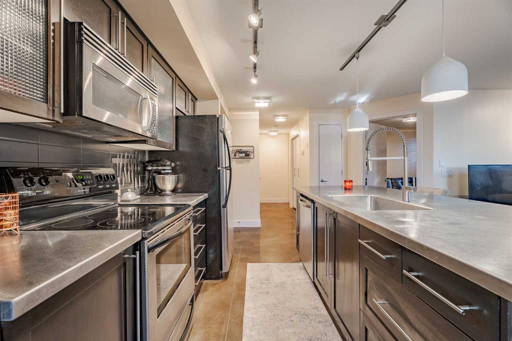 Welcome to this stylish and well maintained 2 bedroom, 2 bathroom condo in the heart of Altadore. This spacious home features a modern open-concept design with polished concrete floors and in-floor heating, offering both style and comfort. The bright, open living area is flooded with natural light from large windows and is anchored by a cozy gas fireplace, creating the perfect space for entertaining or relaxing at home. The adjacent dining area opens directly onto a private west-facing patio, ideal for enjoying afternoon sun and evening sunsets. The contemporary kitchen is thoughtfully designed with a large island and bar seating, stainless steel countertops, neutral backsplash, and stainless steel appliances. The primary bedroom includes a walk-in closet with custom shelving and a 4-piece ensuite featuring granite countertops. The well-designed, private floor plan places the second bedroom down the hall—perfect for guests, a home office, or a roommate setup. Additional highlights include in-suite laundry, a quiet and well-managed building, and assigned parking in a secure underground garage. Ideally located just blocks from River Park and Sandy Beach, and steps from the shops, cafés, and restaurants of Marda Loop, this home offers easy access to public transit and is only minutes from downtown—combining urban convenience with a relaxed neighborhood feel.