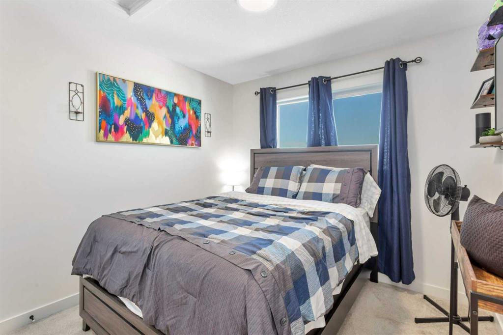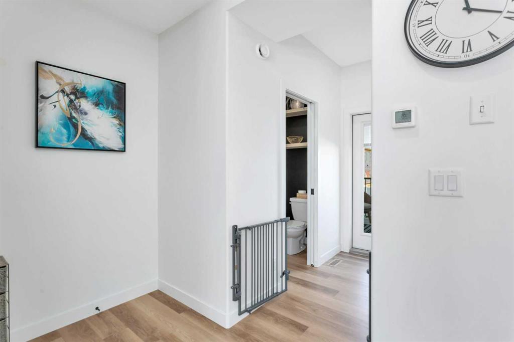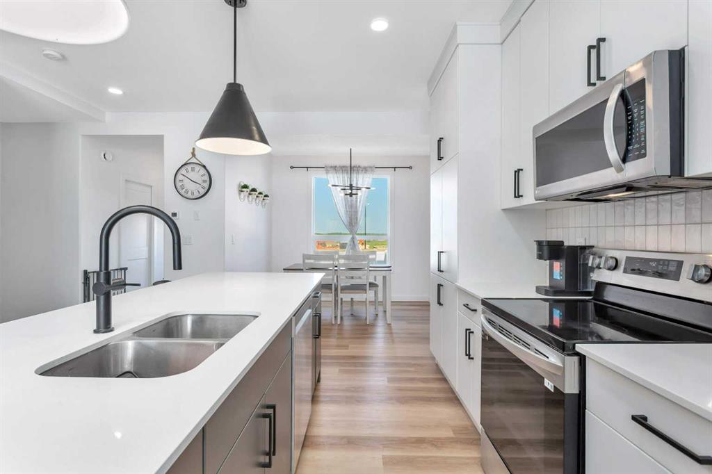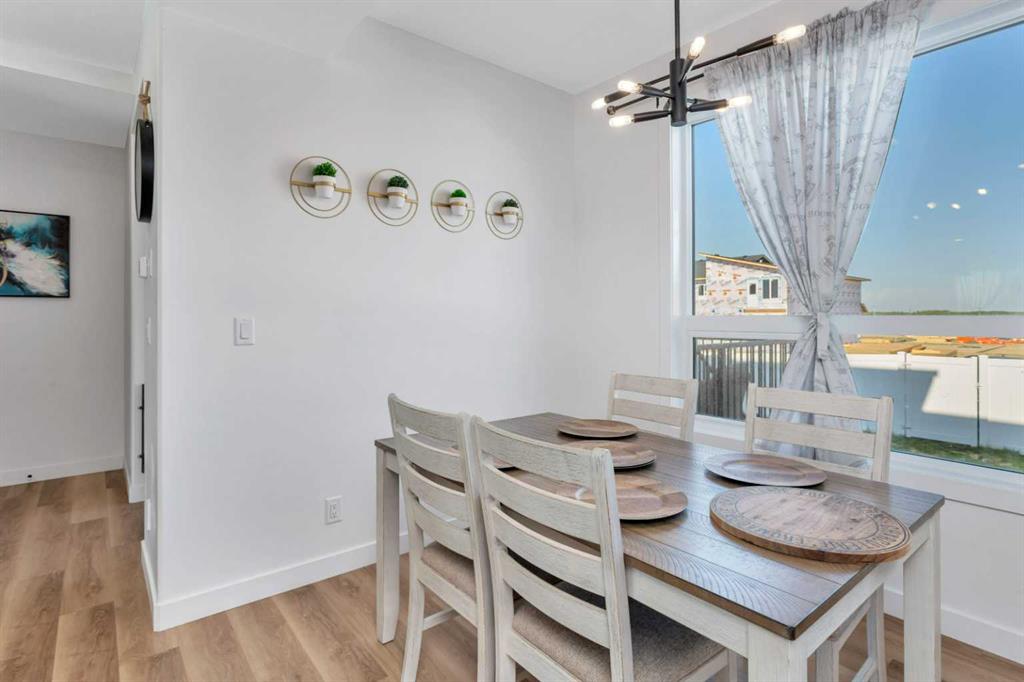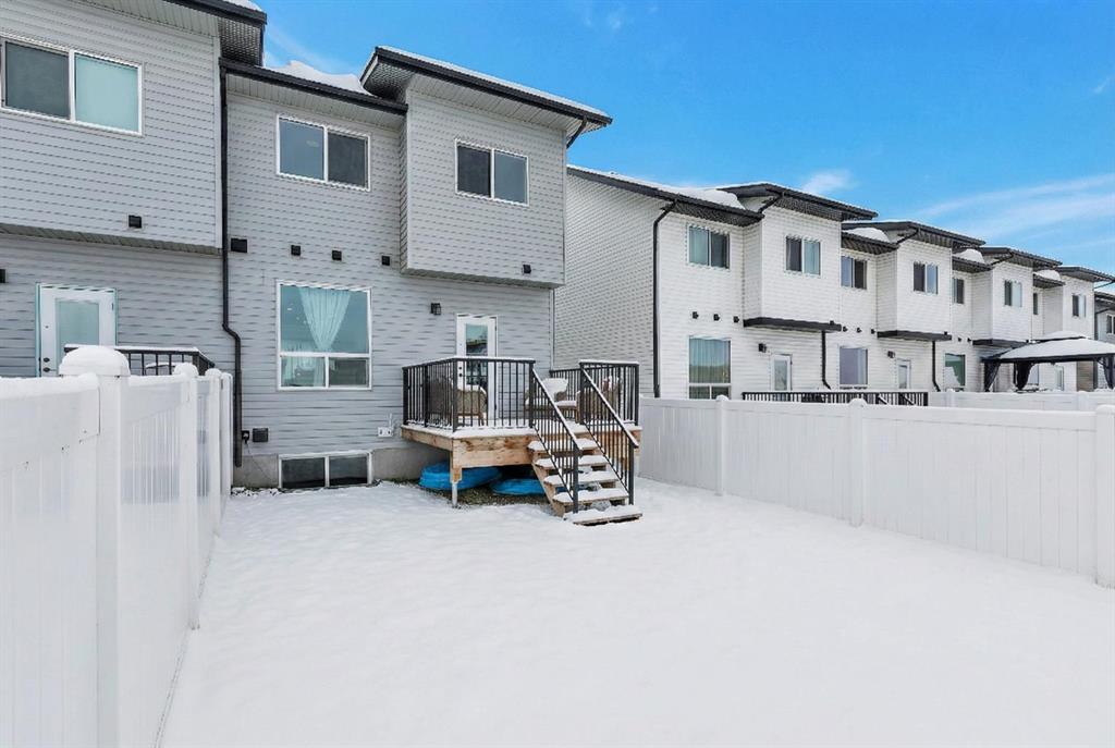 END UNIT with A/C and March 1 possession available. Stylish, spacious, and modern 2-storey townhome in the new community of Iron Gate, offering low-maintenance living and peace of mind with Alberta New Home Warranty still in place. Enjoy your charming 7' x 7' front deck before entering a bright, open-concept main floor filled with natural light from large energy-efficient triple-pane windows. Durable vinyl plank flooring runs throughout the main level, while plush carpet upstairs adds warmth and comfort. The kitchen truly anchors the home with a massive island featuring extended quartz countertops, perfect for stools, homework time, or late-night chats, plus a built-in pantry and four stainless steel appliances. The expansive dining area easily accommodates a full-size table with room to host, and the separate mudroom with a half bath offers practical family functionality with direct access to the east-facing back deck. Outside, enjoy a fully fenced backyard with rear lane access, two parking stalls, and space for a future single detached garage. Upstairs includes a convenient laundry room, two generously sized bedrooms, a full main bathroom, and a primary suite complete with a walk-in closet and 4-piece ensuite. Extra-large hallway closets provide excellent additional storage. The basement is unfinished and ready for your ideas, already plumbed and framed for a future bedroom, bathroom, and rec room, with large windows bringing in great natural light. Central A/C keeps the interior comfortable year-round. Located close to shopping, restaurants, and Highway 20 for quick access in and out of town, this move-in-ready home checks all the boxes for comfort, convenience, and long-term value.