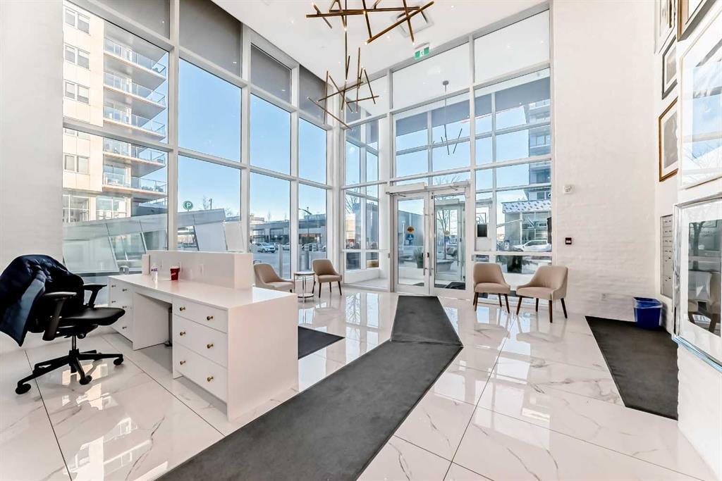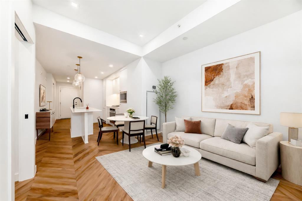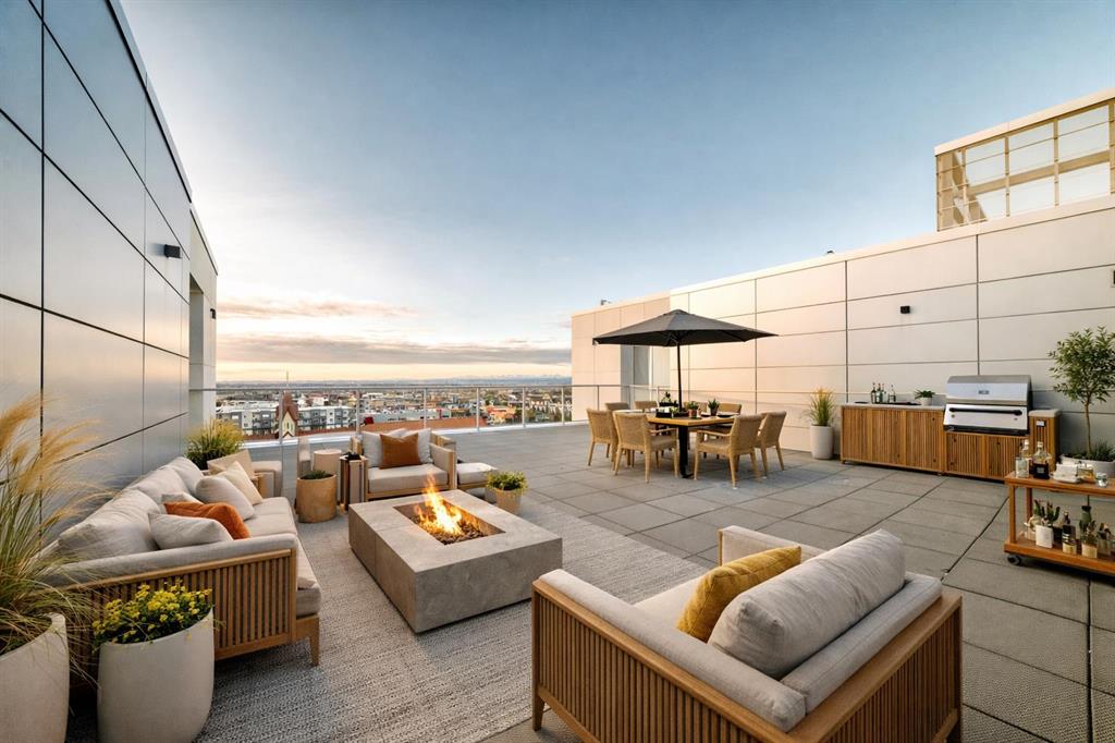 Welcome to Gateway by TRUMAN, ideally located in the vibrant, master-planned West District. This concrete-constructed residence offers modern luxury, thoughtful design, and exceptional urban convenience. This two-bedroom, two-bathroom home with titled underground parking features chevron wide-plank flooring, designer lighting, and flat-painted ceilings for a timeless, upscale feel. Floor-to-ceiling windows flood the space with natural light and capture mountain views, while central air conditioning ensures year-round comfort. The chef-inspired kitchen blends style and function with matte custom cabinetry, brushed-gold accents, quartz countertops and backsplash, under-cabinet lighting, and a generous eating bar. Premium appliances include a gas cooktop, wall oven, 36” Fisher & Paykel integrated refrigerator, paneled dishwasher, and statement hood fan. The open living and dining areas extend to a private terrace, ideal for outdoor lounging and entertaining. The primary suite features a walk-in closet and spa-inspired ensuite with quartz counters, mosaic tile, and a glass-enclosed shower. The second bedroom offers flexibility as a guest room or home office with access to a stylish four-piece bath. Additional highlights include in-suite laundry, ample storage, and secure underground parking. Residents enjoy premium amenities such as a rooftop patio, owner’s lounge, concierge, bike storage, EV charging, and visitor parking. Surrounded by parks, walking paths, boutique shopping, cafés, and dining, this home offers elevated living in one of Calgary’s most sought-after communities.