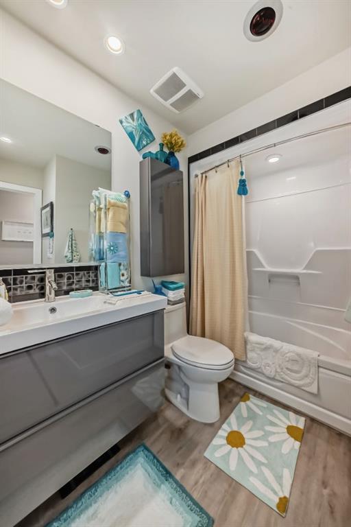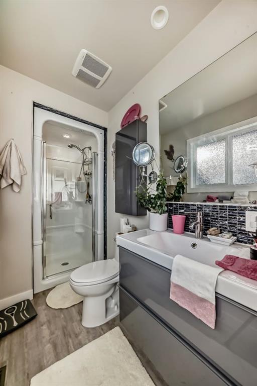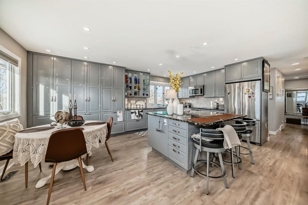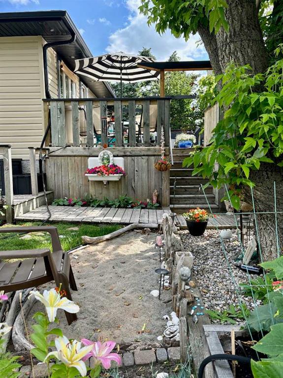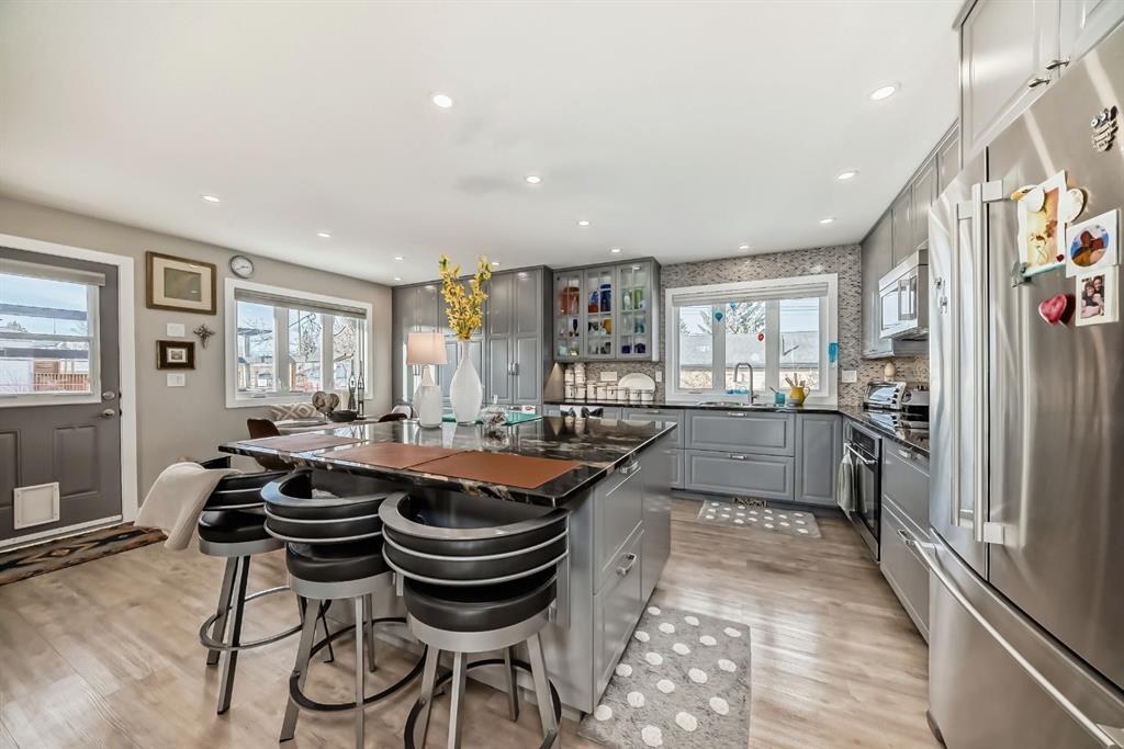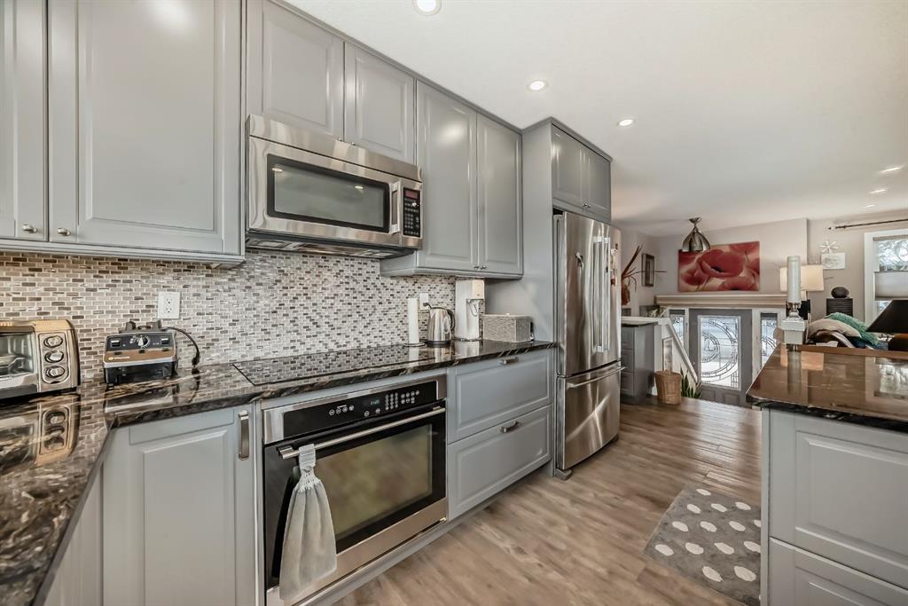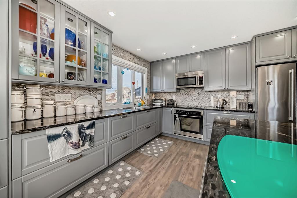 Welcome to this exceptionally well updated Bi-level, perfectly positioned on a spacious, fully landscaped and fully fenced corner lot with striking stamped concrete front sidewalks and excellent curb appeal. This move in ready home also offers RV parking and a 26' x 38' heated detached garage with new shingles, making a strong first impression from the moment you arrive. Step inside to a bright, welcoming upper level that has been completely transformed. The sun filled, south facing living room features triple pane windows throughout the home, providing enhanced energy efficiency, comfort and sound reduction. The open concept kitchen and dining area is designed for both everyday living and entertaining, showcasing granite countertops, an oversized 5’ x 5’ island with eating bar, under cabinet lighting and a sleek hidden dishwasher for a clean, modern aesthetic. Tons of storage has been added with custom cabinetry, including slide out organizers in every cupboard and closet, delivering outstanding space for organization. The main floor also features a full 4 pce bathroom and two generously sized bedrooms, ideal for family members, guests or flexible use. Completing this level is the spacious primary suite, which offers a walk in closet and a private 3 pce ensuite. The lower level offers exceptional versatility with two additional bedrooms, a dedicated home office (flex room/sewing room) and a comfortable family room centered around a cozy gas fireplace. This level also includes a stylish full bathroom with a wall hung toilet and sink, a full, easy to access storage room and a separate laundry room. Outside, enjoy a beautifully curated backyard with perennial/vegetable gardens, fruit bearing trees, full fencing, RV parking and convenient back alley access. Unwind on the West facing deck or the lower North facing deck—perfect for relaxing or entertaining in a quiet setting. The impressive detached garage is a dream setup, featuring 9-foot overhead doors, 10-foot ceilings, an overhead gas heater and a beam ready for a chain hoist. Major upgrades also include new soffits, fascia and eaves with leaf guards on both the home and garage. This thoughtfully upgraded home truly checks all the boxes—move in, unpack, and enjoy. Book your private tour today!