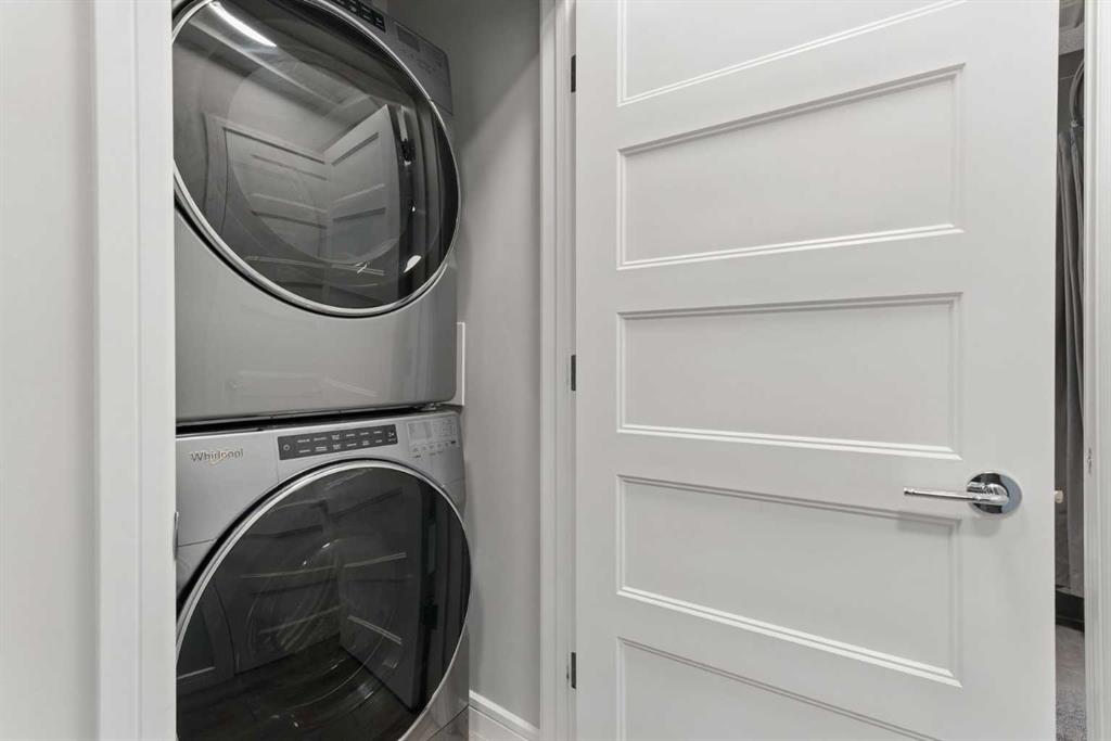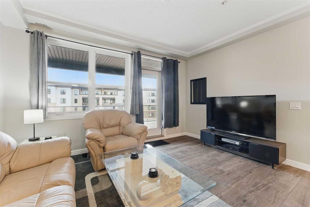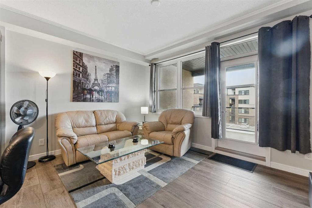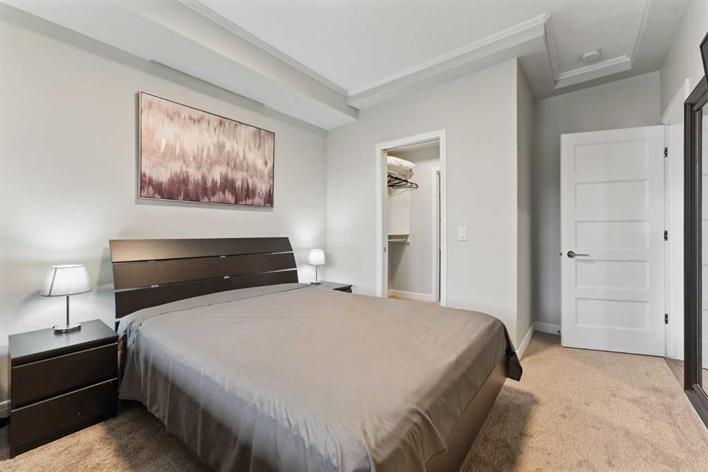 Welcome to this modern and stylish one-bedroom condo in the sought-after community of Greenwood/Greenbriar! Built in 2019, this beautifully maintained home offers 596 sq. ft. of contemporary living space with thoughtful design, upscale finishes, and an ideal location close to parks, shopping, and walking paths. Inside, you’ll find an open-concept layout with high ceilings, vinyl plank flooring, and large windows that fill the space with natural light. The kitchen is a showstopper, featuring sleek quartz countertops, a kitchen island with breakfast bar seating, stainless steel appliances, and ample storage with built-in features and crown molding. The spacious living and dining area offers the perfect setting for relaxing or entertaining, while the private west-facing balcony—with a BBQ gas line and courtyard views—extends your living space outdoors. The bedroom includes a generous walk-in closet, and the full 4-piece bathroom showcases modern finishes and tile flooring. Additional highlights include in-floor heating, central air conditioning, in-unit laundry, and elegant touches like track lighting and ceiling fans. This home comes with a titled tandem underground parking stall for 2 vehicles, an assigned storage locker, and access to an array of building amenities such as secure underground parking, a bike storage area, community gardens, gazebo, picnic and playground areas, and visitor parking. The building also offers elevator access and professional management for added peace of mind. Enjoy easy access to nearby parks, schools, and shopping, plus convenient proximity to major routes and the beautiful walking and biking paths that wind through this vibrant northwest Calgary neighbourhood. With low condo fees that include heat, water, insurance, snow removal, and more, this is urban living made simple. Perfect for first-time buyers, professionals, or investors—this condo combines comfort, style, and convenience in one exceptional package