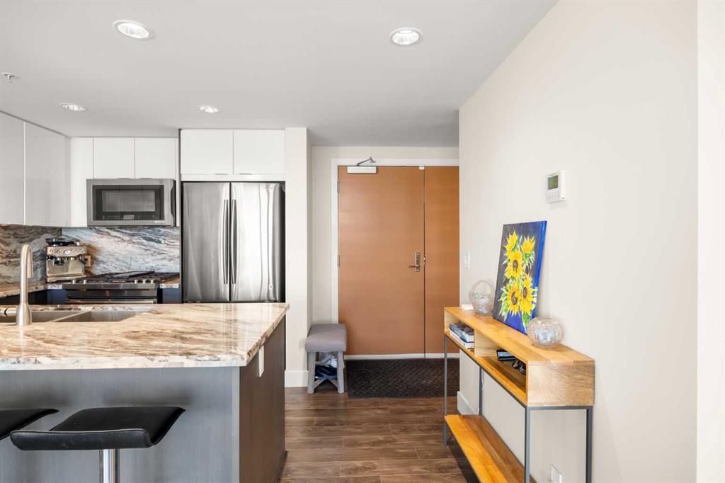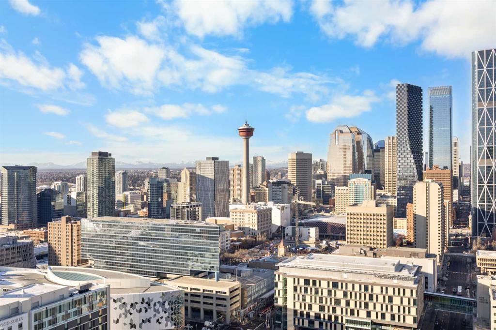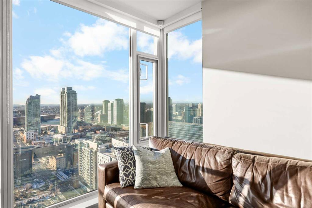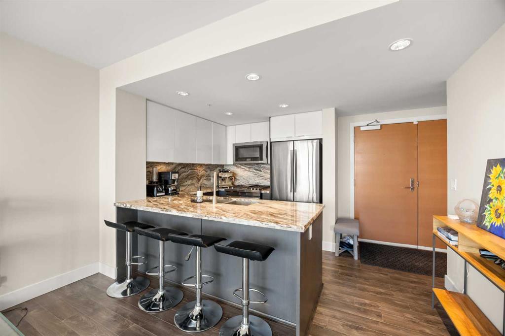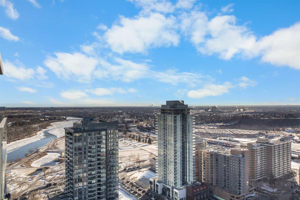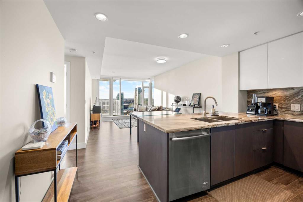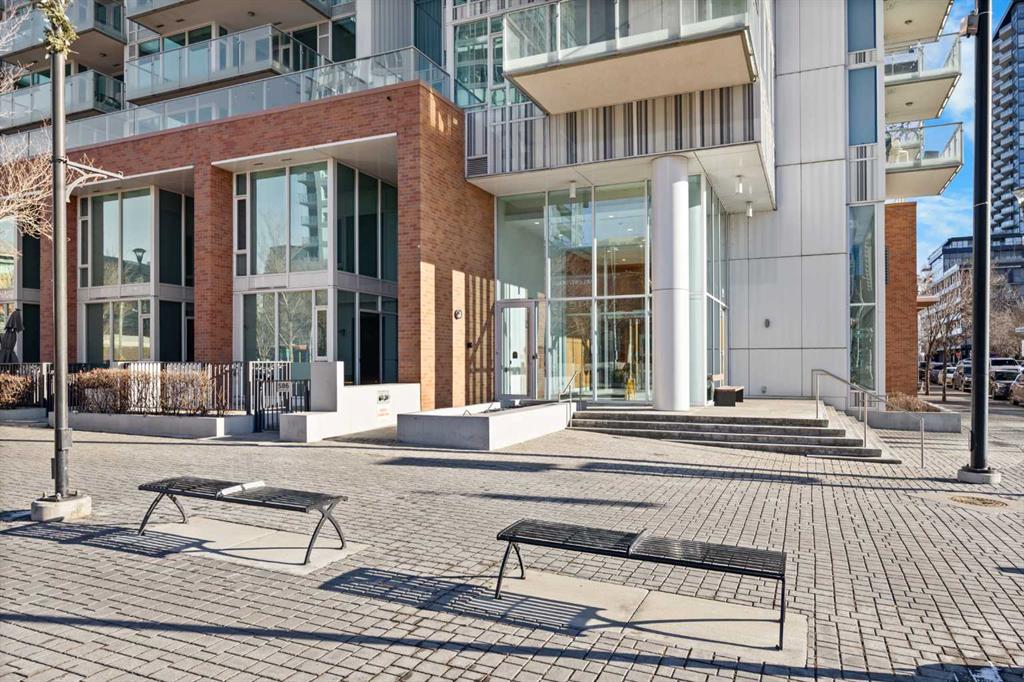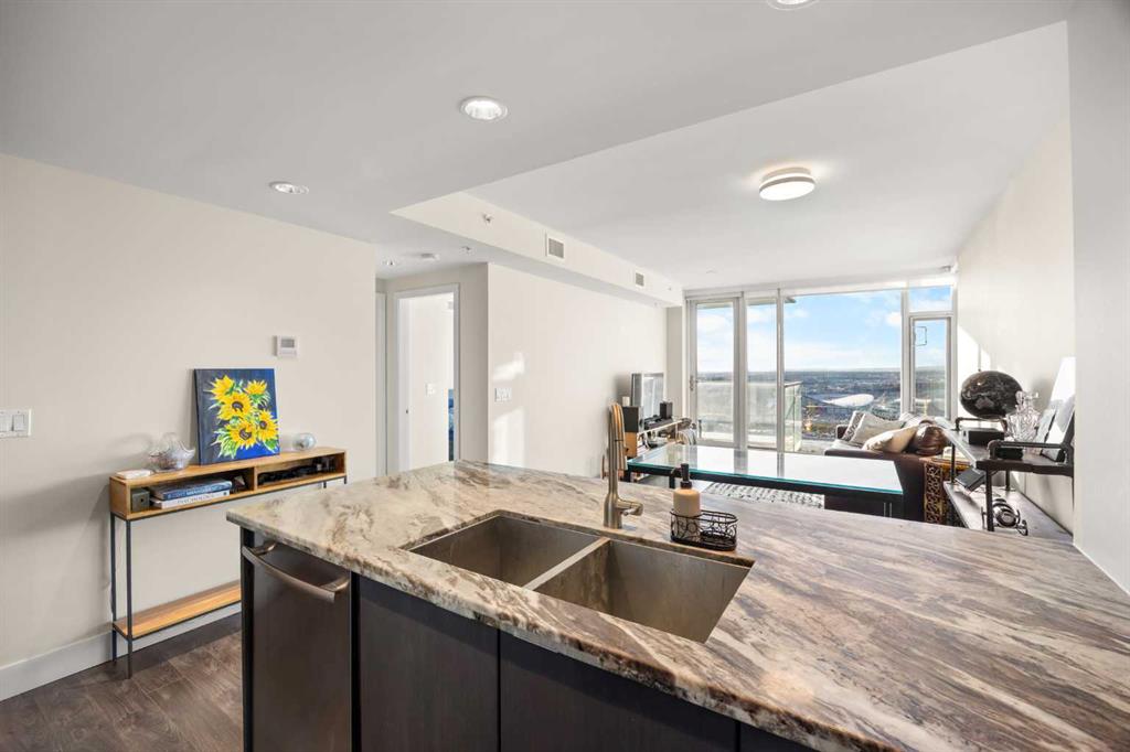 WOW! Perched on the TOP floor, this stunning 1 Bedroom + Den condo offers unobstructed south-facing views of the Calgary Tower, downtown skyline, and Bow River—a truly breathtaking urban panorama. Step inside to luxury vinyl plank flooring throughout and a functional Den immediately on your left, ideal for a home office or study space, before the layout opens into a bright open-concept Living, Dining, and Kitchen area. The well-appointed Kitchen features granite countertops, a peninsula with eating bar, and JennAir stainless steel appliances, including a 4-burner gas stove with grill and griddle and microwave, making it both stylish and practical for everyday living and entertaining. The space flows seamlessly into the Dining area and Living Room, where floor-to-ceiling window panels flood the unit with natural light and lead to a generously sized south-facing Balcony with gas hookup—the perfect spot to enjoy sweeping city views day or night. The Primary Bedroom is well sized and also enjoys the same stunning south-facing views through its full-height windows, with a patio door providing direct access to the balcony—creating the perfect backdrop to unwind and enjoy iconic downtown and Calgary Tower views. A 4-piece Bathroom features granite countertops, and in-suite laundry is thoughtfully located near the bedroom for added functionality. This condo includes 2 underground parking stalls conveniently located near the elevator, both being end stalls for extra space and easy access, as well as 1 storage locker for added convenience. Residents enjoy access to premium building amenities, including a fitness centre, party room with kitchen, sauna, steam room, outdoor patio with BBQ area, and fire pit, along with concierge service in the front lobby for added security and package handling. Located within walking distance to Superstore, Riverwalk along the Bow River, Riverfront Pathways, Prince’s Island Park, YMCA, C-Train, shopping, and an array of dining options, this home delivers elevated downtown living at its finest.