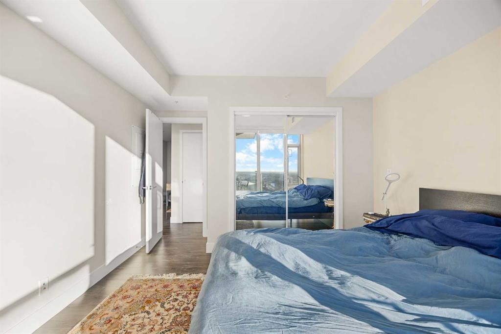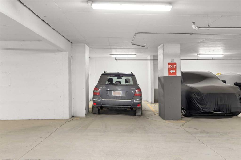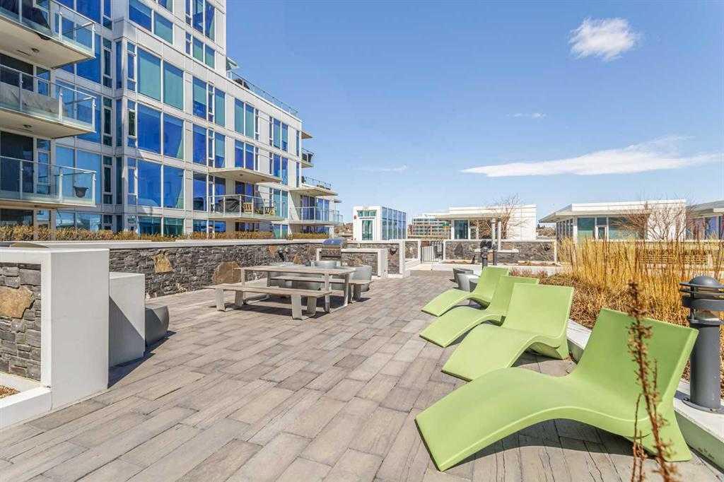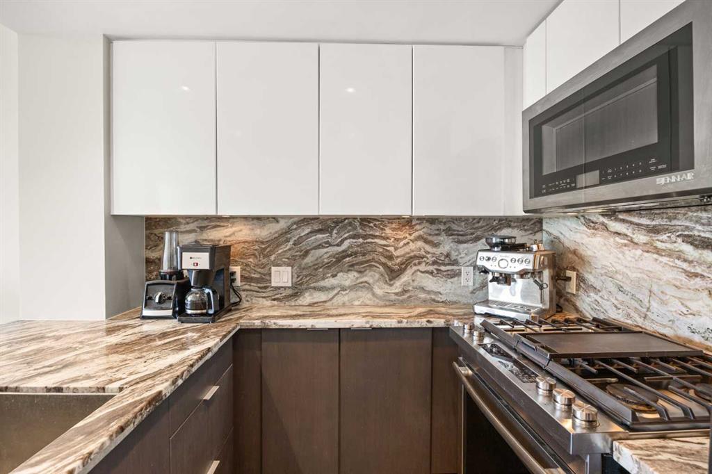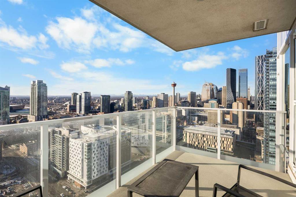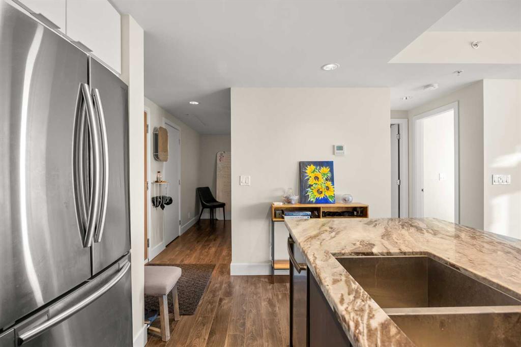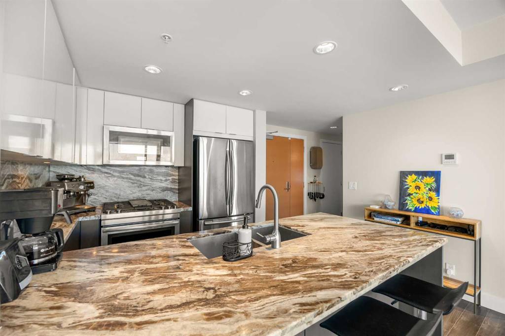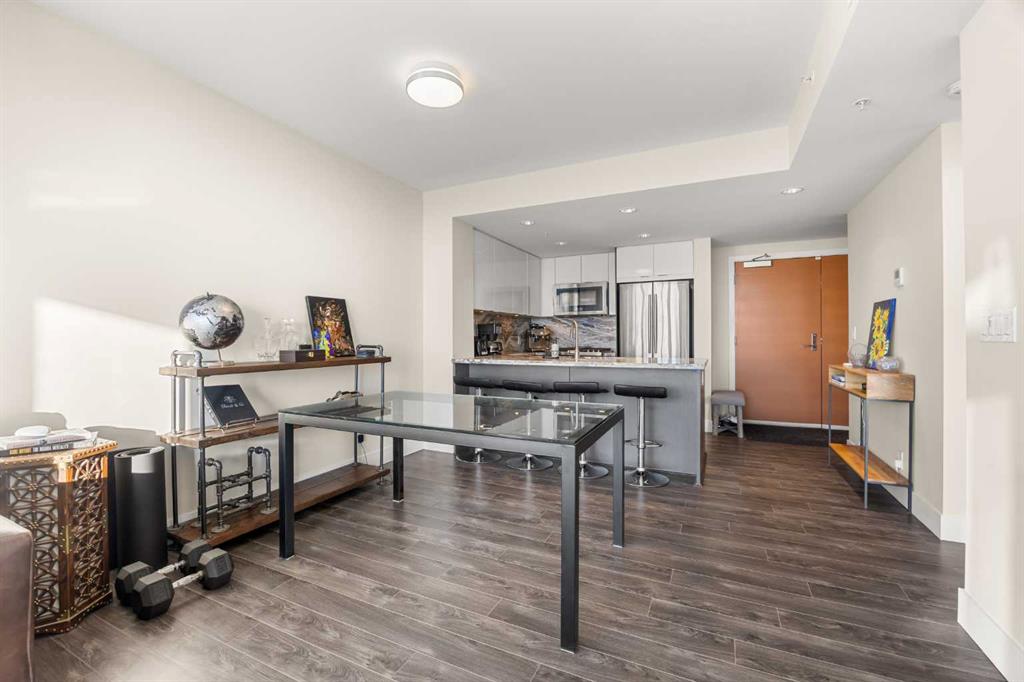 WOW! Perched on the TOP floor, this stunning 1 Bedroom + Den condo offers unobstructed south-facing views of the Calgary Tower, downtown skyline, and Bow River—a truly breathtaking urban panorama. Step inside to luxury vinyl plank flooring throughout and a functional Den immediately on your left, ideal for a home office or study space, before the layout opens into a bright open-concept Living, Dining, and Kitchen area. The well-appointed Kitchen features granite countertops, a peninsula with eating bar, and JennAir stainless steel appliances, including a 4-burner gas stove with grill and griddle and microwave, making it both stylish and practical for everyday living and entertaining. The space flows seamlessly into the Dining area and Living Room, where floor-to-ceiling window panels flood the unit with natural light and lead to a generously sized south-facing Balcony with gas hookup—the perfect spot to enjoy sweeping city views day or night. The Primary Bedroom is well sized and also enjoys the same stunning south-facing views through its full-height windows, with a patio door providing direct access to the balcony—creating the perfect backdrop to unwind and enjoy iconic downtown and Calgary Tower views. A 4-piece Bathroom features granite countertops, and in-suite laundry is thoughtfully located near the bedroom for added functionality. This condo includes 2 underground parking stalls conveniently located near the elevator, both being end stalls for extra space and easy access, as well as 1 storage locker for added convenience. Residents enjoy access to premium building amenities, including a fitness centre, party room with kitchen, sauna, steam room, outdoor patio with BBQ area, and fire pit, along with concierge service in the front lobby for added security and package handling. Located within walking distance to Superstore, Riverwalk along the Bow River, Riverfront Pathways, Prince’s Island Park, YMCA, C-Train, shopping, and an array of dining options, this home delivers elevated downtown living at its finest.