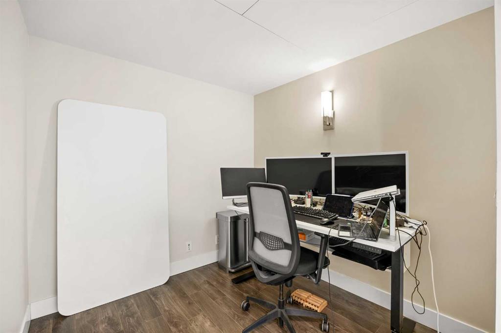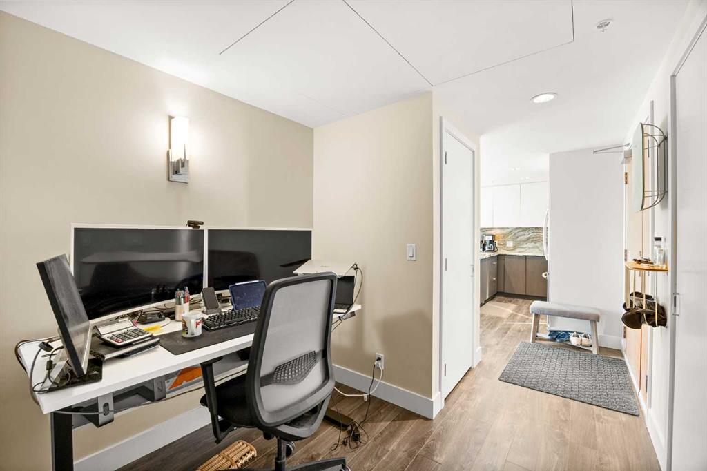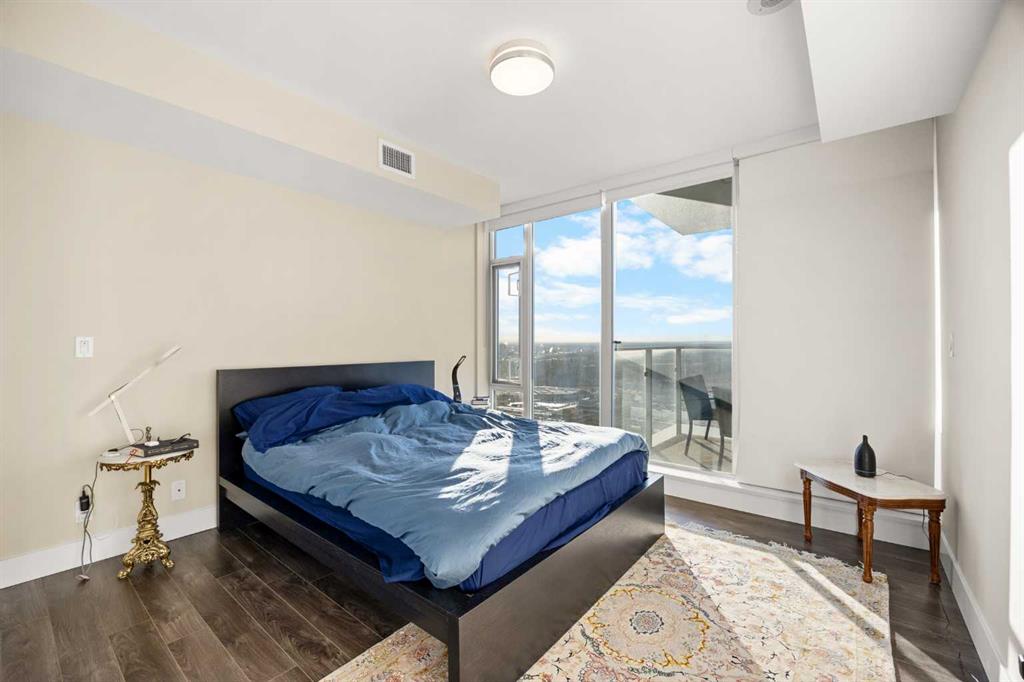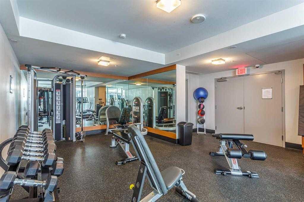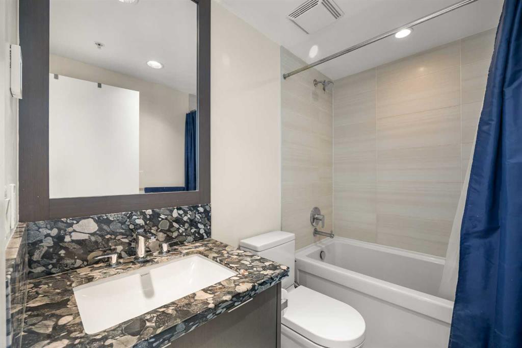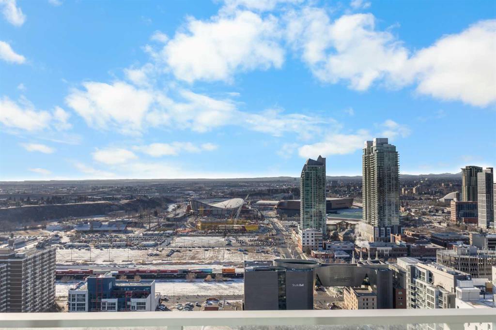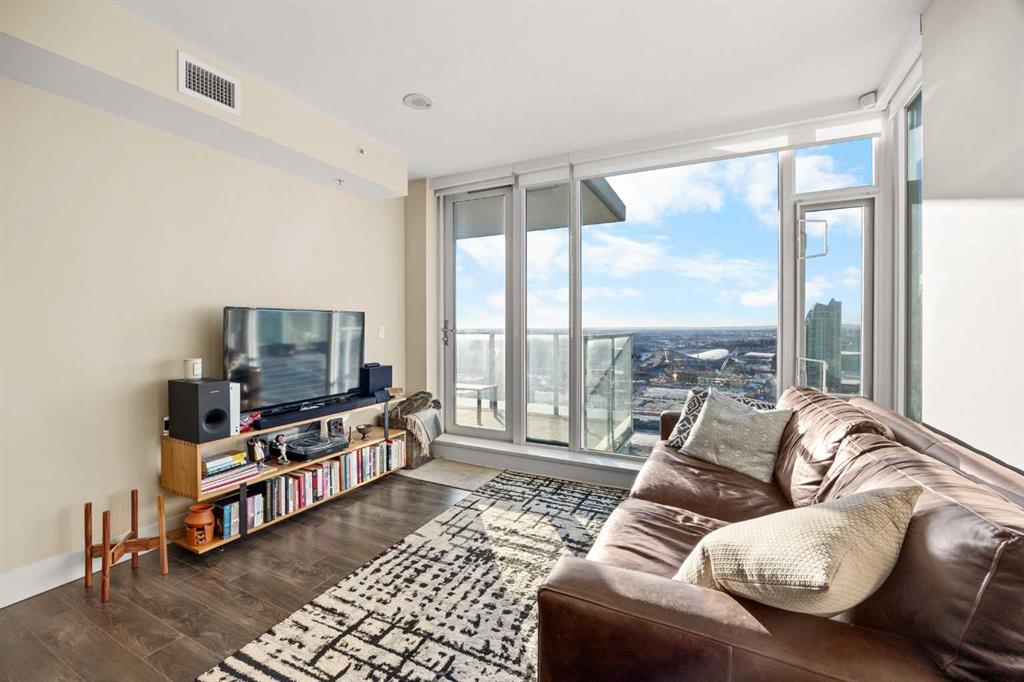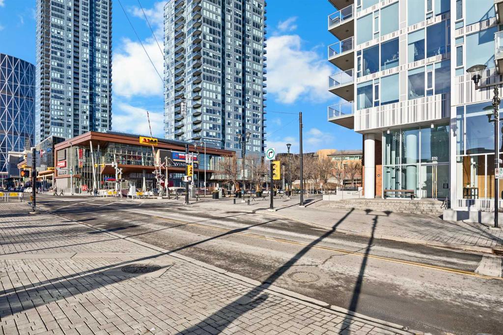 WOW! Perched on the TOP floor, this stunning 1 Bedroom + Den condo offers unobstructed south-facing views of the Calgary Tower, downtown skyline, and Bow River—a truly breathtaking urban panorama. Step inside to luxury vinyl plank flooring throughout and a functional Den immediately on your left, ideal for a home office or study space, before the layout opens into a bright open-concept Living, Dining, and Kitchen area. The well-appointed Kitchen features granite countertops, a peninsula with eating bar, and JennAir stainless steel appliances, including a 4-burner gas stove with grill and griddle and microwave, making it both stylish and practical for everyday living and entertaining. The space flows seamlessly into the Dining area and Living Room, where floor-to-ceiling window panels flood the unit with natural light and lead to a generously sized south-facing Balcony with gas hookup—the perfect spot to enjoy sweeping city views day or night. The Primary Bedroom is well sized and also enjoys the same stunning south-facing views through its full-height windows, with a patio door providing direct access to the balcony—creating the perfect backdrop to unwind and enjoy iconic downtown and Calgary Tower views. A 4-piece Bathroom features granite countertops, and in-suite laundry is thoughtfully located near the bedroom for added functionality. This condo includes 2 underground parking stalls conveniently located near the elevator, both being end stalls for extra space and easy access, as well as 1 storage locker for added convenience. Residents enjoy access to premium building amenities, including a fitness centre, party room with kitchen, sauna, steam room, outdoor patio with BBQ area, and fire pit, along with concierge service in the front lobby for added security and package handling. Located within walking distance to Superstore, Riverwalk along the Bow River, Riverfront Pathways, Prince’s Island Park, YMCA, C-Train, shopping, and an array of dining options, this home delivers elevated downtown living at its finest.
