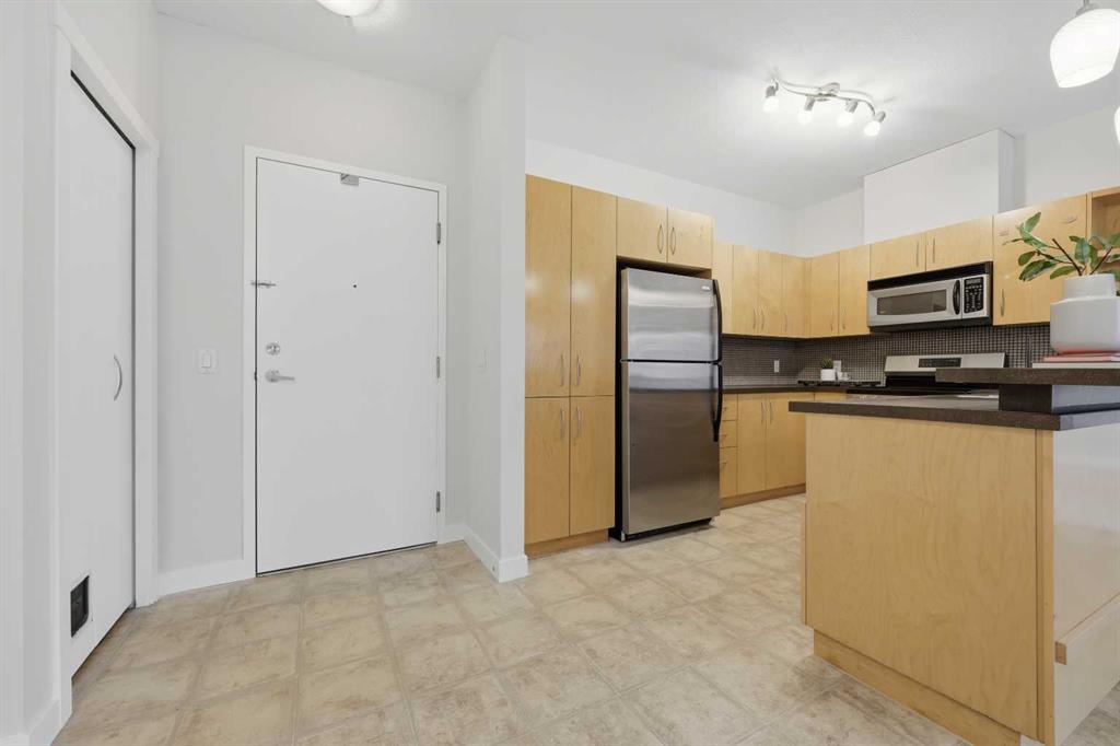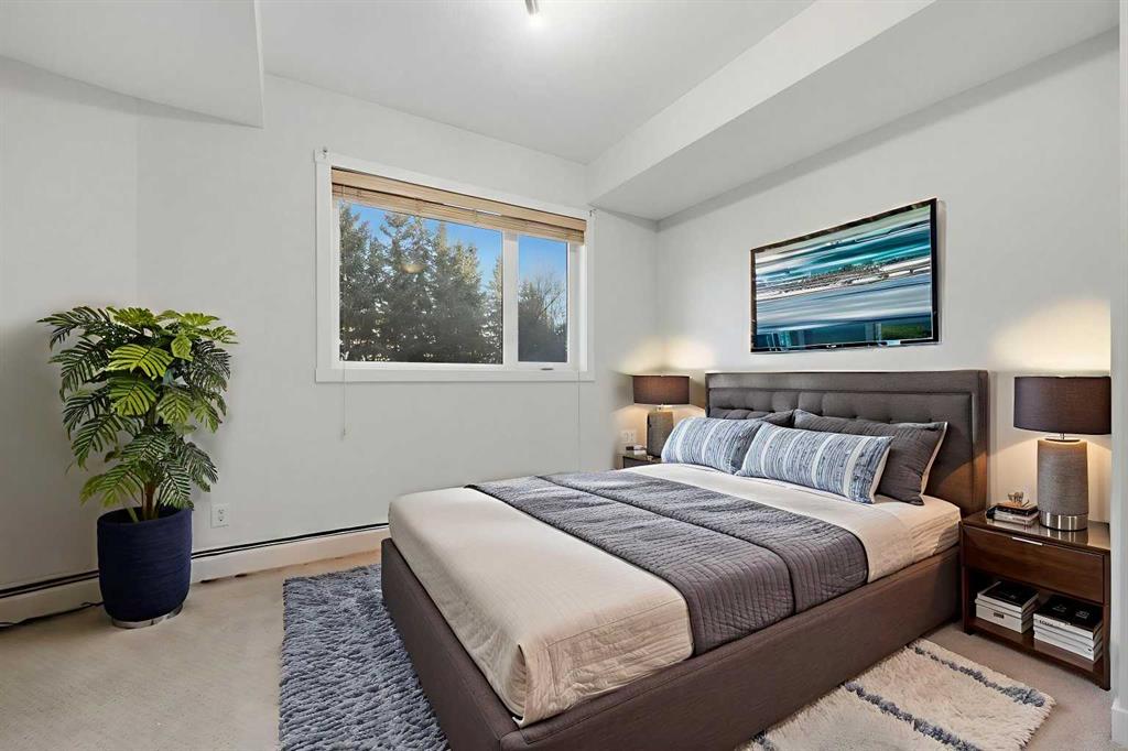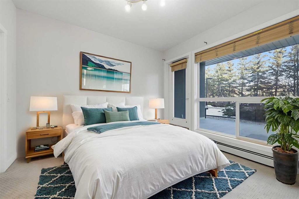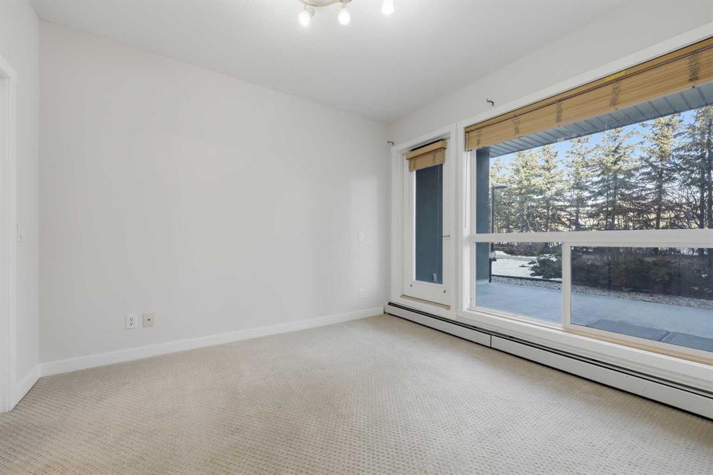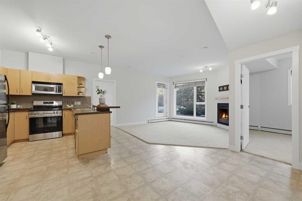 Welcome to this bright and spacious 2 bedroom, 2 bathroom ground-floor unit in an unbeatable location. Offering 816 square feet of well-designed living space, and nearly 9 ft ceilings, the home features a smart split-bedroom layout—placing bedrooms on opposite sides of the unit for privacy, making it perfect for roommates, guests, or families. Step directly onto your private patio with a gas hookup, overlooking lush green space and a walking path—an ideal setup for dog owners or anyone who appreciates easy outdoor access. Inside, the home is truly move-in ready featuring professionally-installed, brand new shower fixtures, a fresh coat of paint throughout and brand-new stainless steel dishwasher and electric range. The sun-filled living area with a cozy gas fireplace is designed for entertaining with a dedicated dining area and a breakfast bar for casual meals with friends and family. You are well positioned just steps from the Westside Recreation Centre, home to swimming pools, skating rinks, a fitness centre, and an indoor track. The location is incredibly walkable, situated near 69th St LRT Station for an easy commute, Ernest Manning High School, Ambrose College and Springborough Professional Centre featuring local favourites like Waves Coffee, an award-winning yoga studio, and diverse dining options. Rounding out this exceptional package is a heated underground parking stall conveniently located near the elevator, along with a separate storage locker, bicycle storage, access to an underground car wash, and ample visitor parking.