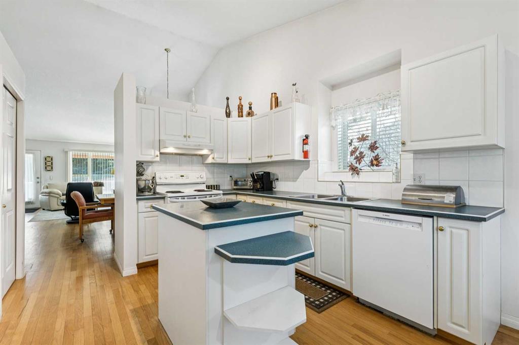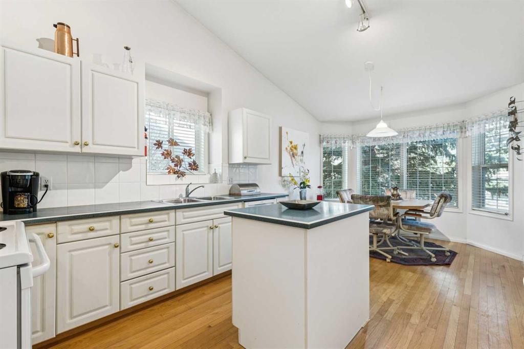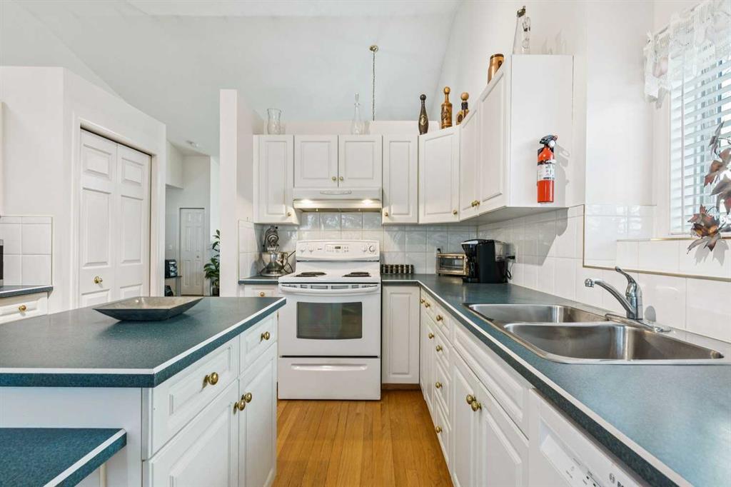 OPEN HOUSE SATURDAY JAN 24, 2-4PM. JUST LISTED in PATTERSON! Fully finished 4 bedroom, 3 bathroom, END UNIT BUNGALOW in “Prominence Hills”! QUIET AMAZING LOCATION with NO NEIGHBOURS BEHIND, SUNNY SOUTHWEST facing backyard, right across the street from the OFF-LEASH PARK, and QUICK ACCESS TO OLD BANFF COACH ROAD! Open floor plan with HIGH VAULTED CEILINGS, white kitchen cabinets & island, PANTRY, HARDWOOD FLOORING, GAS FIREPLACE, good sized dining areas, and more! Large primary bedroom with 4 PCE bathroom ensuite, standing shower, corner tub, and walk-in closet. There is also a 2nd main floor bedroom and full bathroom for added convenience. The lower level is fully finished, has a wide open recreation area, large windows, 2 additional bedrooms with huge closet space, a full bath, and laundry. So many extras in this home - DOUBLE ATTACHED GARAGE, bay windows in the kitchen nook, master bedroom, and dining room. Maintenance free SW facing private deck with power awning, knockdown ceiling texture, large mechanical room for storage, underground sprinklers, and more. LOW CONDO FEES include clubhouse with games room and kitchen! Request your showing today as this property is priced to sell at $599,900 and will not last long!