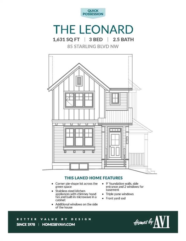 SET ON A RARE WEDGE-SHAPED CORNER LOT, this Leonard by Homes by Avi benefits from SPACE, EXPOSURE, AND LIGHT that most rear-laned homes simply don’t get. That extra breathing room is exactly why this home features a true side entry with a COVERED PORCH — not squeezed in, not symbolic, but designed because the lot allows it. The result is a SEPARATE BASEMENT ENTRANCE that feels intentional and usable, not like a workaround. That same corner exposure pulls NATURAL LIGHT into the stairwell and upper bonus room, creating brightness and openness in places that are often overlooked — a mindset that doesn’t stop at the front door. Built as an OPEN-SKY COMMUNITY, Starling is designed with stargazing in mind, using intentional lighting and pathways that stay safely illuminated without excess energy use. PARKS AND GREEN SPACES are woven naturally throughout, giving the neighbourhood room to breathe. It’s peaceful in a way you don’t expect. Back inside, the layout stays efficient and livable. Upstairs, three bedrooms are joined by a CENTRAL BONUS ROOM and upper laundry that keep daily routines streamlined and connected. On the main floor, a BREAKFAST BAR KITCHEN anchors the space, while a POCKET OFFICE adds quiet flexibility without sacrificing flow — ideal for work, homework, or daily admin. Downstairs, the unfinished basement offers meaningful future flexibility with separate access and bathroom rough-ins, ready to evolve on your timeline. REAR LANE ACCESS AND A PARKING PAD preserve yard space — which matters when the lot itself is a STANDOUT. This is a first-time buyer-friendly home that doesn’t feel constrained, because the lot, light, and layout were allowed to do more. CALL YOUR AGENT. BOOK A SHOWING. And see how different it feels when the land actually works with the house. • PLEASE NOTE: Photos are of a DIFFERENT Spec Home of the same model – fit and finish may differ. Interior selections and floorplans shown in photos. Kitchen appliances are included & will be installed by possession.