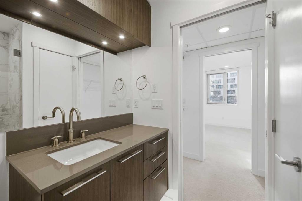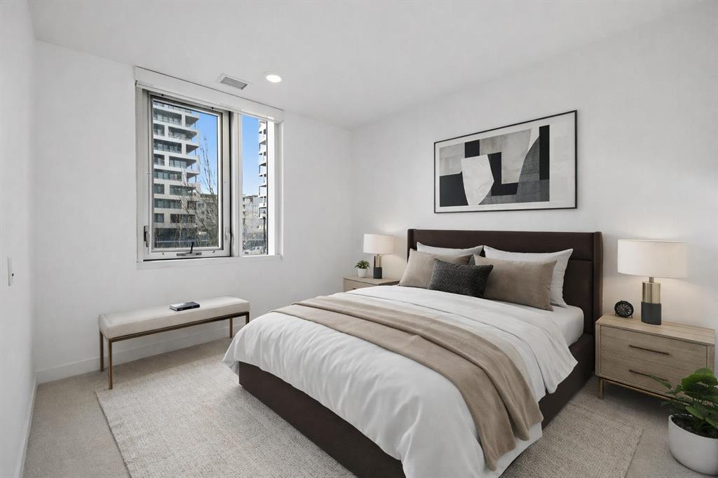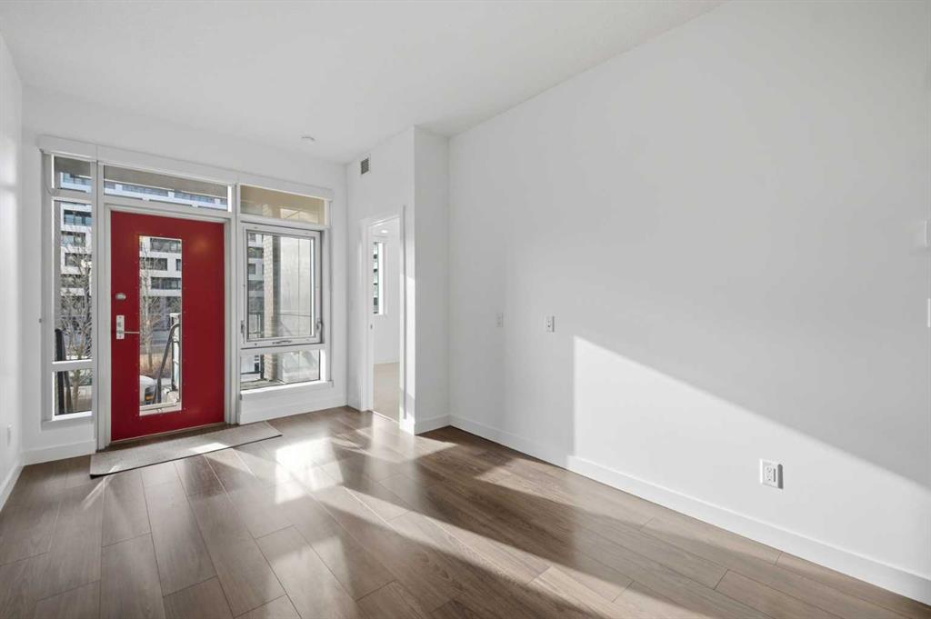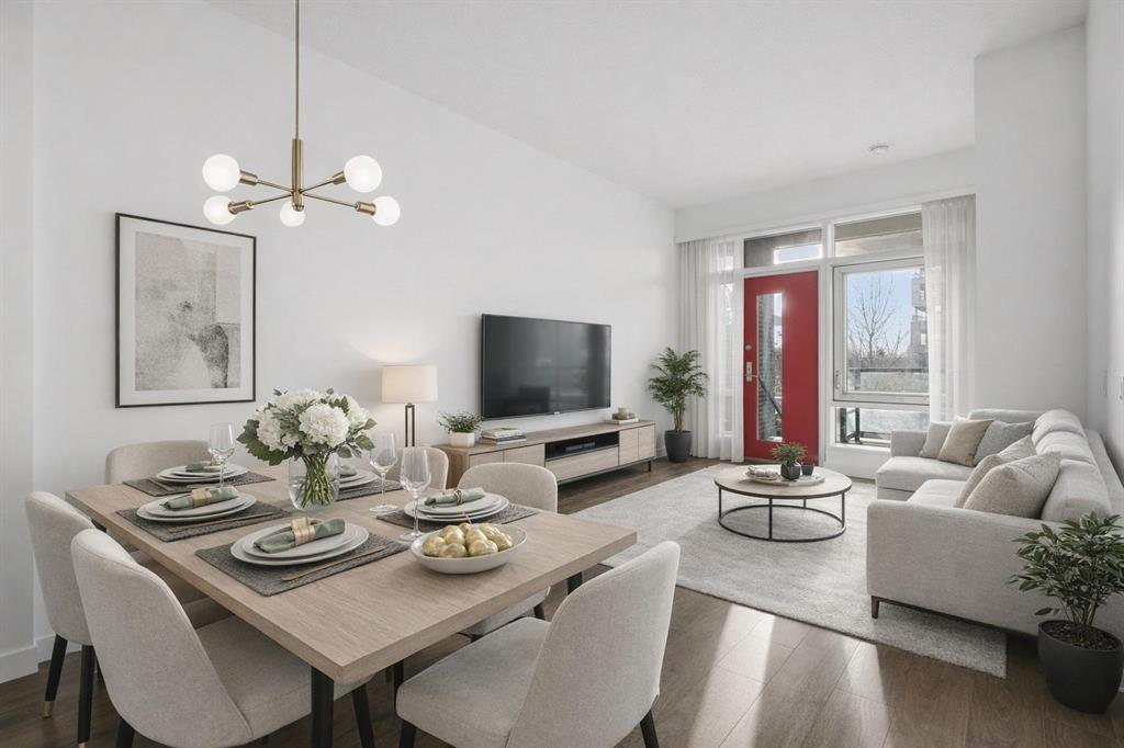 **OPEN HOUSE 1-3 PM SUNDAY 1ST FEB** This GROUND-FLOOR TWO BEDROOM, TWO BATHROOM home offers a rare layout with a PRIVATE EXTERIOR ENTRANCE. Inside, the layout is OPEN AND FUNCTIONAL, with LARGE WINDOWS bringing in steady natural light throughout the day. The living and dining areas connect directly to TWO SPACIOUS PATIOS, providing excellent outdoor space for daily use, entertaining, or pets. The KITCHEN is clean and modern with STREAMLINED CABINETRY, CONTEMPORARY FINISHES, and a FULL-WIDTH ISLAND that works well for meals and gathering. The PRIMARY BEDROOM includes a WALK-THROUGH CLOSET leading to a private ENSUITE BATHROOM. The SECOND BEDROOM features a BUILT-IN MURPHY BED, allowing the room to function comfortably as a bedroom, office, or flex space. Additional features include IN-SUITE LAUNDRY, AIR CONDITIONING, an OVERSIZED CORNER TITLED UNDERGROUND PARKING STALL , SEPARATE STORAGE LOCKER, and SECURE BIKE STORAGE. The building offers a wide range of shared amenities, including TWO FITNESS ROOMS, YOGA STUDIO, SPIN STUDIO, ROOFTOP PATIO, CAR WASH, and DOG WASH STATION. Gyms located on Floors 1 and 3; yoga and spin studios on Floors 4 and 5; bike storage, storage locker, and dog wash on P1; parking on P2. Located in BRIDGELAND, the property is within walking distance to RESTAURANTS, COFFEE SHOPS, GROCERY STORES, PARKS, and the C-TRAIN STATION, offering practical access to daily amenities and transit. Well suited for OWNER OCCUPIERS OR INVESTORS seeking a low maintenance property with strong functionality and location.