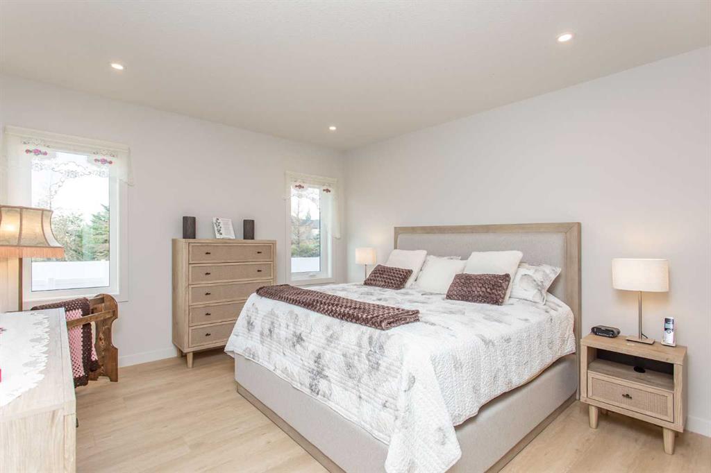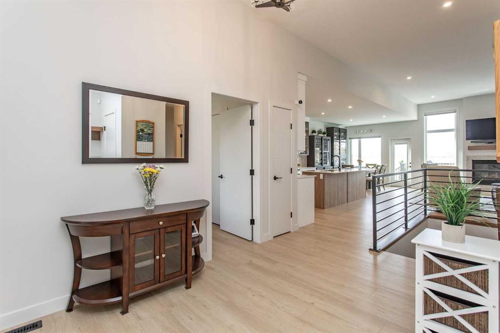 Explore this exquisite and spacious executive bungalow, featuring a three-car garage crafted by True-Line Homes. This residence showcases a unique layout that the builder has designed for the first time. Situated in the picturesque Evergreen neighborhood, this beautiful home presents an expansive open floor plan with soaring 11-foot ceilings and an abundance of south-facing windows, flooding the interior with natural light. As you step through the front door into the generous foyer, you'll immediately notice its convenient dual access with the entrance to the garage. This intelligently designed space includes a large foyer, a spacious closet, and custom shelving. The modern chef's kitchen is a culinary delight, boasting high-end appliances, ample cabinet and countertop space, and an impressive 8.5-foot island. Luxurious finishes include Quartz countertops, a Franke peak undermount granite double bowl sink, and a walk-in pantry with custom shelving for abundant storage. Attention to detail shines through with a custom wood range hood stained to match the island and stylish glass cabinet shelving. On the main floor, there's a versatile den currently utilized as an office, which could easily serve as a fourth bedroom. The spacious primary suite features a five-piece ensuite and a generously sized custom walk-in closet, expertly designed by Canadian Closet. An additional highlight is the expansive laundry room equipped with custom cabinetry and countertops, along with a pass-through window from the walk-in closet. This laundry space houses the LG 6.0 cu. ft. mega capacity Wi-Fi enabled front-load washer with the LG Sidekick mini washer in the pedestal along with a matching 9.0 cu. ft. dryer. Lastly, a two-piece powder room completes the main level. Descend the extra-wide stairs to the cozy family room, equipped with in-floor heating, ideal for movie nights or family game sessions. This level also includes two spacious bedrooms and a full four-piece bathroom, all enjoying the comfort of in-floor heating. The large storage area features durable painted floors, offering potential for an additional bedroom. This home boasts numerous upgrades, including a low-maintenance front verandah and a 10' x 18' back deck, central air conditioning, a water softener system, SunStop Low E argon-filled windows, and a fully finished heated triple garage with an epoxy-coated floor and two dry sumps. Custom Hunter Douglas blinds are fitted throughout, with motorized options in the living room, office, and primary bedroom. The professionally landscaped front and back yards feature stone elements and raised flower beds, enhancing the home's curb appeal. The Evergreen neighborhood offers extensive multi-use trails connecting to Red Deer’s extensive trail system, as well as two ponds with unique bridges and large playground and park facilities. Come and discover the elegance and comfort this remarkable property has to offer!