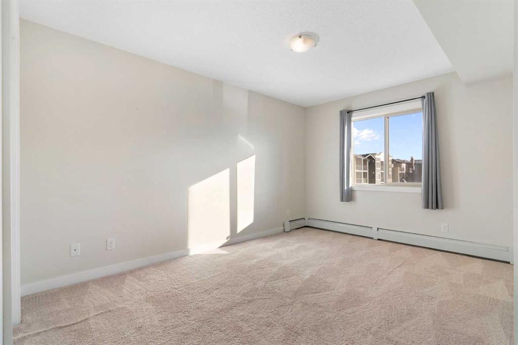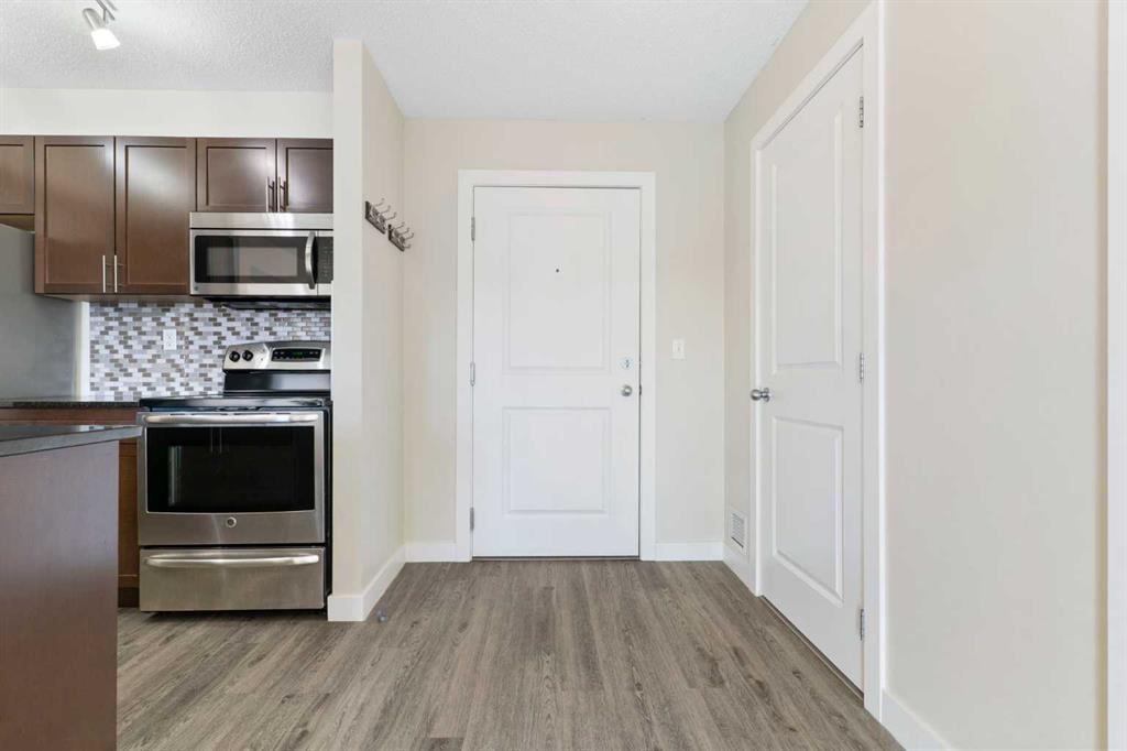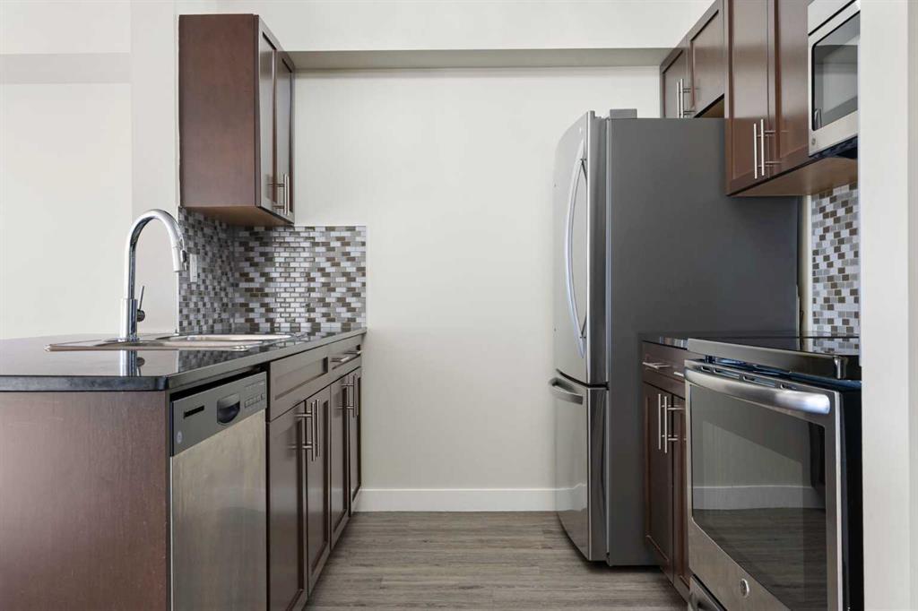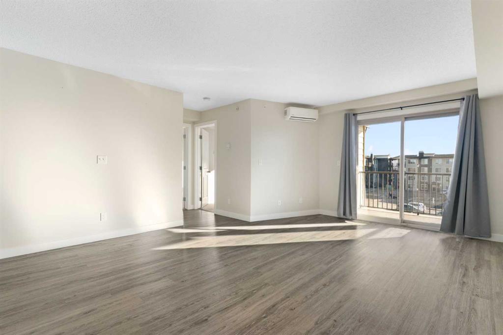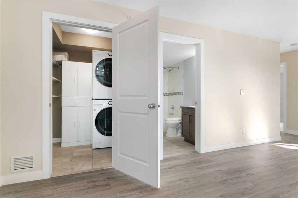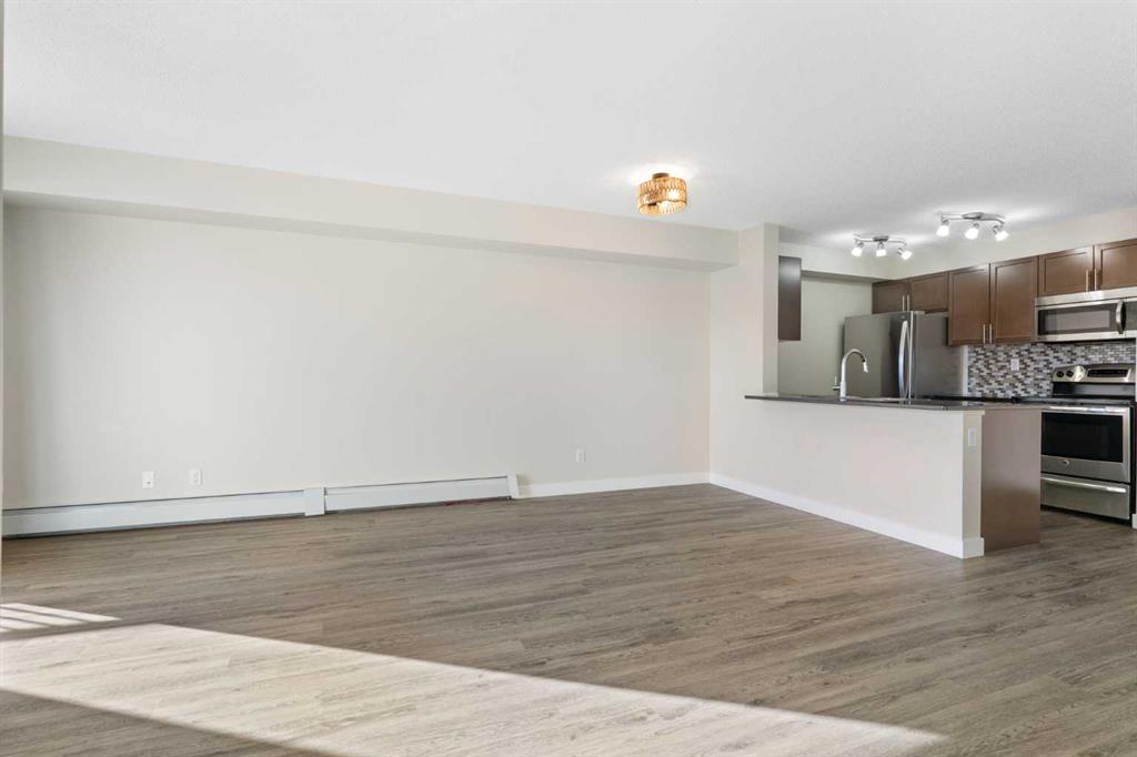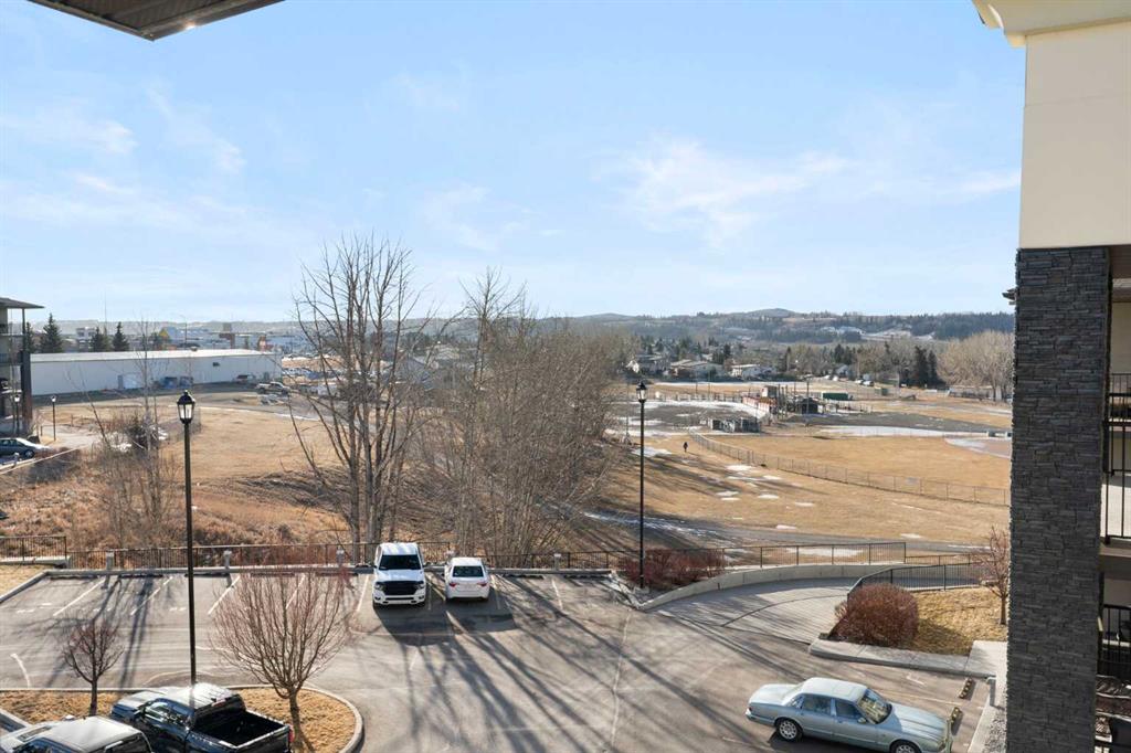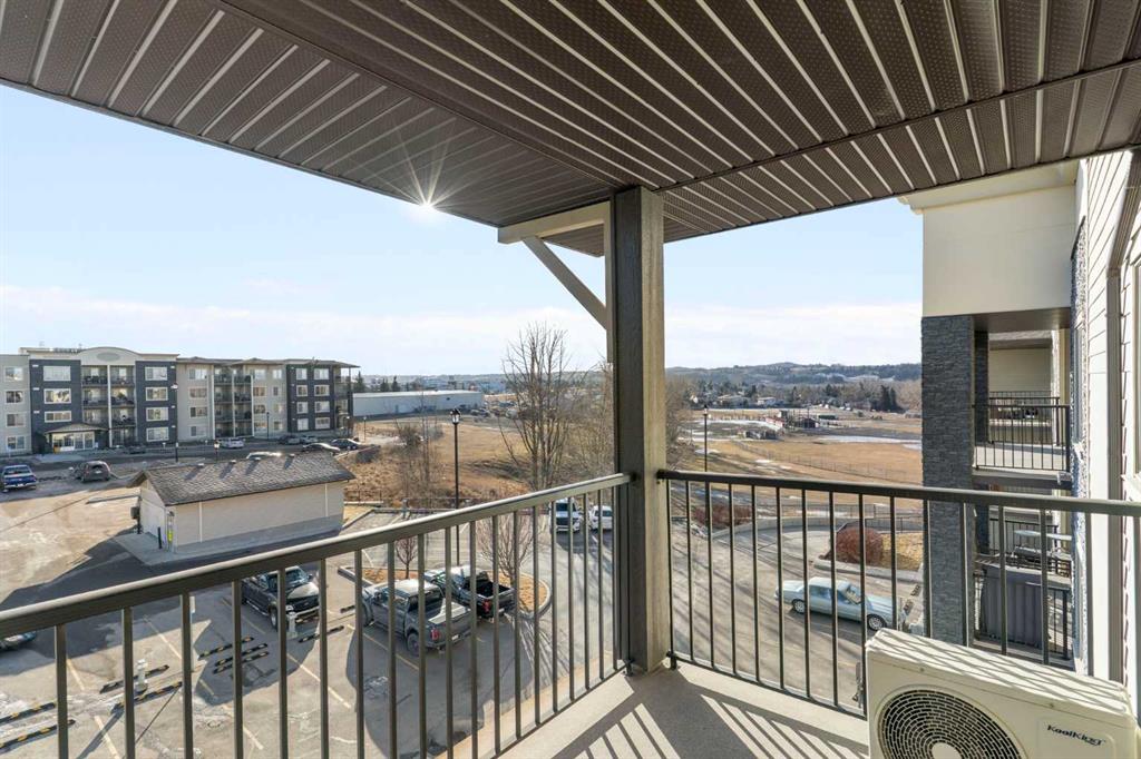 Top Floor | 2 Beds | 2 Baths | Air Conditioned | U/G Storage | 2 Surface Parking Stalls | Pets ok | Experience top-floor living with amazing panoramic views in this beautiful, air-conditioned unit at Glenbow Landing. This meticulously maintained home features a fabulous open layout enhanced by durable vinyl plank flooring. The chef-inspired kitchen offers granite countertops, a breakfast bar, stainless steel appliances, and abundant prep space. It flows seamlessly into a dining area large enough for a substantial table and a bright, inviting living room. Step through the sliding glass doors to your private balcony to take in the scenery. The primary retreat easily accommodates a king-size set and boasts a 4-piece ensuite with granite finishes. A generously sized second bedroom and another full 4-piece bathroom (also with granite) make this unit perfect for guests or a home office. For added convenience, the dedicated laundry room offers significant in-suite storage. Value-added bonuses: Two side-by-side parking stalls (with plug-ins). A massive titled storage room in the underground garage. Pet-friendly (1 dog under 15kg or 2 cats, subject to approval). Book your showing today to see why Living in Cochrane is Loving where you Live."