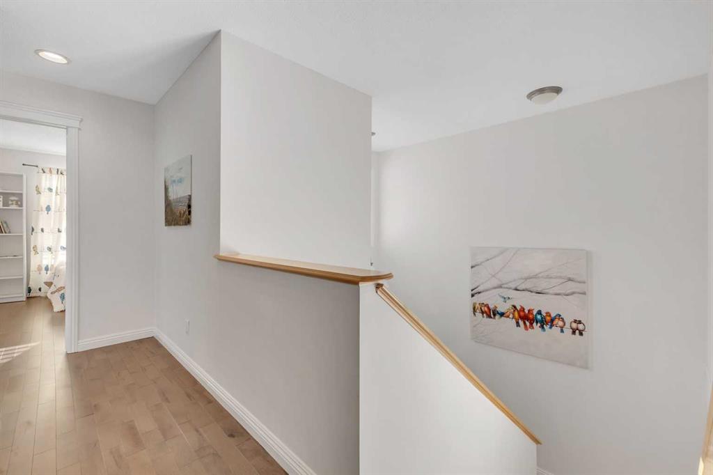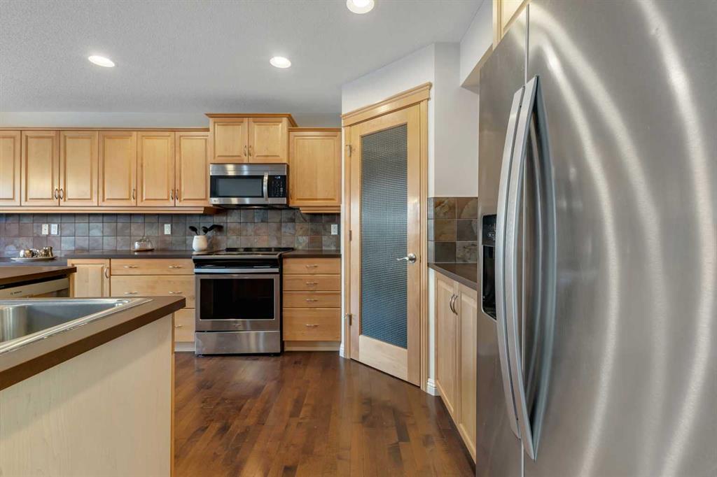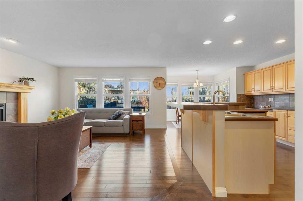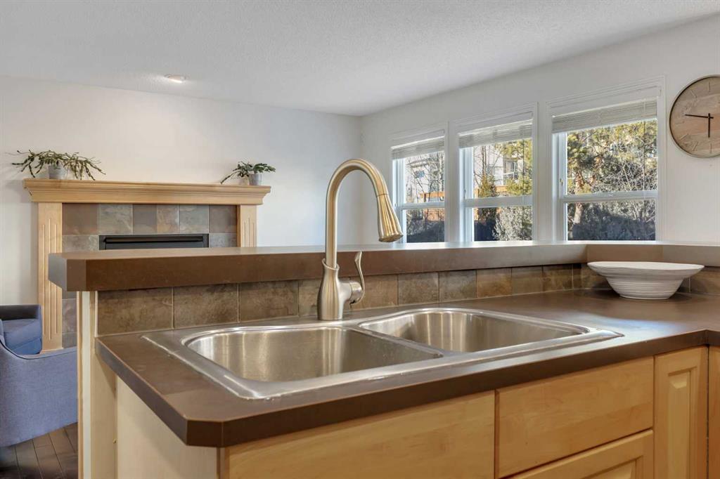Open House Sunday Feb. 1st 1-3:30 pm . Cochrane's popular Sunset Ridge has green spaces, walking paths, ravines, schools, shopping & more. This beautiful 2 Storey is close to Cochrane Ranch House, Sunset Pond, Sunset Park & St. Timothy Jr/Sr school. Stepping inside the home you will see natural light throughout. Tastefully remodeled, all 3 levels flow nicely with same color tones & design. The main floor flex room is the first room you see when you enter. Great space for home office, dining room, or sitting area. By garage entrance, leading from the laundry, there are 10 coat hooks for your family. The laundry room has stackable washer/dryer, counter space, broom closet & extra cabinets. Walking into the kitchen & family room area will impress you, all the counter space, kitchen island, work area etc. Kitchen has 9 drawers, 8 double cabinets, 3 single door cabinets & 1 corner cabinet. Corner pantry has 4 levels of wire racks. A great kitchen for the cook & baker. One area of the cabinets has a bit lower counter, where you can put a couple chairs. The kitchen nook is bright with a door(glass insert)leading to the back yard.The other 2 walls have double height windows, again natural light. Watch kids play in the yard while having your coffee or cooking. The island has plenty of room to fit 5 stools. If you are the family that gravitates to the kitchen, you will love this kitchen. Front room is adjacent to the kitchen. The gas fireplace has wooden moldings around the fireplace & rich brown toned tile, matching the kitchen backsplash. One side of family room looks to the back yard through the same size of windows the kitchen nook has. Soft colored walls, lighter colored wooden cabinets in the kitchen & around the fireplace, rich brown counter tops & dark hardwood floors, this home is tastefully renovated. Going up the stairs to the bedrooms, you are greeted with light flowing in from very high south facing windows. Newer light beige carpet in on the stairs. Where there is carpet, it is all the same. Reaching the top of the stairs, to the right you have a 4 piece main bath, large towel cabinet in bathroom behind the door, medicine cabinet on the wall by sink, toilet & tub/shower. All colors flow with the main level. 2 bedrooms face the front of the home. One has a walk in closet, the other has a regular closet. To the left of the stairs are 2 other large bedrooms, one the master & a 4th bedroom! The 5 pce. ensuite is very spacious with separate shower & a tile seat by the large soaker tub.The large walk in closet in the master bedroom has ample hanging & shelving space. Going to the basement we see a huge bright family room, an area for a gym or pool table & a built in play house. There is rough in for a bathroom & a storage area. The double attached garage is drywalled & has upper cabinets & work bench's. At the side of the home is a small storage shed. The fenced back yard has a deck & patio stones. A perfect yard for the kids & adults to play.