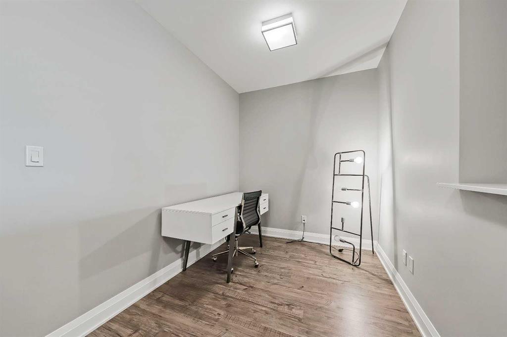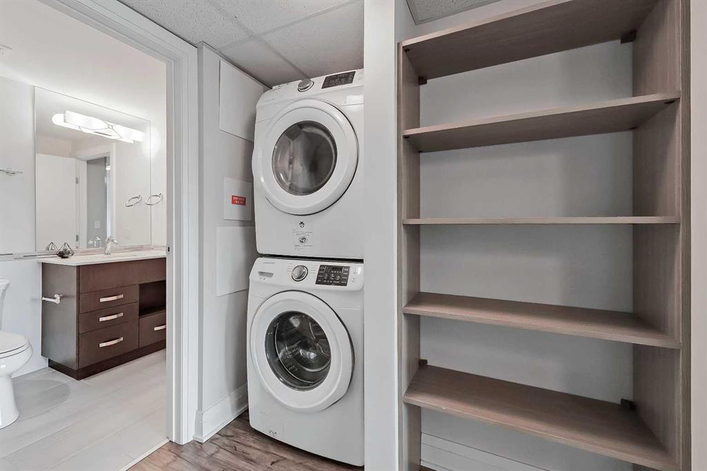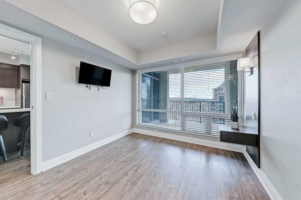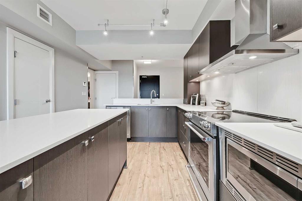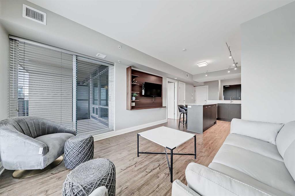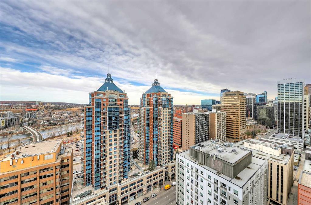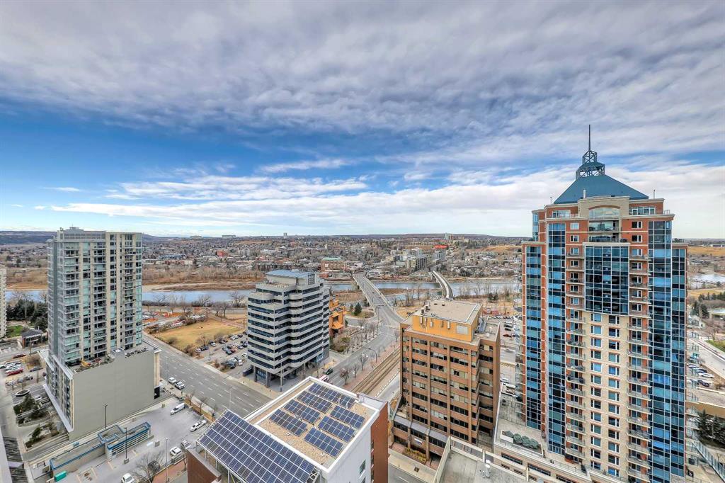 *VISIT MULTIMEDIA LINK FOR FULL DETAILS, INCLUDING IMMERSIVE 3D TOUR & FLOORPLANS!* This bright NORTH-facing 1-bed + den unit with stunning PANORAMIC RIVER VIEWS from the 22nd floor in the upscale Vogue building is a must-see! There are only 4 upgraded floors in the Vogue building, which were specially customized for Bedouin Suites, and this is one of them! EXCLUSIVE BEDOUIN FEATURES include upgraded hallways and common areas, as well as INCREDIBLE UNIT UPGRADES like custom kitchen islands with bar seating, upgraded appliances & lighting including dimmers throughout, custom bedroom panelling including built-in side tables with convenience plugs, upgraded bathrooms with tile wainscoting and glass shower doors, built-in walnut entertainment units, a Smart Sensor energy management system for the eco-minded buyer and MORE! This customized ‘VARSITY’ floorplan also had a kitchen wall removed for improved flow and natural light, and WOW, does it look good! This condo presents modern living at its finest, including an open-concept layout filled with natural light through ample floor-to-ceiling windows, complemented by luxury vinyl plank flooring adorning the main living spaces. The modern kitchen boasts wood-grain cabinets with modern hardware and under-cabinet lighting, a specially designed central island with quartz counters, a tile backsplash, a dual-basin undermount sink, and upgraded stainless steel appliances, including a chimney-style hood fan. The open main living area features a built-in walnut entertainment unit with a wall-mount TV included and access to a large balcony with a gas line for a BBQ and panoramic views of the Bow River. The bedroom features custom wall panelling with built-in side tables, wall sconce lighting and a convenient receptacle with a USB port, plus an included wall-mounted TV. A large walkthrough closet with built-in organizers and a stacked laundry leads to the 4-pc bathroom complete with occupancy-sensored lights, quartz countertops, tile wainscoting, an undermount sink with modern faucet, tile backsplash, modern vanity with storage, tile floors, and a large tub/shower combo with full height tile and an upgraded glass door. Complete with a sizeable den, a perfect home office or flex space, a titled indoor parking stall in the heated parkade and a storage locker. VOGUE is a high-end building with a ton of amenities, including central A/C, an elegant formal lobby, full-time concierge, gym, billiards, a large party room with a kitchen, a yoga studio, a Sky Lounge on the 36th floor, and multiple rooftop terraces. Surrounded by parks, transit, the LRT, shopping & more, & within walking distance to the downtown core & all Kensington shops & services – this location offers the best urban lifestyle in the Downtown Commercial Core. *Please note, the photos and the virtual tour are from the same unit, two floors up.