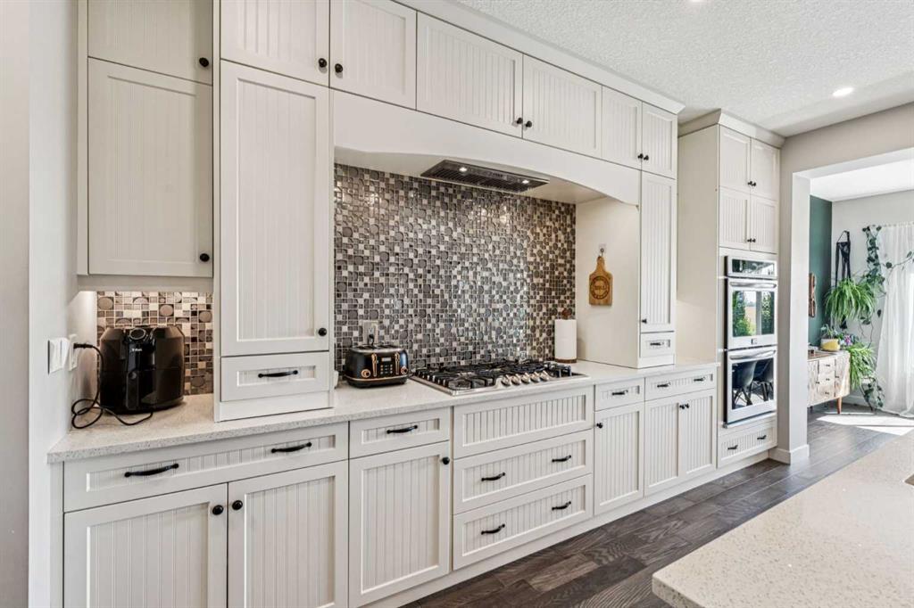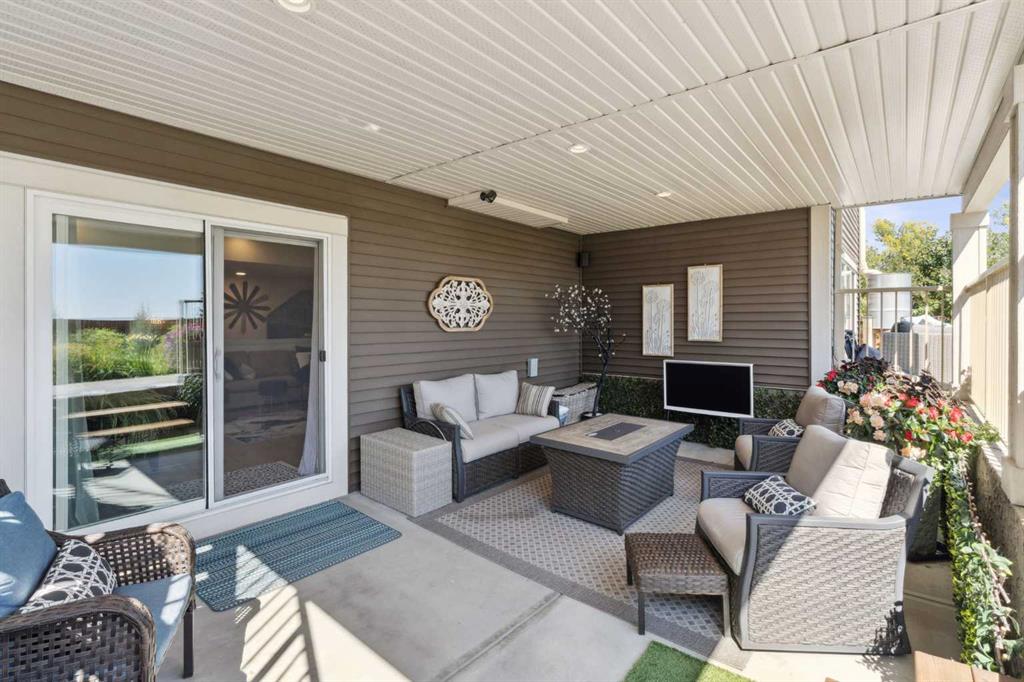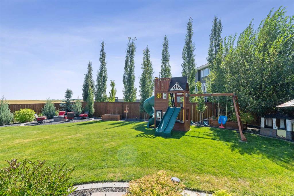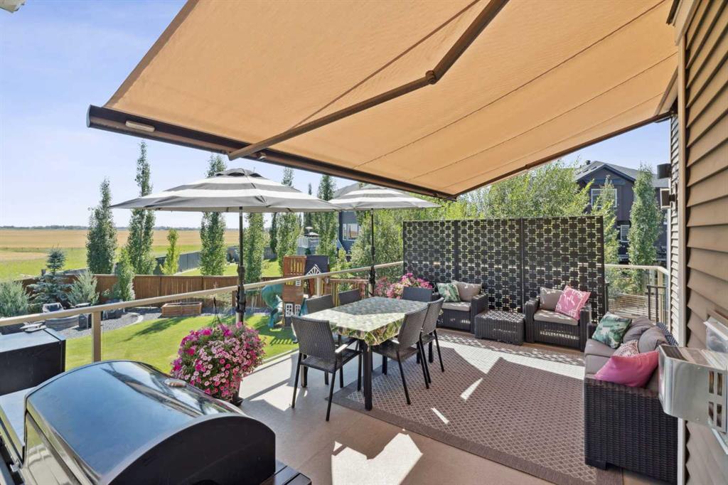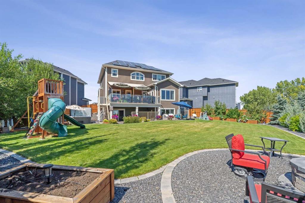 Step into this beautifully designed home through a bright and inviting foyer, featuring modern light fixtures and ample closet space—setting the stage for the sophistication found throughout this SOLAR POWERED home. Just off the main entry, you'll find a well-appointed half bath and a versatile flex room—ideal as a home office, playroom, or guest suite. The open-concept main living area is designed for both entertaining and everyday comfort. The spacious family room flows seamlessly into the dining area and showstopping kitchen, all framed by large windows that capture stunning prairie views. The gourmet kitchen features dual ovens, a 5-burner gas cooktop, sleek countertops, elegant backsplash, and ample prep and storage space. A dedicated nook offers the perfect setup for a coffee bar or extra appliances. A gas line is ready for outdoor grilling on the upper deck, which includes a retractable awning for shade and comfort. Off the kitchen, a large mudroom with custom built-ins leads to a generous 3-car garage—keeping life organized and efficient. Upstairs, you’ll find four bright and spacious bedrooms. One includes a built-in Murphy bed for added flexibility. A vaulted-ceiling bonus room provides the perfect space for movie nights, gaming, or a quiet retreat. The luxurious primary suite overlooks uninterrupted prairie views with no rear neighbors. The spa-inspired ensuite features a soaking tub, dual vanities, a large glass shower, and tile finishes. A massive walk-through closet connects directly to the upstairs laundry room for maximum convenience. The finished lower level has been extensively renovated to add a fully legalized in-law suite that expands your living space with a cozy sitting area and fireplace, a second kitchen—ideal for multi-generational living or guests—a large bedroom, and a full bathroom with custom walk-in closet. A second laundry area with stacked washer and dryer adds extra practicality. In-ceiling speakers throughout the home and outdoor areas create the perfect ambiance for entertaining. Step out onto the beautifully landscaped yard, complete with irrigation system and four raised garden beds. Five unique outdoor seating areas, including a fire pit space, make this backyard ideal for gatherings, relaxing, or play. A charming playhouse and hot tub (both negotiable) offer even more ways to enjoy this incredible outdoor retreat. This exceptional home combines thoughtful design, high-end finishes, and unmatched comfort—inside and out. Come experience the perfect blend of elegance, space, and functionality.