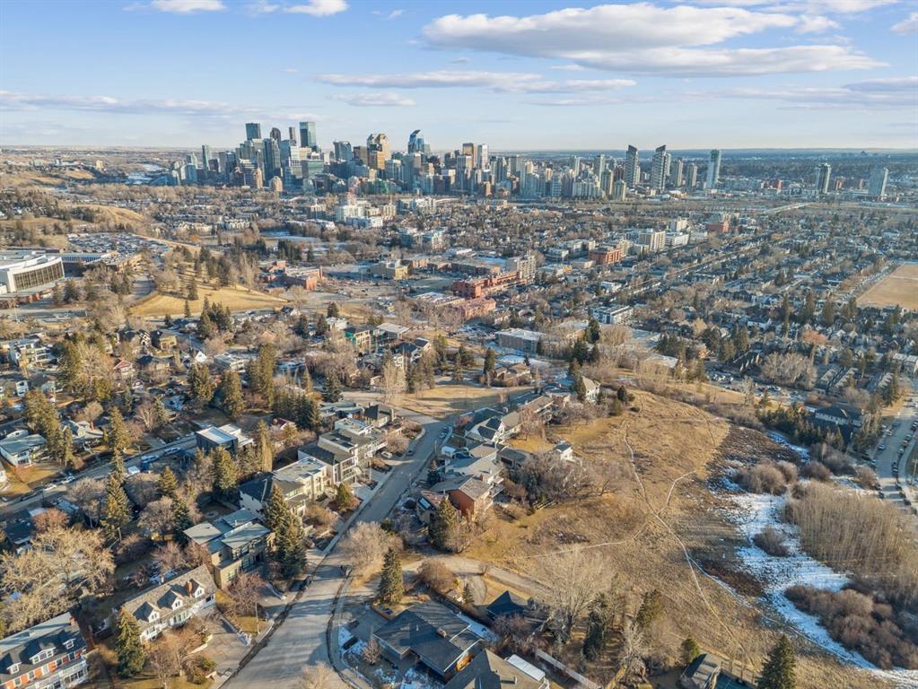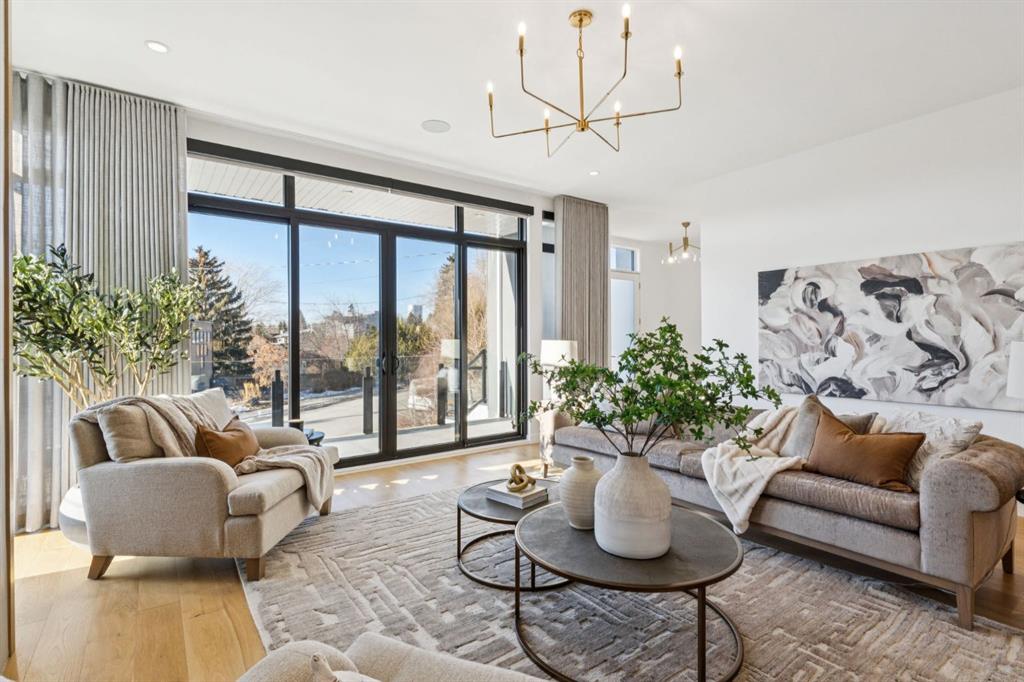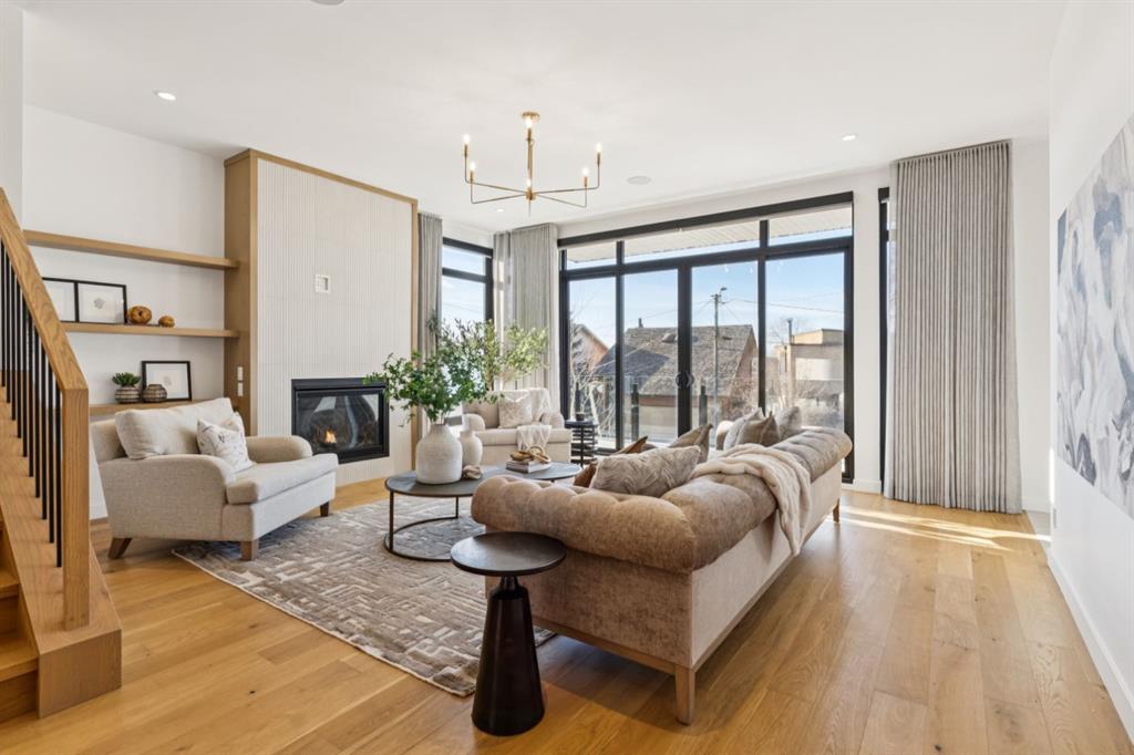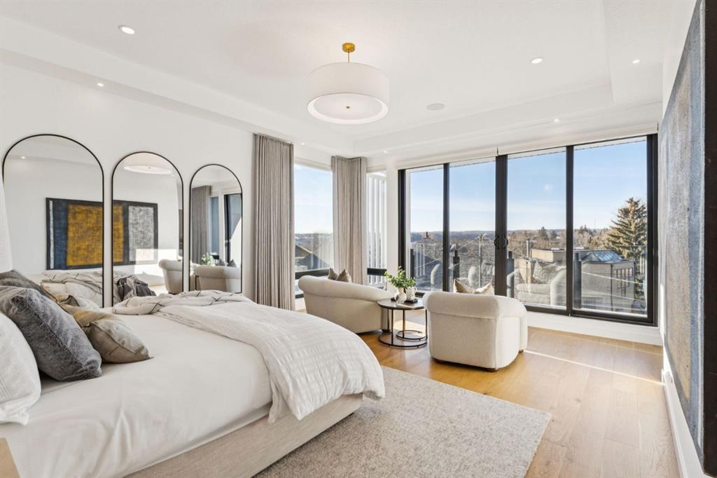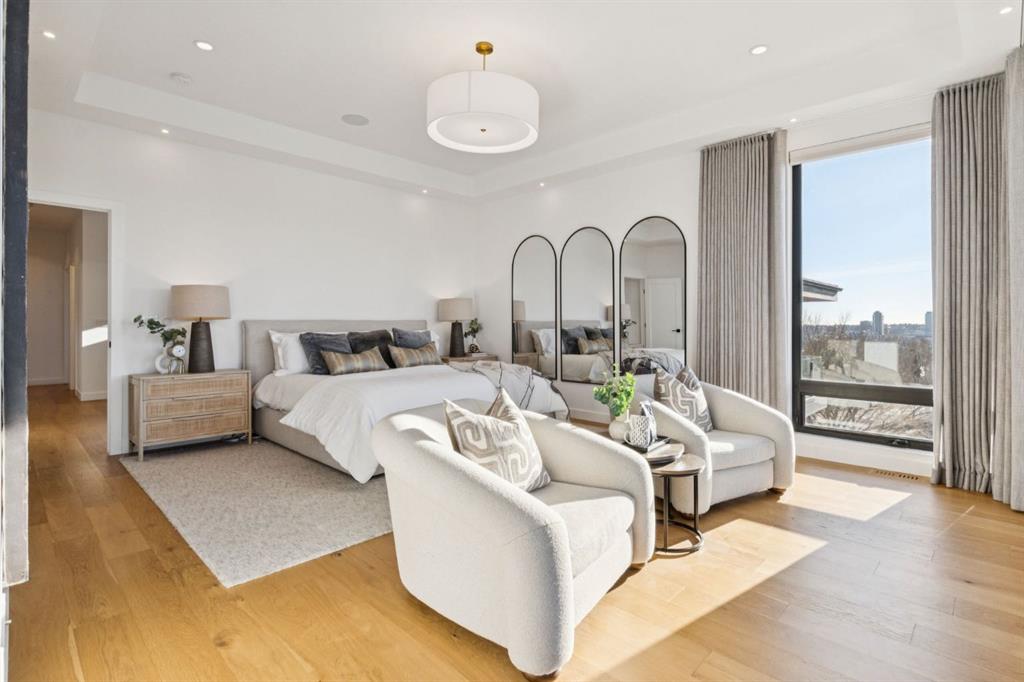 An extraordinary hillside sanctuary awaits in the exclusive inner-city community of Briar Hill. Ideally located on a peaceful street, this fabulous home offers over 4,600 square feet of contemporary living space and sweeping views of the city skyline and the Rocky Mountains. Sunlight streams through floor-to-ceiling windows, filling the open main floor all day with natural light. A heated porcelain-tiled foyer, 10 ft. ceilings, and wide-plank white oak floors throughout provide warmth and sophistication. Relax by the modern gas fireplace on quiet winter evenings with a book or connect with friends and family on the front deck. The chef’s dream kitchen features a large quartz-topped island with cabinetry on both sides, ideal for meal prep and casual dining. Premium Italian-designed Fulgor Milano appliances—including a professional 6-burner gas stove, an integrated warming drawer, and a combi speed oven—make entertaining seamless. The butler’s pantry adds functionality with an additional counter space, storage, and a wine/beverage fridge for extra convenience. Host memorable dinners in the expansive dining room, with sliding doors to a private back patio and backyard, which is perfect for BBQ's and al fresco dining in warmer months. The private office, accessible from the kitchen and backyard, is filled with morning light and offers a tranquil, creative workspace. Upstairs, the serene primary suite impresses with a 10-foot tray ceiling and a second balcony with west-facing mountain views. A cozy seating area is perfect for morning coffee, watching the city wake, and enjoying the incredible, vibrant Calgary sunsets. The luxurious ensuite has a massive double steam shower with a bench, heated floors, oversized soaker tub, dual vanities, and a large walk-in closet. Begin and end your day with relaxation and rejuvenation in the wellness room, featuring an authentic Finnish sauna with a Bluetooth sound system. Two additional bedrooms with oversized windows, spectacular city views, and walk-in closets provide comfort for family or guests. A convenient laundry room with sink and storage completes the upper level. The lower level includes a spacious rec room with a wet bar, a beverage fridge, and flex space for game tables or workouts. The entertainment area is ideal for movie nights or big game day parties. The fourth bedroom and full bath provide guests with privacy and ease. Two massive storage rooms and a large mudroom lead to the oversized 698 sq. ft. heated double garage, with even more storage or a spot for a workshop. Highlights include a Sonos home & audio system, Hunter Douglas electronic window coverings, Lutron integrative lighting, hydronic in-floor heating in the lower level and central air conditioning. Only 10 minutes from downtown, a 20-minute walk to shops and restaurants in Kensington, and steps from walking paths on the hillside. Experience luxury, comfort, and breathtaking surroundings—this is the quintessential urban lifestyle you’ve been waiting for!