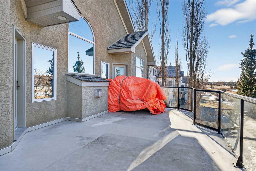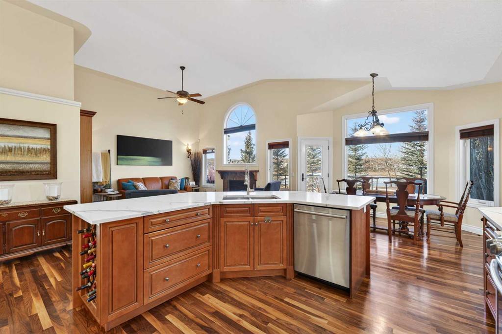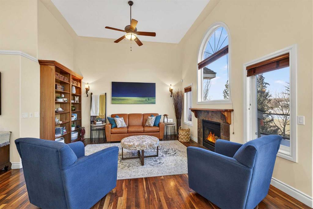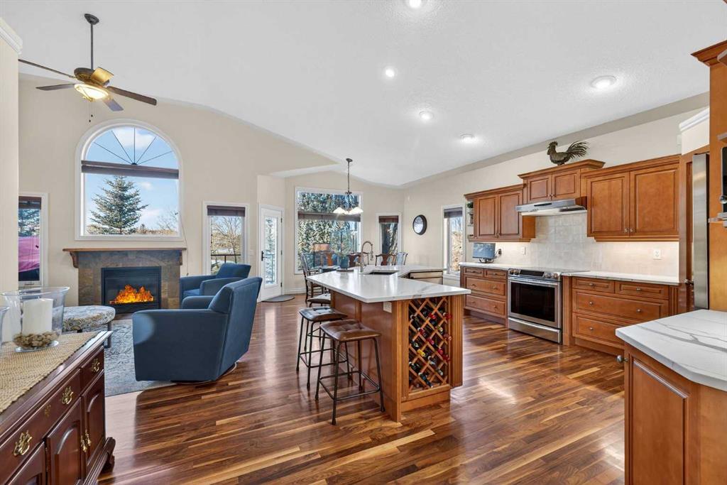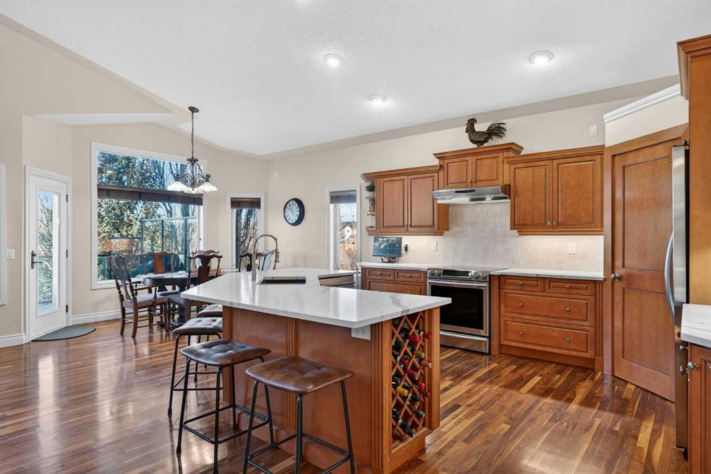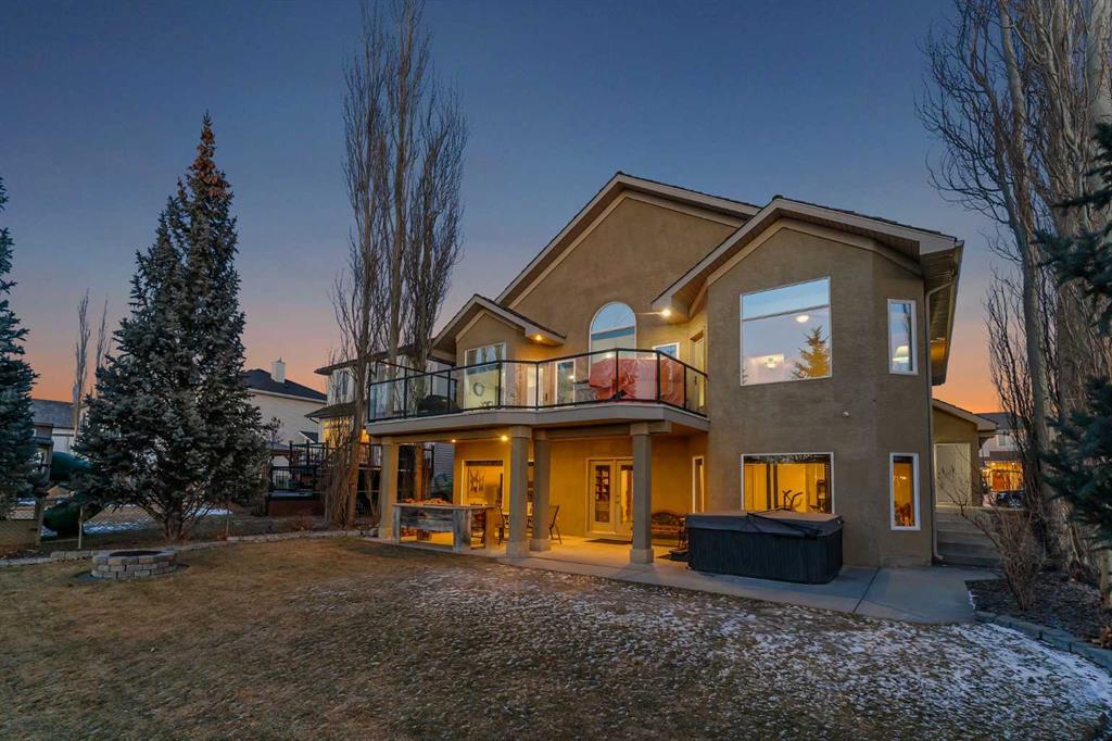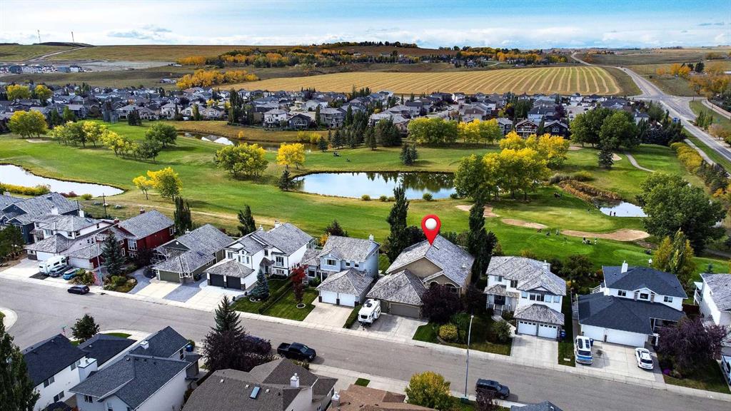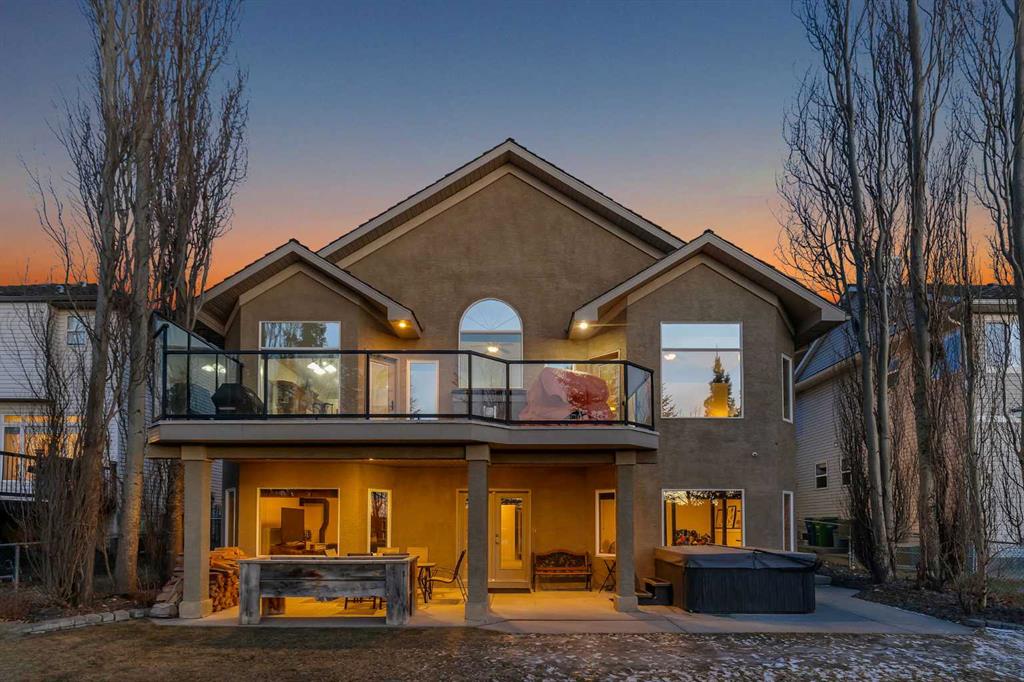 Incredible opportunity to own this gorgeous walkout home with a triple car garage backing west onto Woodside Golf Course. The inside of this home is just as beautiful as the exterior with massive windows, vaulted ceilings and rich walnut hardwood floors that highlights the exceptional space. The kitchen has been recently updated with a modern backsplash, stone counters and a central island. Be prepared to host family and friends as this open concept design creates a natural space for entertaining. Off the dining space, a door leads to a full-width deck with two natural gas outlets for a BBQ and a heater. Back inside, the spacious living room overlooks the golf course and includes a cozy gas fireplace. The primary suite is a stunning oasis with gorgeous views, plenty of space, a walk-in closet and an elegant fully updated ensuite with dual sinks and a tiled shower. A second bedroom on this level and a 4 piece bath add versatility. The walkout basement is fully finished with a large rec area for movie nights with room for a home gym too. Two additional bedrooms and a 3 piece bath complete this level. Parking will never be an issue with a triple wide driveway and a three bay HEATED garage (29'11" x 24'7") with a mezzanine and built in storage. The yard has been professionally landscaped with underground sprinklers. Watch the golfers and enjoy the sunsets from your walkout deck or from your hot tub on the patio. This home has undergone many updates including central air conditioning, two new furnaces (2023), hot water tank (2024), new washer and dryer (2025), garage doors (2023), re-modelled kitchen and bathroom (2023), solar shield on most east and west windows, water softener, built in shelving throughout and roof maintenance with 5 year warranty. This is a central Airdrie location, close to the golf course, shopping and schools.