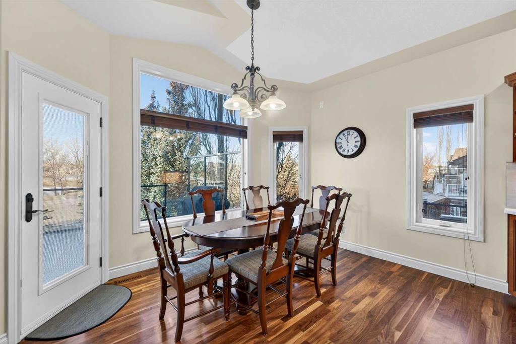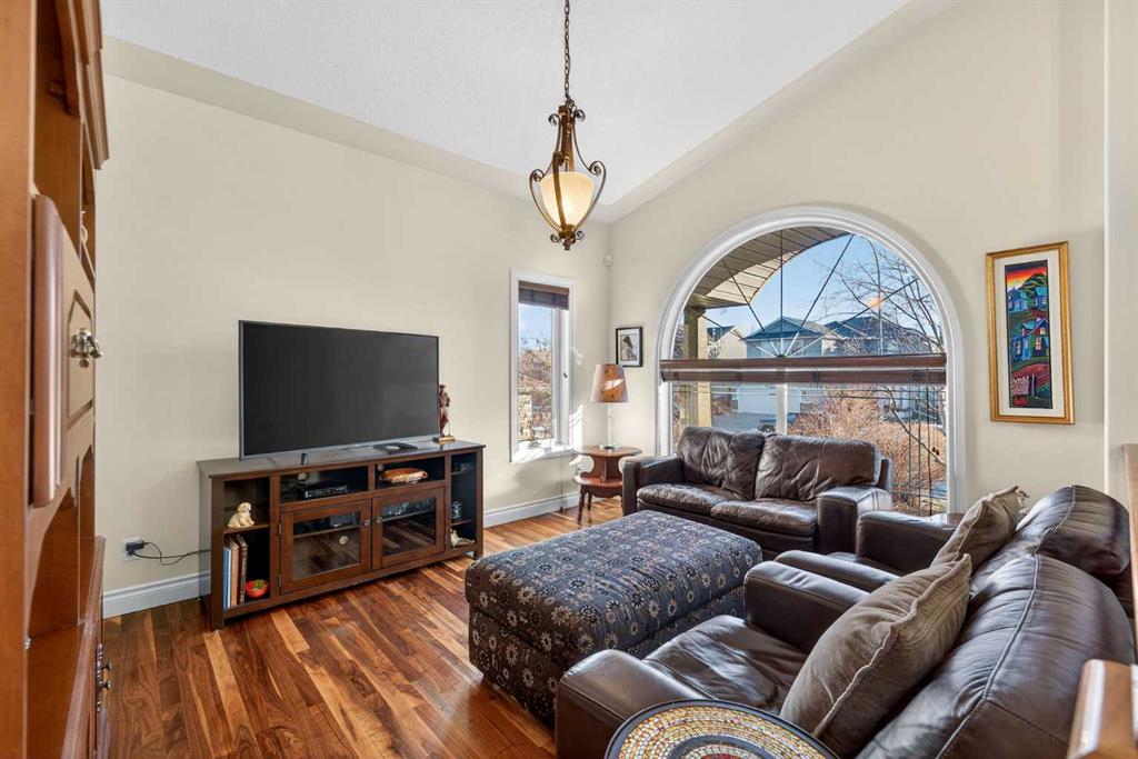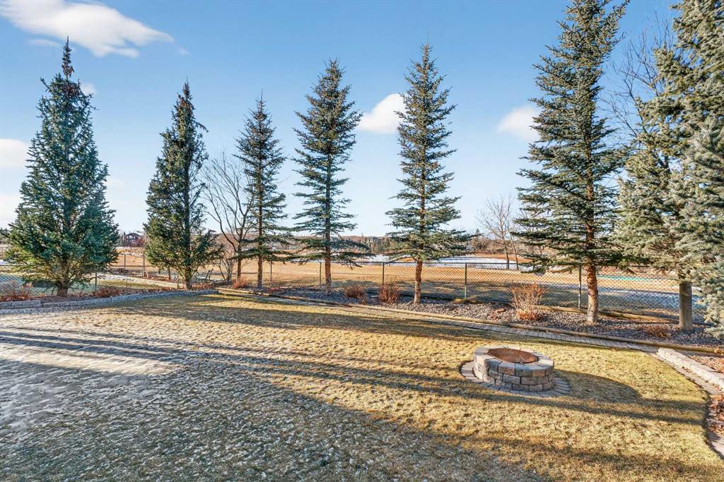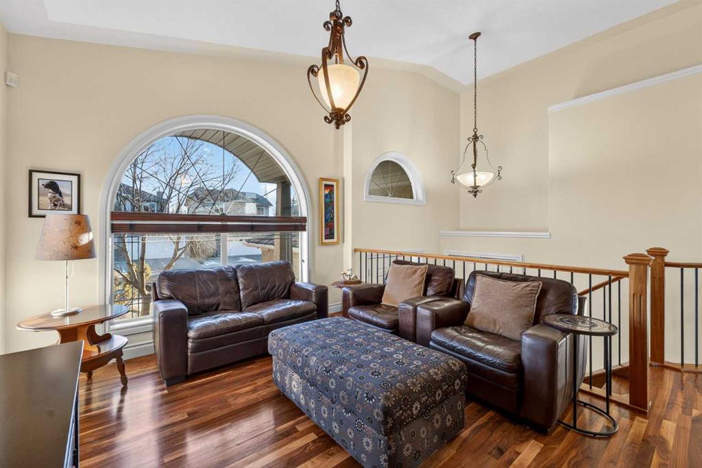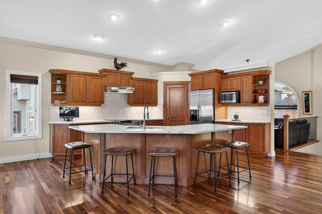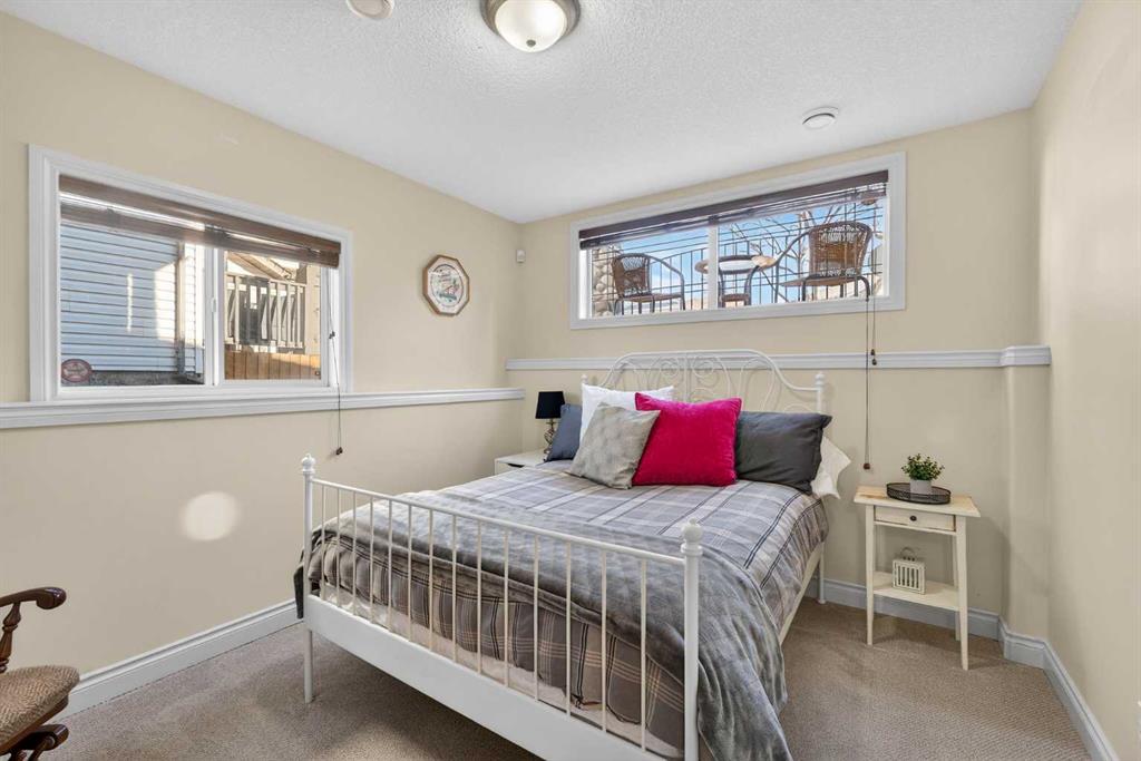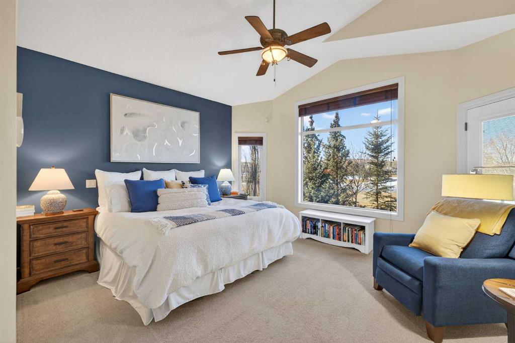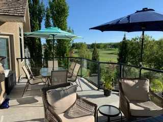 Incredible opportunity to own this gorgeous walkout home with a triple car garage backing west onto Woodside Golf Course. The inside of this home is just as beautiful as the exterior with massive windows, vaulted ceilings and rich walnut hardwood floors that highlights the exceptional space. The kitchen has been recently updated with a modern backsplash, stone counters and a central island. Be prepared to host family and friends as this open concept design creates a natural space for entertaining. Off the dining space, a door leads to a full-width deck with two natural gas outlets for a BBQ and a heater. Back inside, the spacious living room overlooks the golf course and includes a cozy gas fireplace. The primary suite is a stunning oasis with gorgeous views, plenty of space, a walk-in closet and an elegant fully updated ensuite with dual sinks and a tiled shower. A second bedroom on this level and a 4 piece bath add versatility. The walkout basement is fully finished with a large rec area for movie nights with room for a home gym too. Two additional bedrooms and a 3 piece bath complete this level. Parking will never be an issue with a triple wide driveway and a three bay HEATED garage (29'11" x 24'7") with a mezzanine and built in storage. The yard has been professionally landscaped with underground sprinklers. Watch the golfers and enjoy the sunsets from your walkout deck or from your hot tub on the patio. This home has undergone many updates including central air conditioning, two new furnaces (2023), hot water tank (2024), new washer and dryer (2025), garage doors (2023), re-modelled kitchen and bathroom (2023), solar shield on most east and west windows, water softener, built in shelving throughout and roof maintenance with 5 year warranty. This is a central Airdrie location, close to the golf course, shopping and schools.