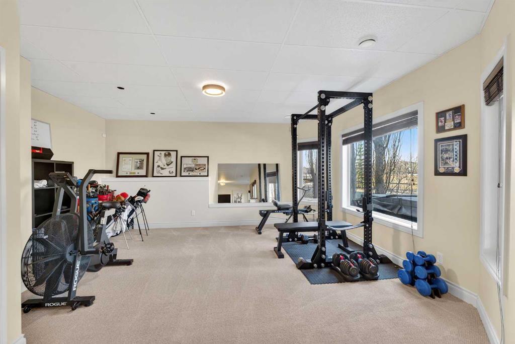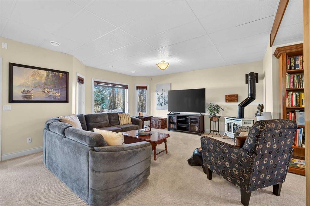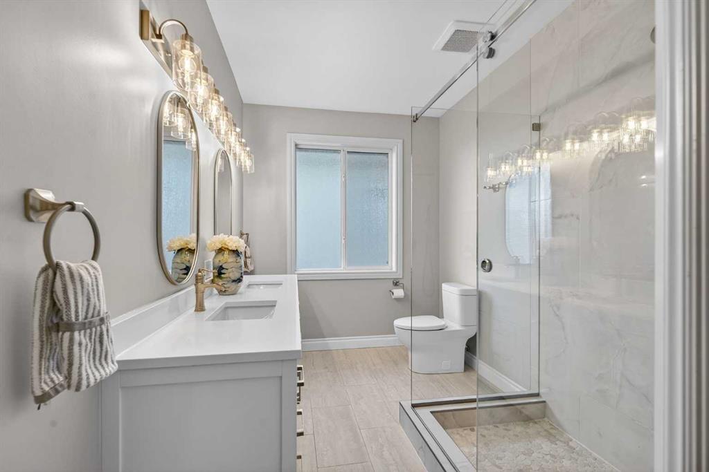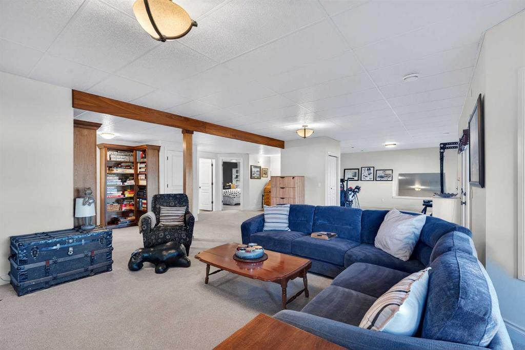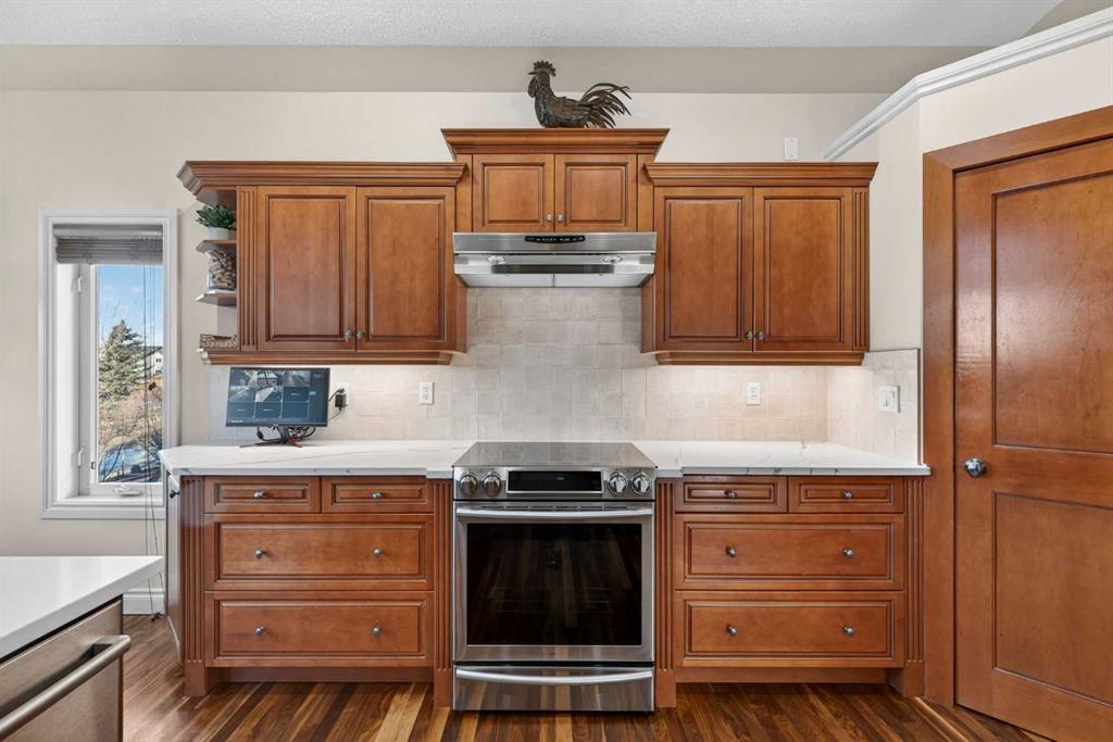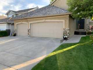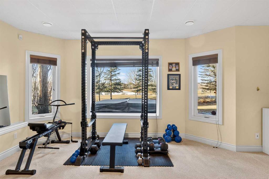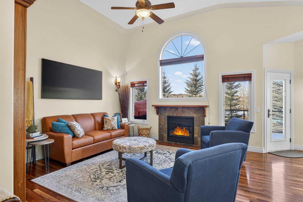 Incredible opportunity to own this gorgeous walkout home with a triple car garage backing west onto Woodside Golf Course. The inside of this home is just as beautiful as the exterior with massive windows, vaulted ceilings and rich walnut hardwood floors that highlights the exceptional space. The kitchen has been recently updated with a modern backsplash, stone counters and a central island. Be prepared to host family and friends as this open concept design creates a natural space for entertaining. Off the dining space, a door leads to a full-width deck with two natural gas outlets for a BBQ and a heater. Back inside, the spacious living room overlooks the golf course and includes a cozy gas fireplace. The primary suite is a stunning oasis with gorgeous views, plenty of space, a walk-in closet and an elegant fully updated ensuite with dual sinks and a tiled shower. A second bedroom on this level and a 4 piece bath add versatility. The walkout basement is fully finished with a large rec area for movie nights with room for a home gym too. Two additional bedrooms and a 3 piece bath complete this level. Parking will never be an issue with a triple wide driveway and a three bay HEATED garage (29'11" x 24'7") with a mezzanine and built in storage. The yard has been professionally landscaped with underground sprinklers. Watch the golfers and enjoy the sunsets from your walkout deck or from your hot tub on the patio. This home has undergone many updates including central air conditioning, two new furnaces (2023), hot water tank (2024), new washer and dryer (2025), garage doors (2023), re-modelled kitchen and bathroom (2023), solar shield on most east and west windows, water softener, built in shelving throughout and roof maintenance with 5 year warranty. This is a central Airdrie location, close to the golf course, shopping and schools.