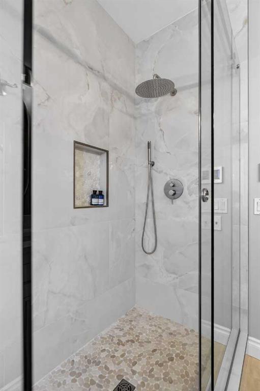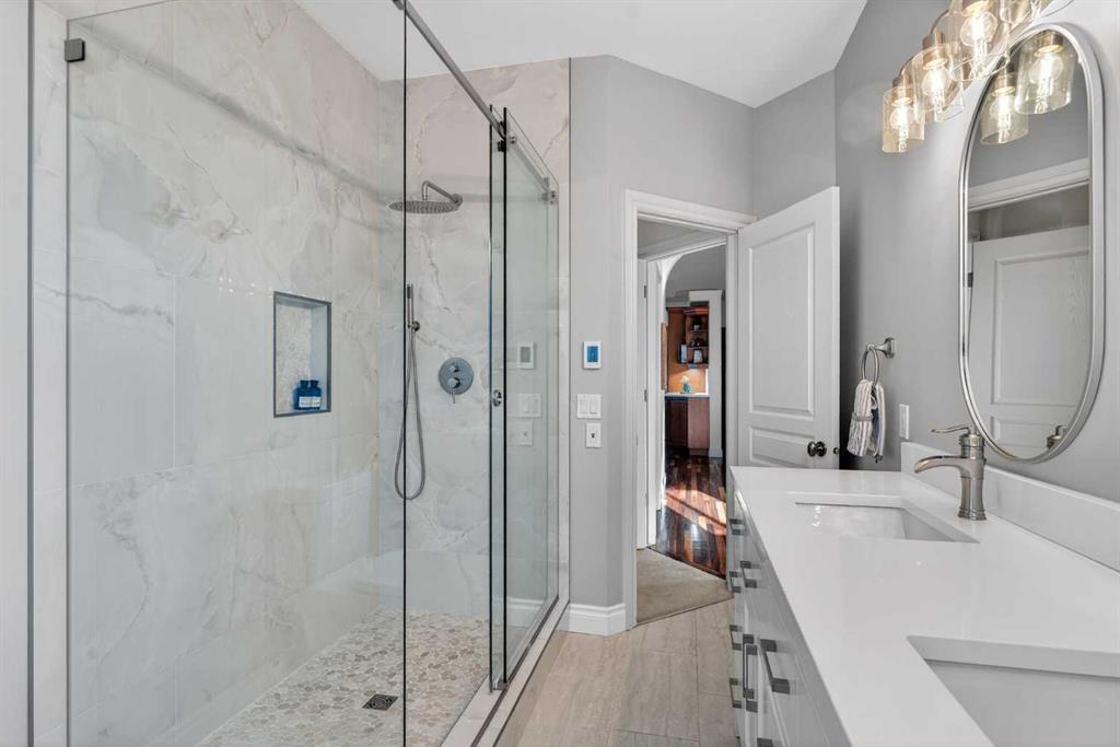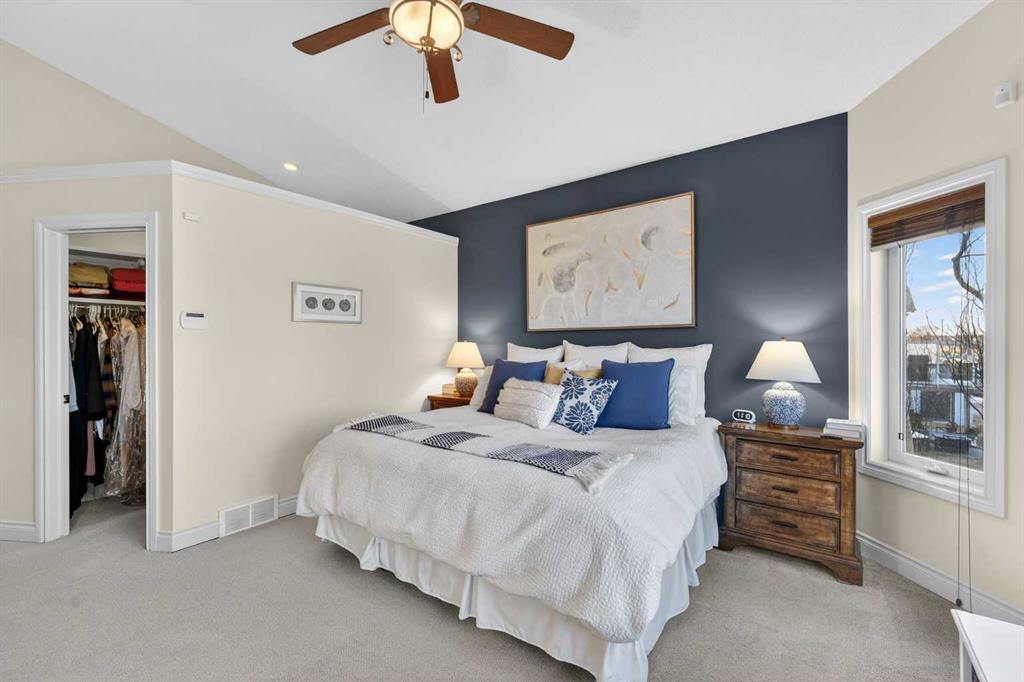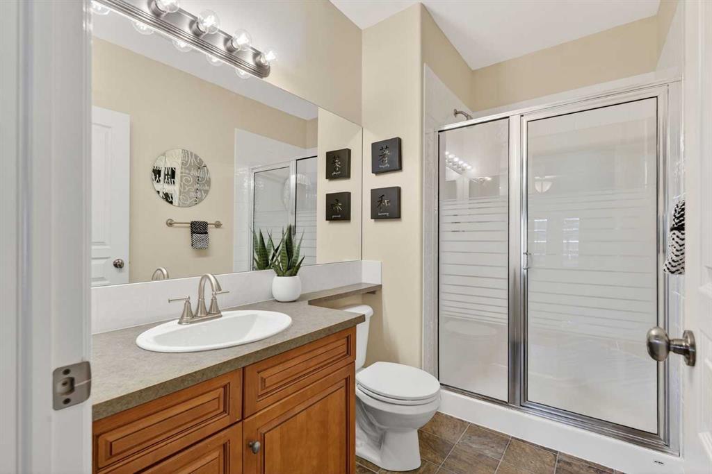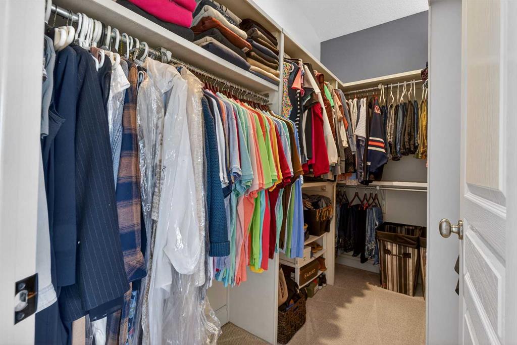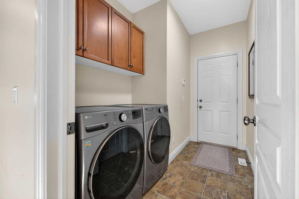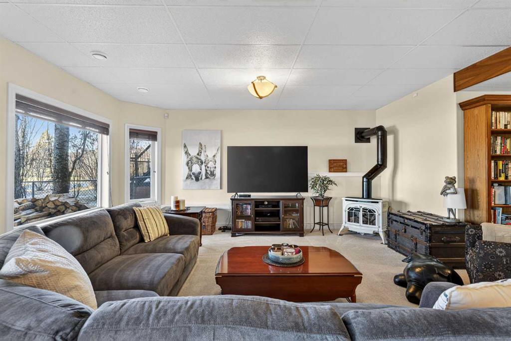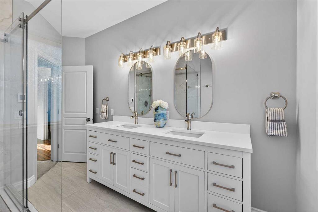 Incredible opportunity to own this gorgeous walkout home with a triple car garage backing west onto Woodside Golf Course. The inside of this home is just as beautiful as the exterior with massive windows, vaulted ceilings and rich walnut hardwood floors that highlights the exceptional space. The kitchen has been recently updated with a modern backsplash, stone counters and a central island. Be prepared to host family and friends as this open concept design creates a natural space for entertaining. Off the dining space, a door leads to a full-width deck with two natural gas outlets for a BBQ and a heater. Back inside, the spacious living room overlooks the golf course and includes a cozy gas fireplace. The primary suite is a stunning oasis with gorgeous views, plenty of space, a walk-in closet and an elegant fully updated ensuite with dual sinks and a tiled shower. A second bedroom on this level and a 4 piece bath add versatility. The walkout basement is fully finished with a large rec area for movie nights with room for a home gym too. Two additional bedrooms and a 3 piece bath complete this level. Parking will never be an issue with a triple wide driveway and a three bay HEATED garage (29'11" x 24'7") with a mezzanine and built in storage. The yard has been professionally landscaped with underground sprinklers. Watch the golfers and enjoy the sunsets from your walkout deck or from your hot tub on the patio. This home has undergone many updates including central air conditioning, two new furnaces (2023), hot water tank (2024), new washer and dryer (2025), garage doors (2023), re-modelled kitchen and bathroom (2023), solar shield on most east and west windows, water softener, built in shelving throughout and roof maintenance with 5 year warranty. This is a central Airdrie location, close to the golf course, shopping and schools.