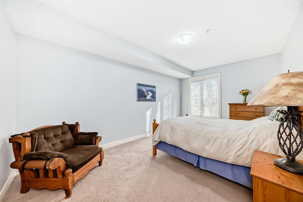 Welcome to 3104, 15 Sunset Square — a beautifully designed 2-bedroom, 2-bathroom ground-floor condo in Cochrane’s sought-after Sunset Ridge community. With 1,021 sq. ft. of stylish, comfortable living space, this home blends modern convenience with a warm, welcoming feel you’ll notice the moment you step inside. The open-concept floor plan is bright and spacious, highlighted by 9-foot knockdown ceilings and infloor heating with dual zones for year-round comfort. The kitchen is a showpiece — featuring stainless steel appliances, granite breakfast bar, and elegant pendant lighting that creates the perfect space for cooking, entertaining, or sipping your morning coffee. The huge primary bedroom feels like a private retreat, complete with a large walk-in closet and a roomy 3-piece ensuite. A second spacious bedroom sits near the 4-piece main bathroom, which includes a convenient cheater door for added privacy — ideal for guests or shared living. From the open and inviting living room, step outside to your large ground-floor patio, perfect for relaxing with friends or enjoying a quiet evening by the BBQ (gas line ready!). You’ll love the insuite laundry, and the rare convenience of two titled parking stalls — one secure space in the heated underground parkade (with storage locker) and one handy surface stall just steps from your door. Located in the heart of Sunset Ridge - this community is known for its friendly neighbours, peaceful atmosphere, and incredible amenities — enjoy nearby walking paths, parks, coffee shops, restaurants, and a neighbourhood grocery store. With Cochrane’s beautiful mountain views and the Bow River pathways just minutes away, every day feels like a breath of fresh air. Whether you’re looking to downsize, invest, or simply enjoy a low-maintenance lifestyle in a warm and welcoming setting, this stunning condo is the one you’ve been waiting for. Quick possession possible! Schedule your showing today and discover the comfort, style, and charm of life at 3104, 15 Sunset Square.