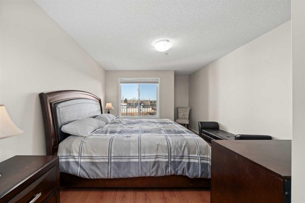 Create the simplified lifestyle of your dreams in this move-in-ready, 912 sq ft, 2-bedroom condo. From the moment you enter, the efficient and functional layout stands out. A spacious entry with coat closet and pantry leads into the kitchen, featuring ample cabinetry and counter space for cooking or ordering in. The central island with raised-bar seating is the heart of the space—perfect for casual meals or conversation. The open-concept living area offers flexibility for dining, lounging, reading, or a home office, all enhanced by large windows that flood the space with natural light and showcase expansive views. Step outside onto your private balcony—ideal for a bistro table and chairs to enjoy the day. A versatile flex room easily serves as a second bedroom, office, gym, or tv/entertainment space. Nearby is a 3-piece bathroom with convenient in-suite laundry. Tucked away for privacy, the spacious primary suite features an oversized bedroom with room for a king-sized bed, a large walk-in closet with additional storage, a second two-door closet with shelving, and a private 4-piece ensuite. This condo offers exceptional storage throughout, making it easy to keep an organized home. Fresh paint and new top-down/bottom-up window coverings complete the interior. Additional features include in-floor radiant heating and hot water on demand. The unit includes one titled heated underground parking stall and has one outdoor stall, plus ample visitor parking. Located in a well-managed, pet-friendly complex with a well-funded reserve fund. The condo fees include heat, water, snow removal, landscaping, and professional management. Conveniently close to shopping, restaurants, schools, transit, and major routes. Enjoy nearby amenities such as Bert Church Live Theatre, Genesis Place, Nose Creek Park, walking trails, and community activities. Call your favorite REALTOR® to book your showing.