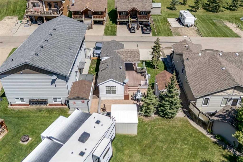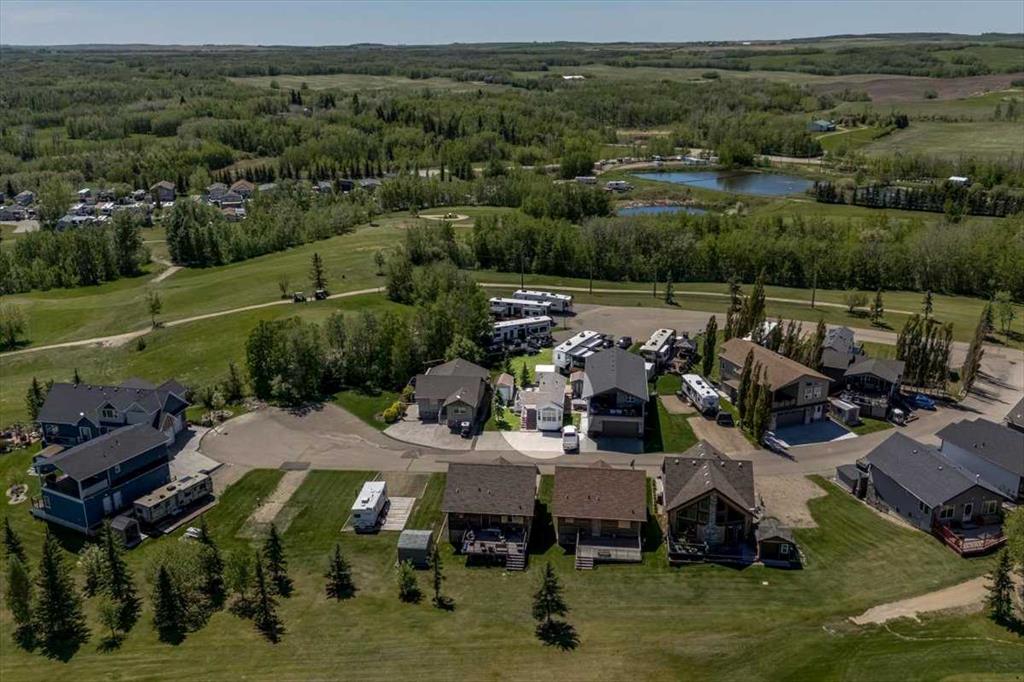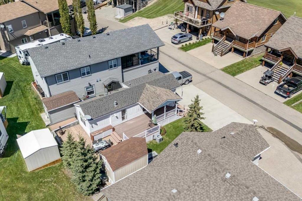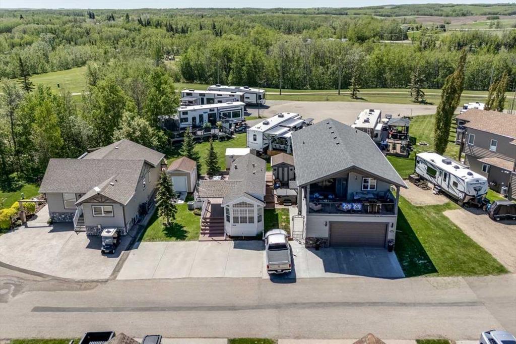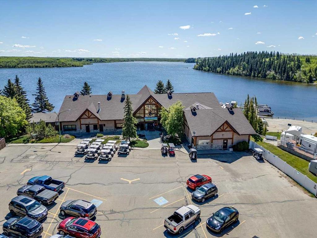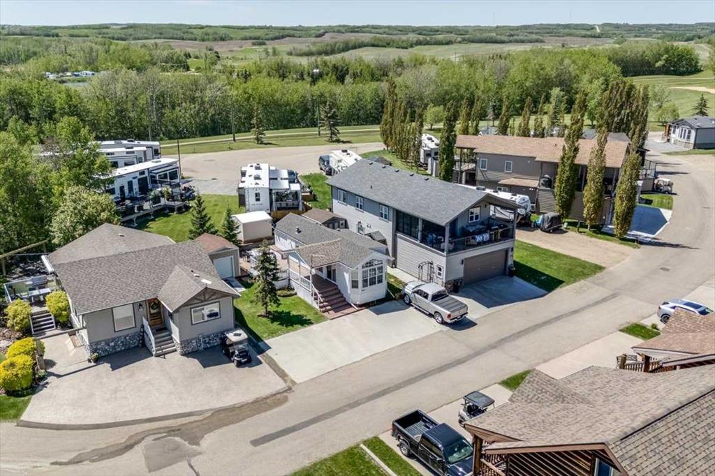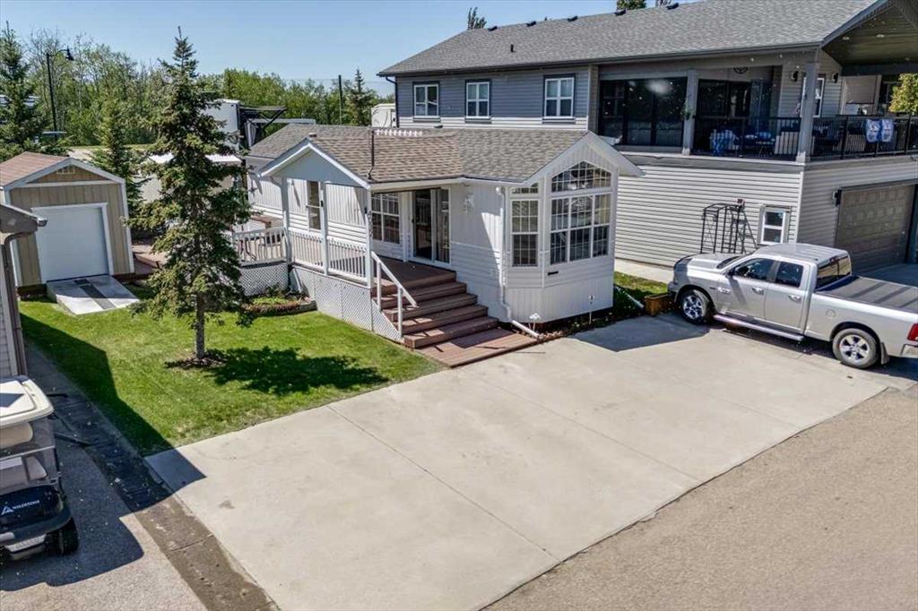 Escape the hustle of city life and enjoy year-round living at the beautiful Whispering Pines Golf & Country Resort. This property is situated on stunning Pine Lake, offering the perfect setting for relaxation, recreation, and creating lasting memories. This lot features an exceptionally clean and well-maintained park model unit, ideal for those looking to downsize, enjoy a peaceful retreat, or entertain family and friends. Just unpack and start enjoying resort living. This fully winterized park model unit features an open-concept layout with vaulted ceilings and floor-to-ceiling windows that flood the space with natural light. The spacious living area includes an electric fireplace for cozy evenings, while the modern kitchen is equipped with a gas stove, fridge, microwave, down the hall, you have a stacked washer/dryer. You will be very comfortable with 2 bedrooms, the primary bedroom has beautiful built-ins for storage. Also enjoy a spacious 4 piece bath. Step outside onto the south-facing composite deck, partially covered for all-weather enjoyment. Patio pavers along the side and back provide extended outdoor living space, perfect for morning coffee or enjoying a night under the stars. A 12x9 insulated shed is included for extra storage. Never worry about parking for your boat or golf cart with a 4 car concrete driveway. As a resident of the Whispering Pines gated community, you’ll enjoy access to a wide array of resort-style amenities designed for all ages and lifestyles. Highlights include a scenic 18-hole golf course, an indoor pool and hot tub, a full-service restaurant and bar, sports courts, a playground, a 55-slip marina, and a private beach. Your monthly condo fees provide exceptional value, covering services such as water and sewer, snow removal, professional property management, reserve fund contributions, and full access to all shared amenities, as well as year-round grounds maintenance. Close enough for convenience, far enough for peace just 90 mins from Calgary and 30 mins from Red Deer and Innisfail. Live where others vacation, make Whispering Pines Golf & Country Club Resort your new home.