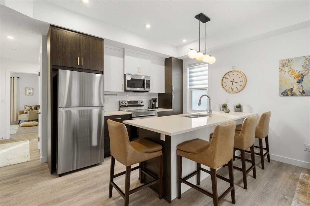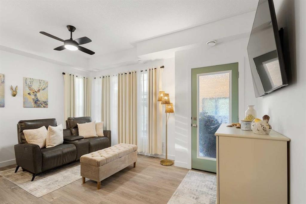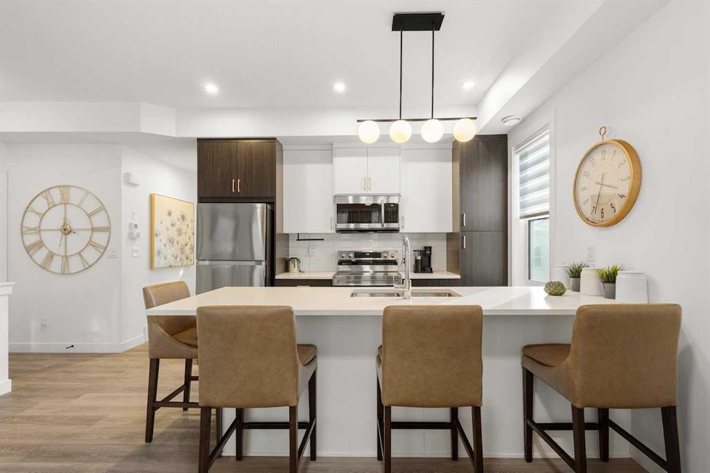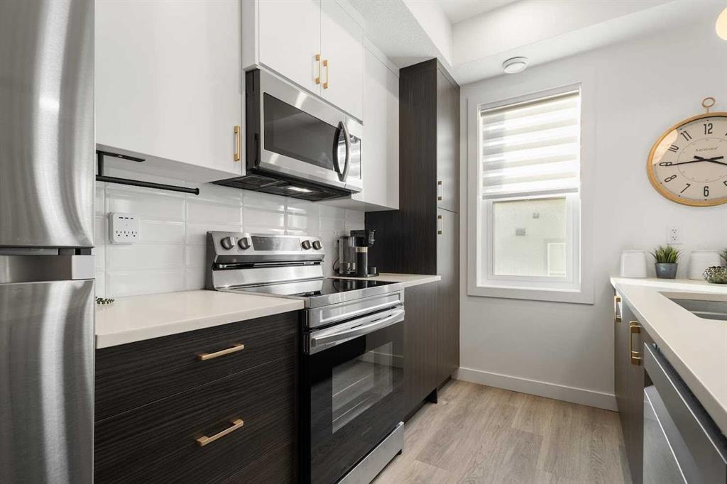 Contemporary European-style townhome with 2 beds, 2 baths, a spacious balcony on the TOP floor & a tree-lined view. From the moment you enter, the home showcases a designer show-home feel. The open-concept 2-storey stacked townhouse features 9' ceilings, double-pane windows, fully installed CENTRAL AIR-CONDITIONING, a HIGH EFFICIENCY FURNACE, humidifier, water tank, water-proof durable LVP flooring throughout the kitchen, living, dining area, bathrooms, & bedrooms. The European-inspired kitchen is finished with Quartz countertops, High-quality cabinets, Soft-close doors, Backsplashes, new UPGRADED SAMSUNG stainless-steel appliances, microwave hood fan, and front-load washer & dryer. The newly completed Elkwood Townhouse (Phase 2) offers affordable luxury & convenient living, close to Aspen Landing Shopping. Bordered by a natural environmental reserve & walking trails that connect throughout the community, it is a perfect location for active living & relaxation. Built by Slokker Homes, a quality builder since 1935, these homes offer the best value in Aspen and Springbank Hill.