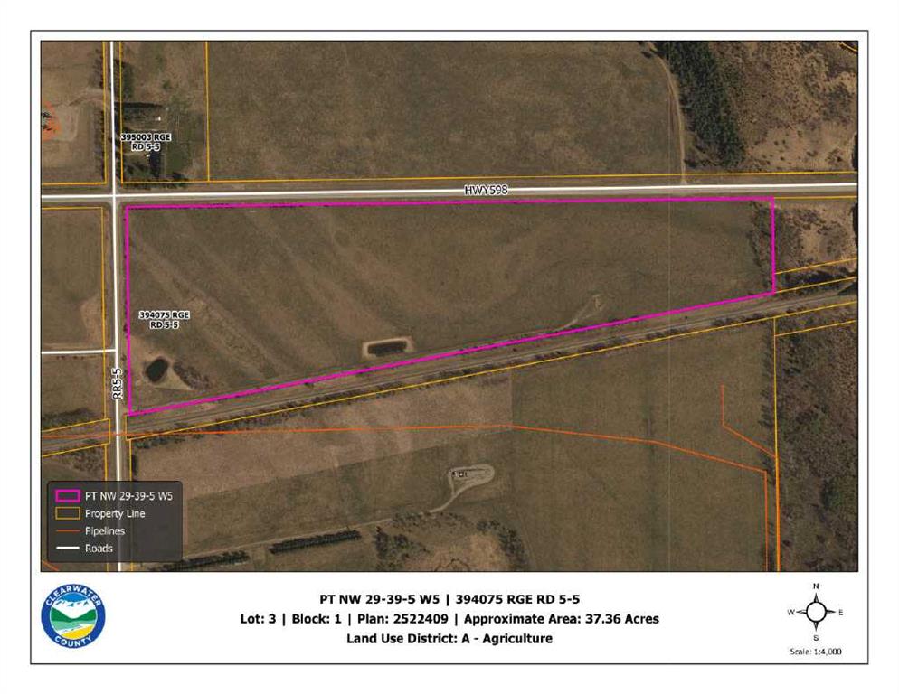 Bigger than your average acreage, this 37 acre parcel along Hwy 598 is zoned Ag with lots of potential for a small hobby farm. There is some perimeter fencing, the owners used electric fence in the past to rotationally graze cattle, and a dugout on the west side. There's also an existing lease road leading to an In Play Energy surface lease that generates $4200/year but it is slated to be reclaimed through the Orphan Well Program (will likely be a few years before that is completed). A second approach is in place along the west municipal road. Note the taxes have not yet been assessed and the property line extends further east than the fence line.