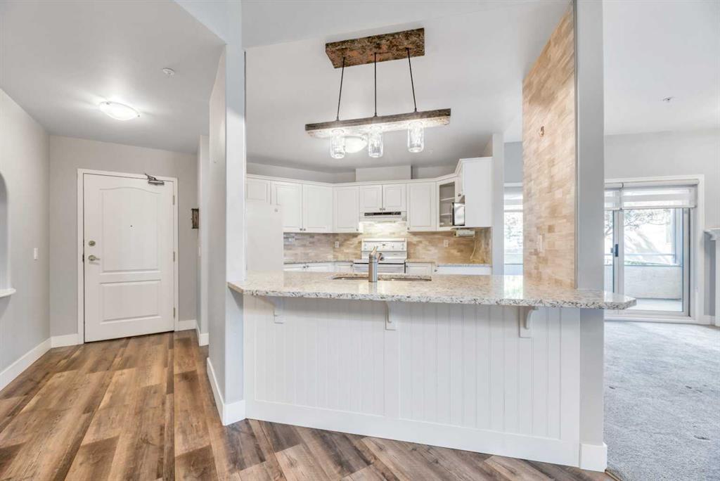 Welcome to this beautifully updated 2-bedroom plus den condo offering style, comfort, and convenience. The open floor plan is perfect for entertaining, featuring a bright living room with a cozy corner gas fireplace and access to the private balcony. The modern white kitchen boasts granite countertops and updated flooring, creating a fresh, contemporary feel throughout. The den with French doors provides the perfect space for a home office or reading nook. The spacious primary bedroom includes a walk-in closet and a 4-piece ensuite. A generous second bedroom, additional bathroom, and large laundry area add practicality and ease. This unit is immaculate and turn Key complete with A/C to add to comfort during the summer months! Enjoy the exceptional amenities this complex offers — including a library, recreation room, lounge, and gazebo — all designed to enhance your lifestyle. Large underground parking stall and a storage unit. Note-Building is 55+ a non smoking and no pet building--