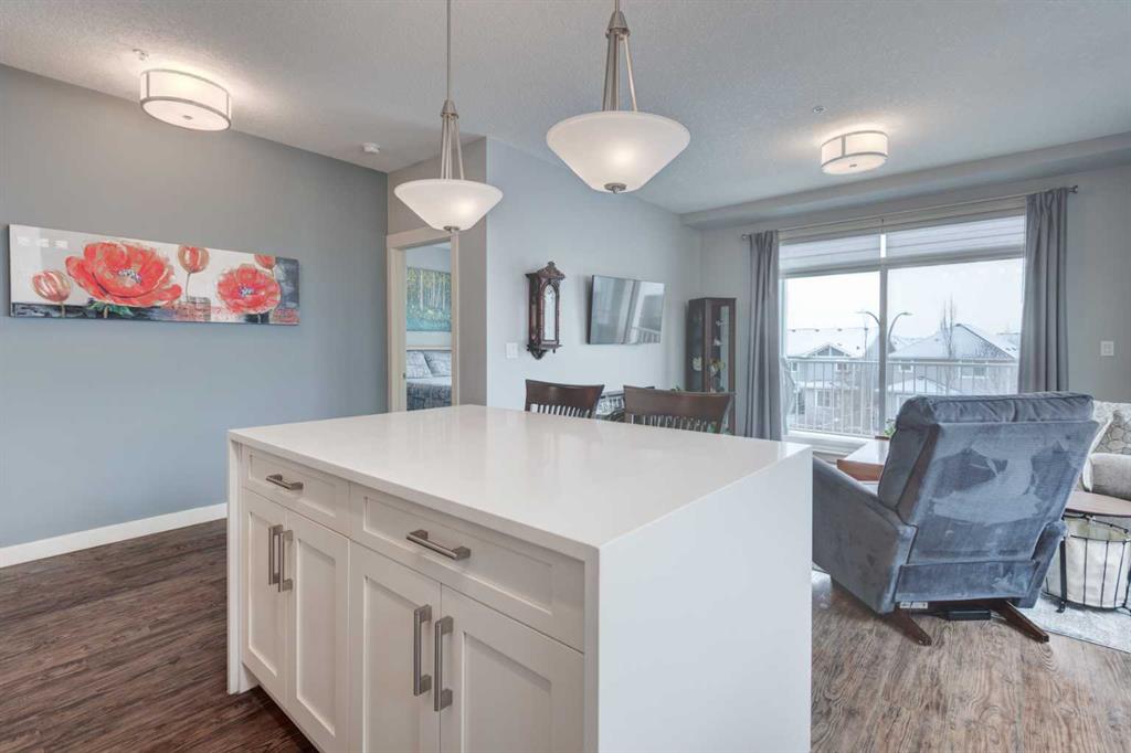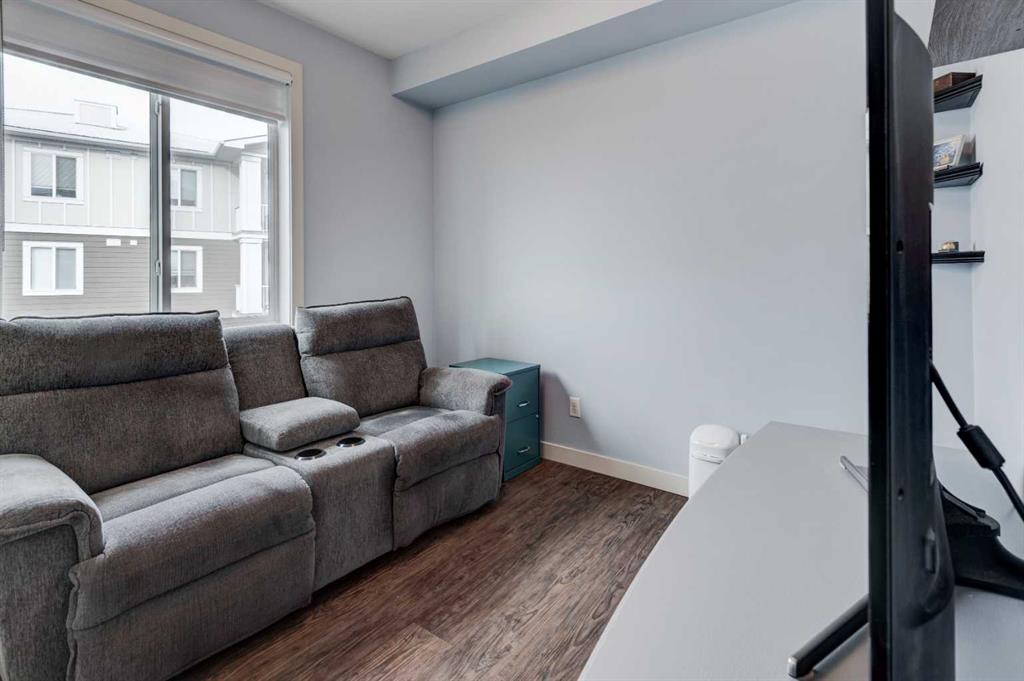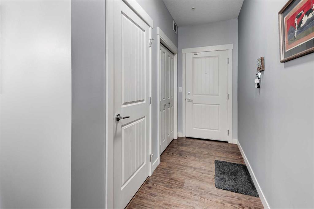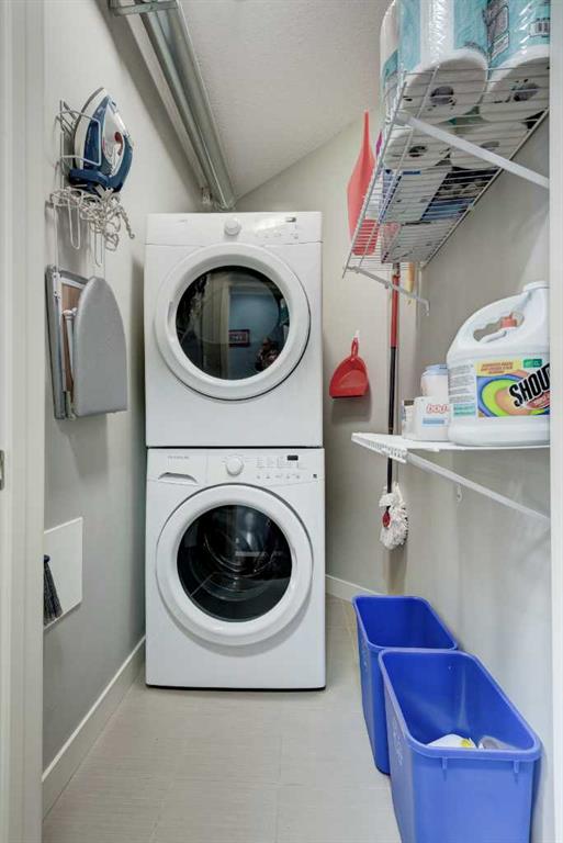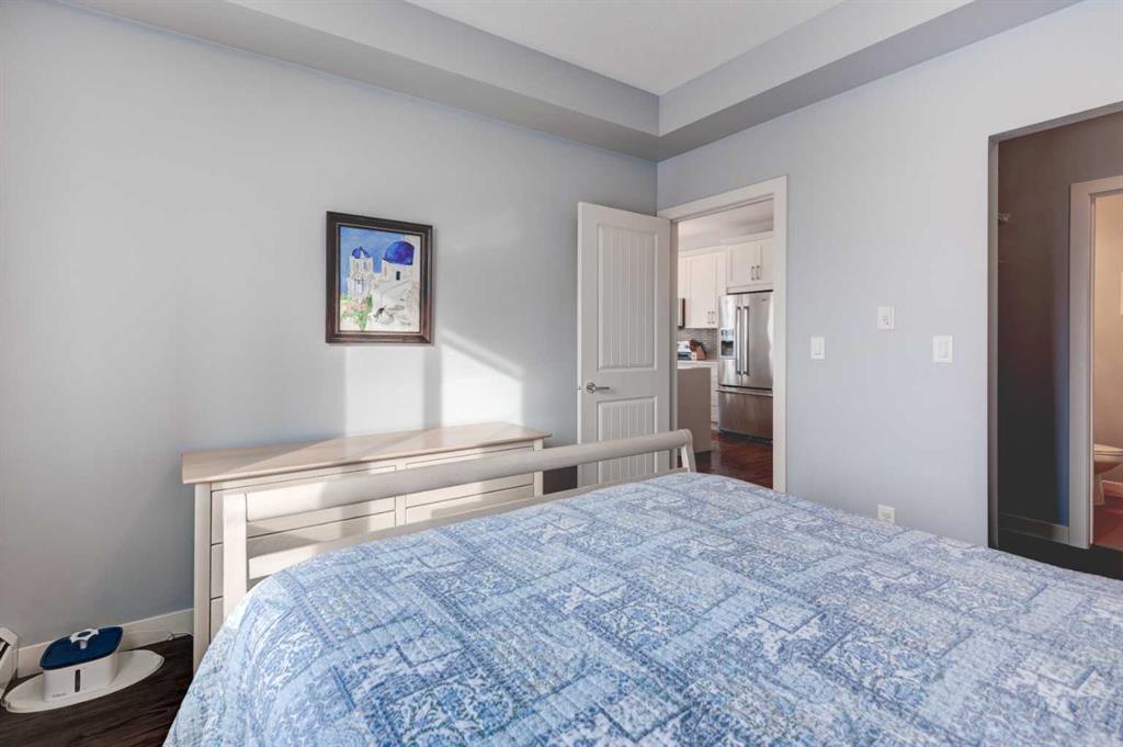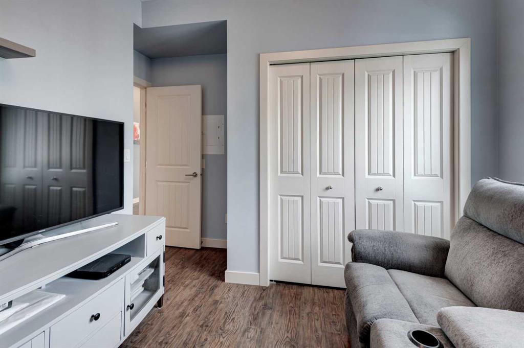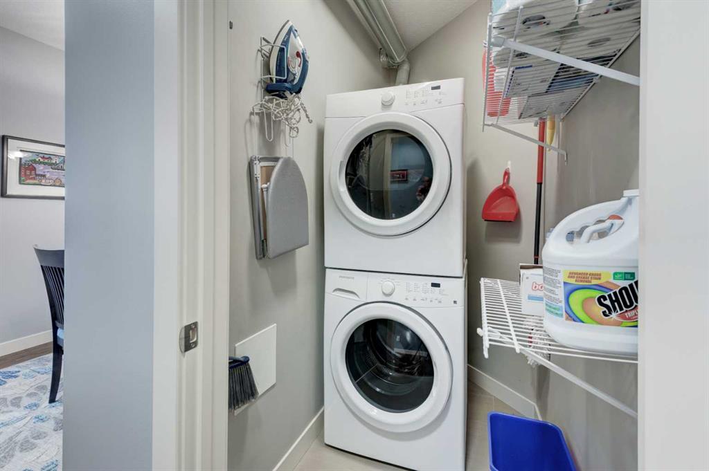 1 The original owners have kept this bright unit in impeccable condition. As you enter through the front door, note the vinyl plank flooring throughout and the air conditioning to keep the unit at a comfortable temperature. The coat closet is conveniently on your right. The next door is a laundry room, and it is deep enough for additional storage. The den/flex area is currently used as a dining room. Continuing, there is a 4-piece bathroom and a second bedroom, that is currently used as a TV room. The open kitchen has quartz counters with upgraded waterfall countertops on the island. The 4 stainless steel appliances and breakfast bar stools are all included! The living room, with an electric fireplace, leads to the west facing balcony, complete with a hooked-up gas barbeque. The primary bedroom is off to the side and has a walk thru closet leading to the 3-piece bathroom with a lovely walk in shower. You won’t be disappointed in this lovely unit that has two titled parking stalls, one underground, in front of the storage unit and one outside.