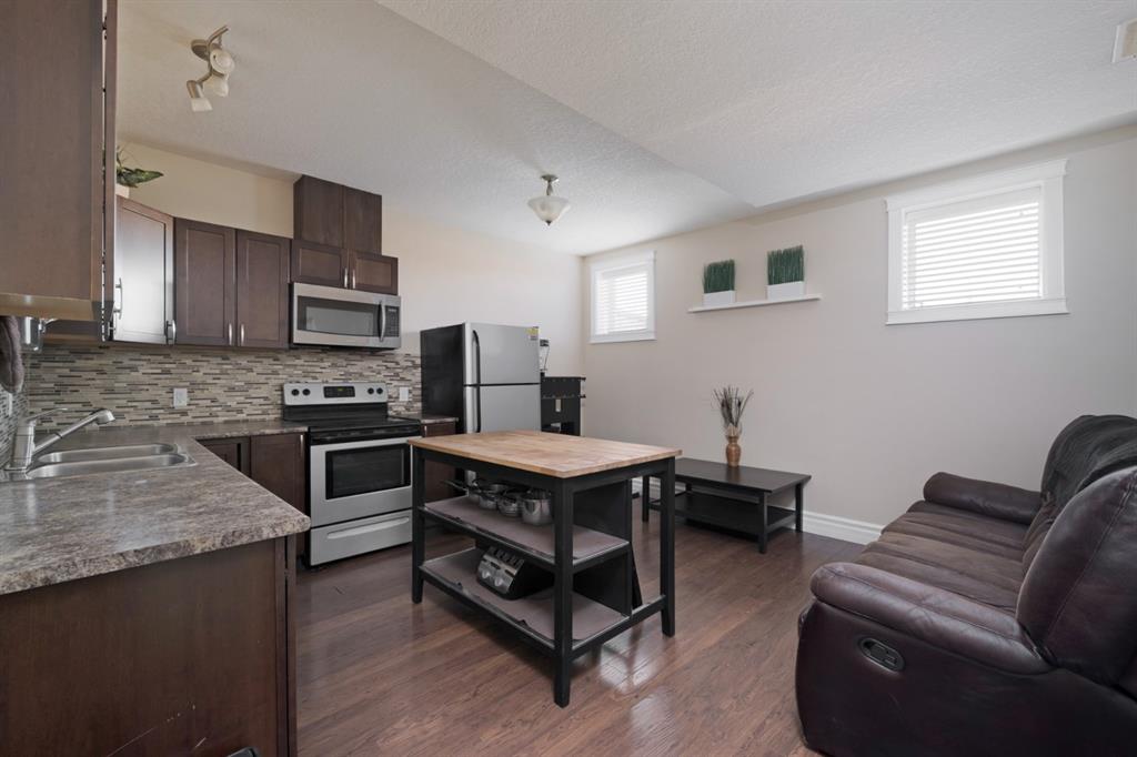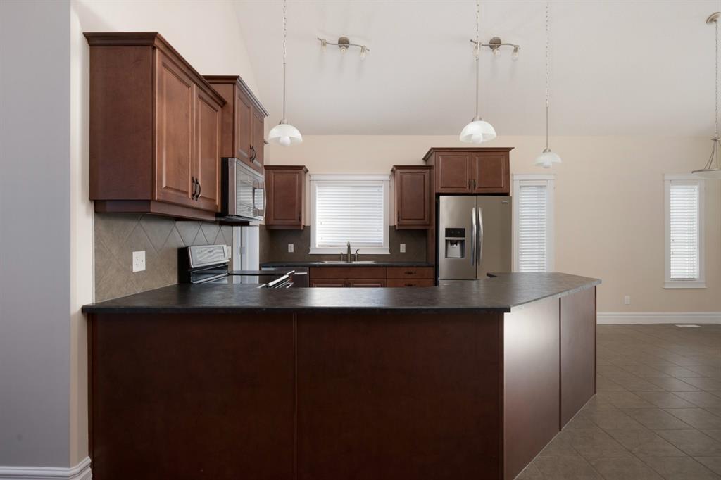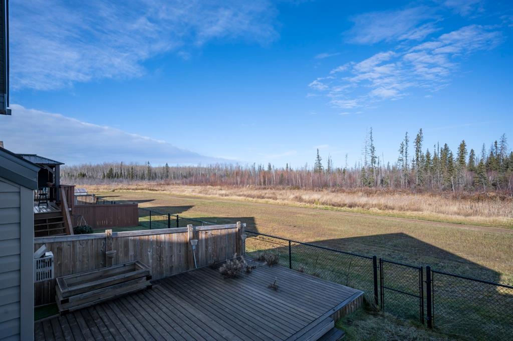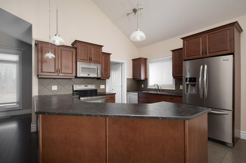 BACKING ONTO TREELINE! The first thing you will notice upon entering this home is how open and spacious this floor plan is. Offering a large entry way and huge dining nook open to the kitchen. The kitchen is rich with dark cabinetry, stainless steel appliances, lots of countertop space and has access to the backyard. Off the kitchen is the living room with vaulted ceilings, gleaming hardwood floors and a cozy gas fireplace. Also on the main level is the main bathroom and 2 bedrooms. The large master suite is tucked away above the garage and offers an abundance of natural light, a walk in closet and a 4PC ensuite with corner jet tub and separate shower. The basement is fully developed into a 2 bedroom LEGAL BASEMENT SUITE with full kitchen, laundry, separate entry and plenty of natural light. The attached garage is heated and ready for a hockey fan with the floor painted as a hockey rink. Enjoy Northern Alberta’s sunset from your West facing backyard which backs onto the forest and walking trail.