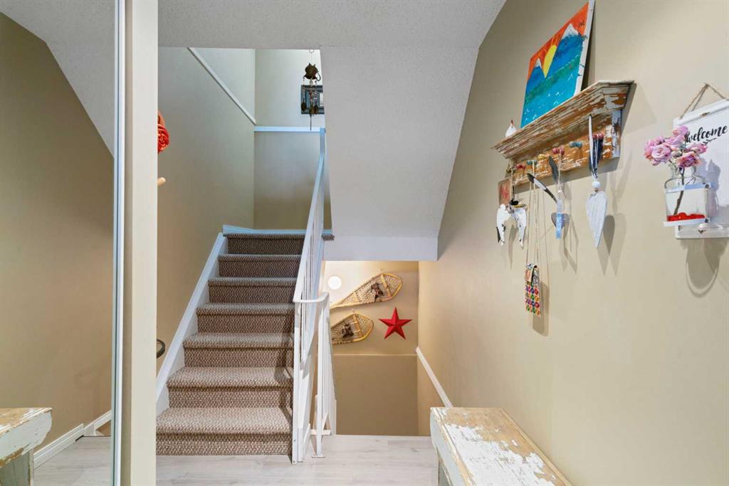 Step into an inviting entrance that offers space for seating and a warm, welcoming feel. Upstairs, you’ll be impressed by the exceptionally bright living area, enhanced by large windows, a quaint balcony perfect for enjoying the outdoors, and a cozy wood-burning fireplace—ideal for relaxing evenings. The main living level has been freshly painted and features a well-sized dining area, functional kitchen, and convenient powder room. The kitchen has seen numerous updates, including newer countertops, double sink, faucet, appliances, Hunter Douglas blinds, and stylish plank and cork flooring. Additional upgrades include a newer high-efficiency furnace and hot water tank, adding comfort and peace of mind. Up another level, you’ll find a spacious primary bedroom with a massive closet, a generous secondary bedroom, and a full 4-piece bathroom. The unfinished basement provides a blank canvas, ready for your personal touches and future development. Backing directly onto green space and pathways, this home is surrounded by nature, offering a peaceful and private setting. The complex itself is extremely well maintained, with newer siding, windows, and roof. The location is hard to beat—within walking distance to two elementary schools and one junior high, and just minutes from the Shawnessy Community Centre, LRT, shopping, and transit. This is a fantastic opportunity to own a move-in-ready townhome in a well-managed complex and a family-friendly community.