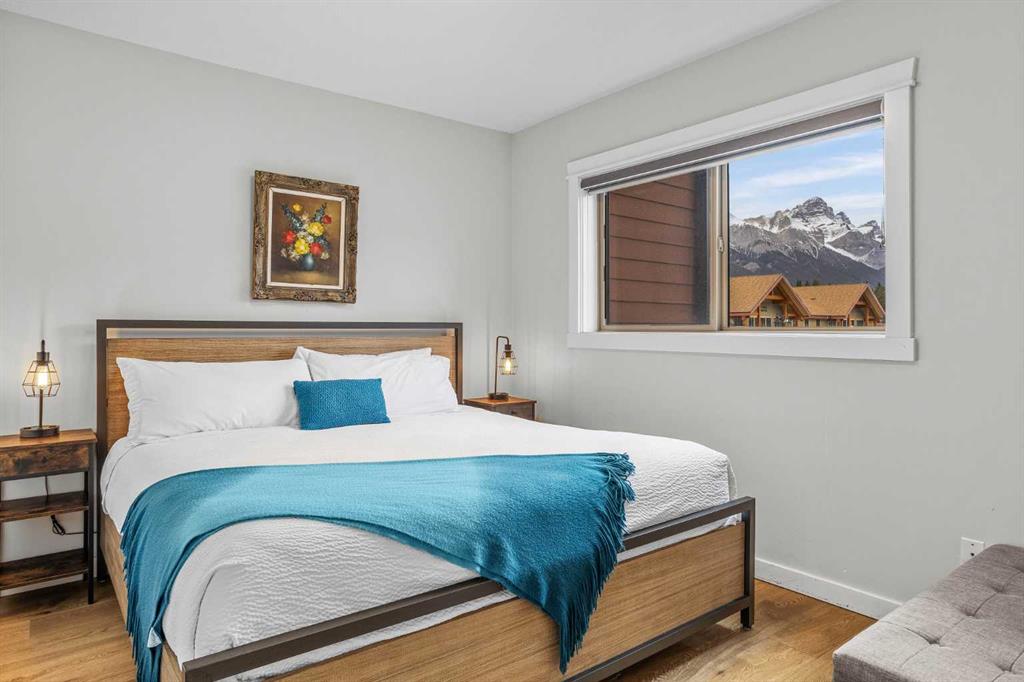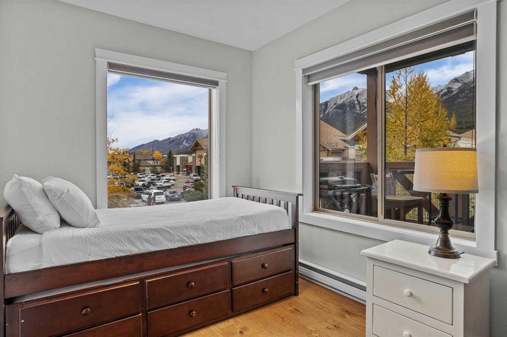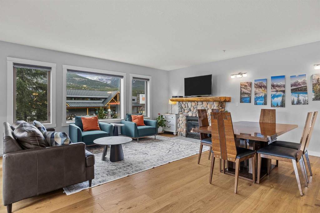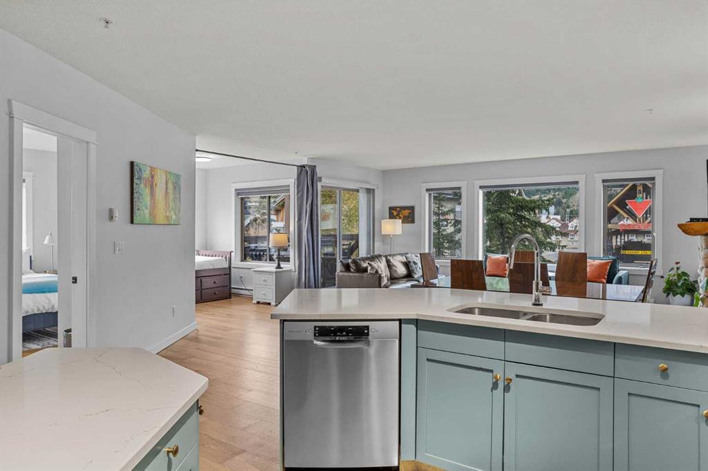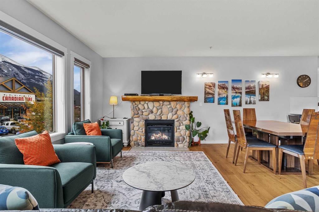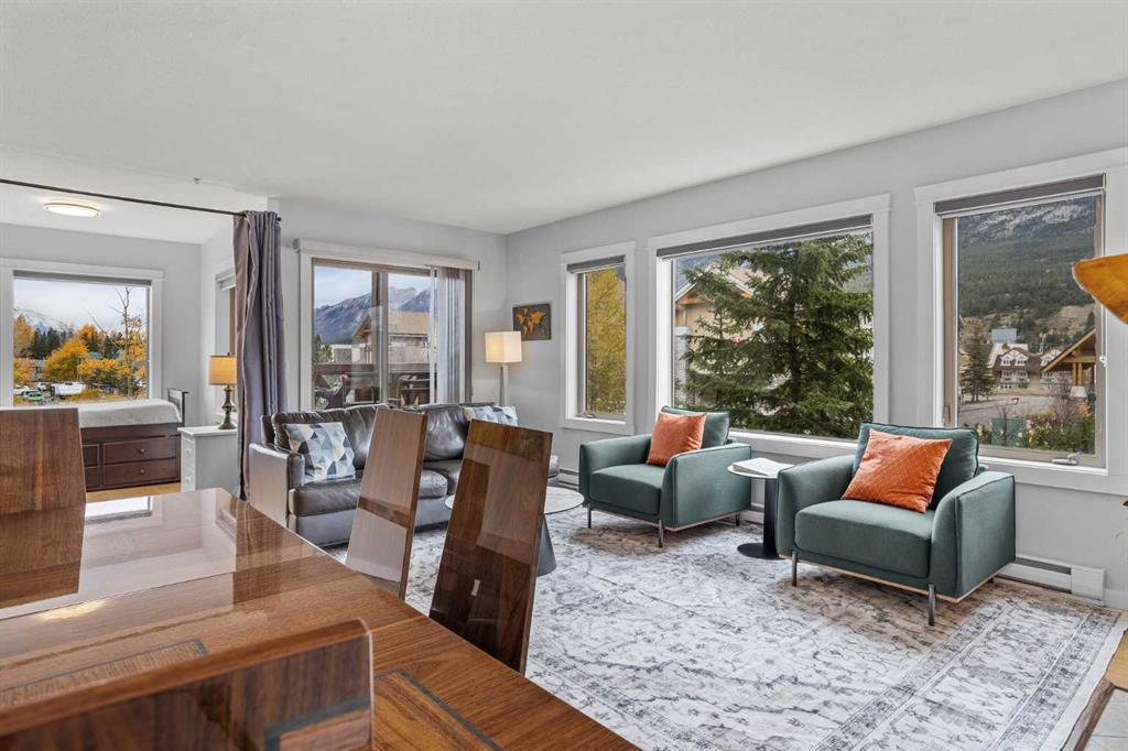 Wrap-around mountain views, rooftop hot tub, and legal tourist zoning — a rare combination. This bright corner unit offers 1,200 square feet and the flexibility to operate as a high-performing short-term rental or a full-time or lock-and-leave Canmore home. Thoughtfully renovated and fully furnished, this property is truly turnkey and positioned perfectly for the busy summer season. Currently configured as a two-bedroom plus den, the layout comfortably sleeps six and can easily function like a three-bedroom with the addition of a pull-out sofa — a simple way to expand nightly rates and overall revenue. Granite countertops, 2 tone cabinetry, durable vinyl flooring, and modern finishes deliver a clean, updated aesthetic that performs well with guests. Located in one of Canmore’s most sought-after STR buildings, this downtown address puts shops, restaurants, and trails right at your doorstep, with downtown just a block away. Owners and guests enjoy premium amenities, including a top-floor fitness room, underground parking and a stunning rooftop hot tub with 360-degree mountain views — a true differentiator in the short-term rental market. Whether you’re focused on cash flow, flexibility, or long-term value in one of the world's strongest STR markets, this property delivers. *List price is inclusive of GST -ask your tax expert how to defer the tax*