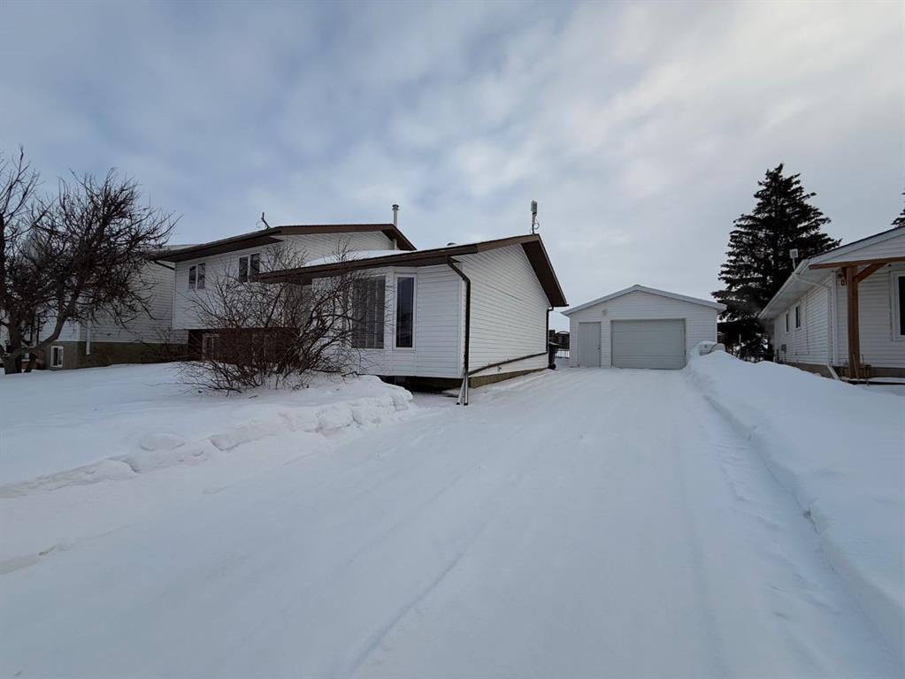 Welcome to this beautifully finished family home located in the quiet community of Kitscoty, Alberta. Tucked away in a desirable cul-de-sac and backing onto an open field with no rear neighbours, this property offers privacy, space, and comfort both inside and out. The home is fully finished top to bottom and features three bedrooms upstairs, including a primary bedroom with a 3-piece ensuite, plus a full main bathroom. The main level offers a functional and welcoming layout with a bright kitchen, dining area, and living room, all accented by hardwood flooring throughout the main floor. The fully developed basement provides excellent additional living space with a large family room, 2-piece bathroom, spacious bedroom, den/office area, and a large storage closet—perfect for growing families or those working from home. Numerous updates add to the home’s appeal, including newer vinyl windows, hot water tank replaced just a few years ago, new washer and dryer (2025), and new dishwasher (2024). Outside, enjoy the new asphalt driveway leading to an oversized 24x18 heated garage. The expansive backyard is ideal for entertaining or relaxing, complete with a large deck, firepit area, and storage shed, all overlooking peaceful open space. A fantastic opportunity to own a move-in-ready home in a quiet, family-friendly location.