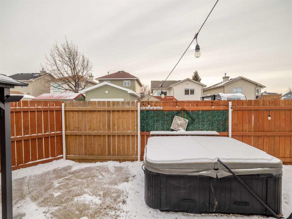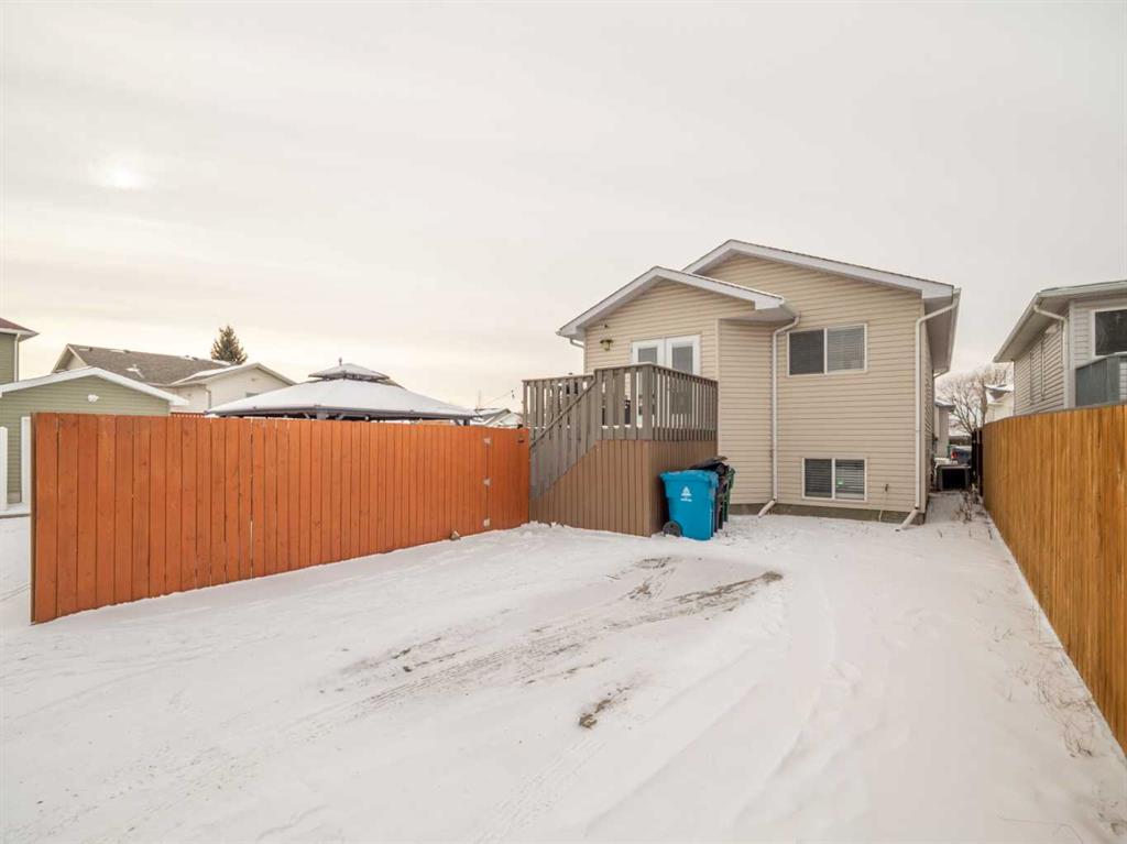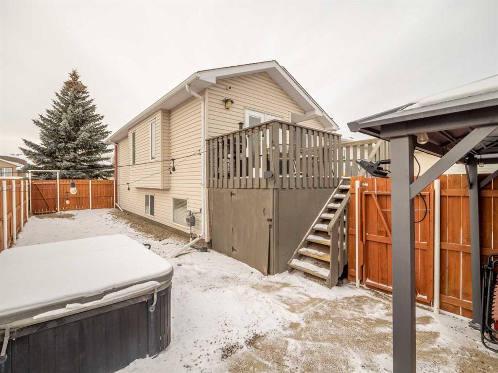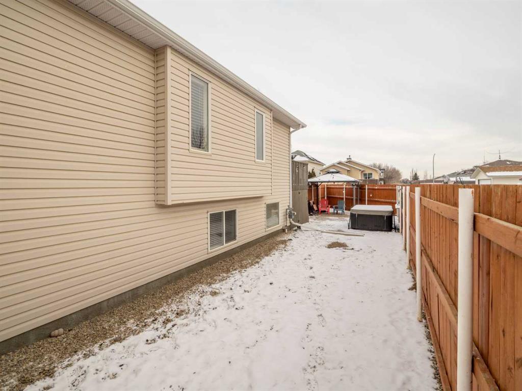 Fantastically appointed bi-level home in West Lethbridge with nice open floor plan. Welcoming entry open to above with front closet. Main level features vaulted ceilings. Living room has laminate flooring. Dining room features a good space with garden doors to deck out back. Kitchen features upper white cabinets and lower lighter blue cupboards. There is a full appliance package and a pantry. Primary bedroom is also on this level and features a full ensuite with tub/shower bath combo and large walk-in closet. The main floor also has another 2 piece bathroom. Basement is fully developed with large family room that includes an entertainment unit with electric fireplace. Basement also has 2 good size bedrooms and another full bath with tub/shower combo. There is also good storage under the stairs. Home has convenience of central a/c for the warmer months. Yard is fenced and has gravel on the side, and includes a hot tub, and a patio with pergola. Parking pad out back for 2 vehicles with alley access. Just down the alley is access to WIllow Pointe Park and home is within walking distance to Willow Brook Park and Mike Mountain Horse Elementary School and Park.