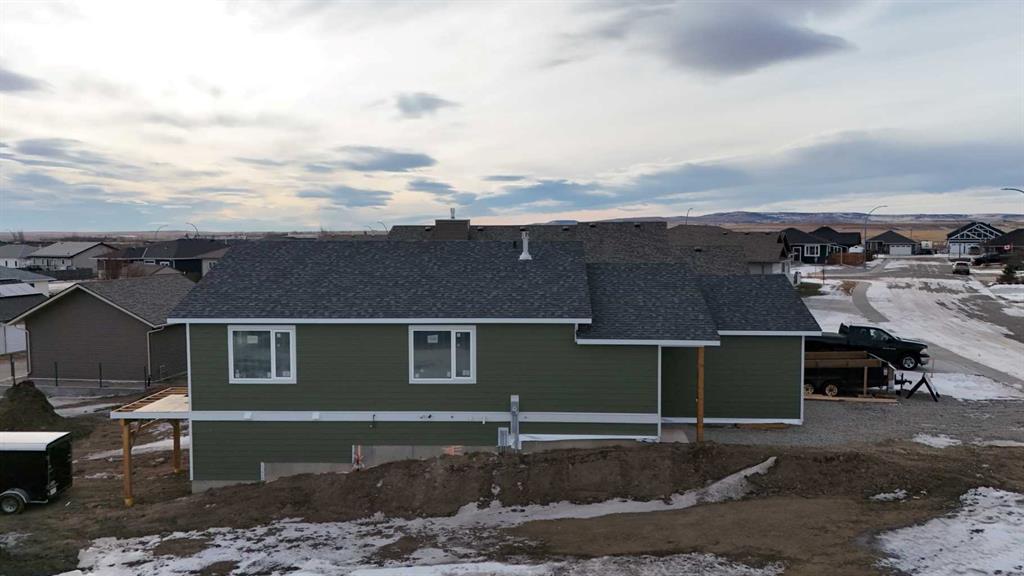 Located in the welcoming town of Nanton, this thoughtfully designed bungalow offers comfort, practicality, and long-term value in a quiet small-town setting. The main floor features a smart, traditional layout with everything you need on one level. A full attached double garage leads into a proper foyer. At the heart of the home is a bright, open-concept living area anchored by a gas fireplace. The living room flows seamlessly into the dining area and kitchen, making it ideal for both everyday living and entertaining. The kitchen offers an island with seating, ample cabinetry, and direct access to the rear deck, extending your living space outdoors. The primary bedroom is well-proportioned and private, complete with its own ensuite bathroom. A second bedroom located adjacent to the full main bathroom, making it perfect for guests, a home office, or family. A dedicated laundry room adds convenience and keeps noise out of the main living areas. Downstairs, the home features an unfinished walkout basement — a major value add. With plumbing rough-in already in place, the space is ready to be developed to suit your needs, whether that’s additional bedrooms or a family room. The walkout design allows for natural light and easy access to the yard. Exterior construction includes durable Hardie board siding, offering long-lasting curb appeal with lower maintenance than traditional siding — a practical upgrade that stands up well to Alberta’s climate.