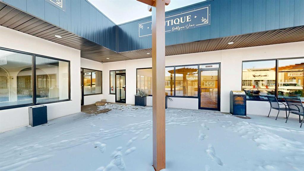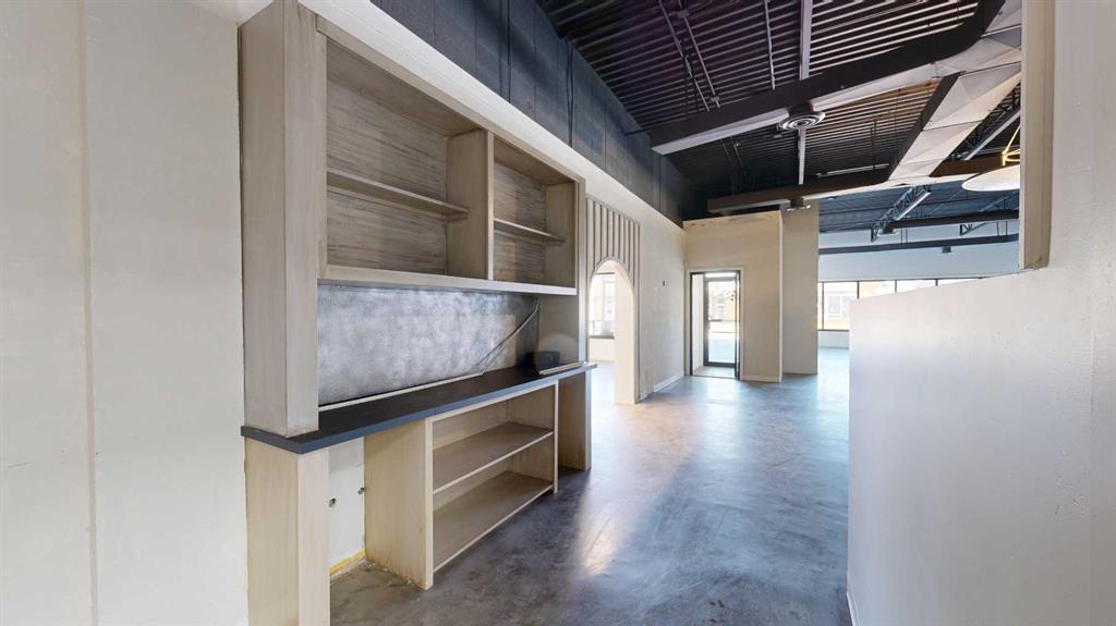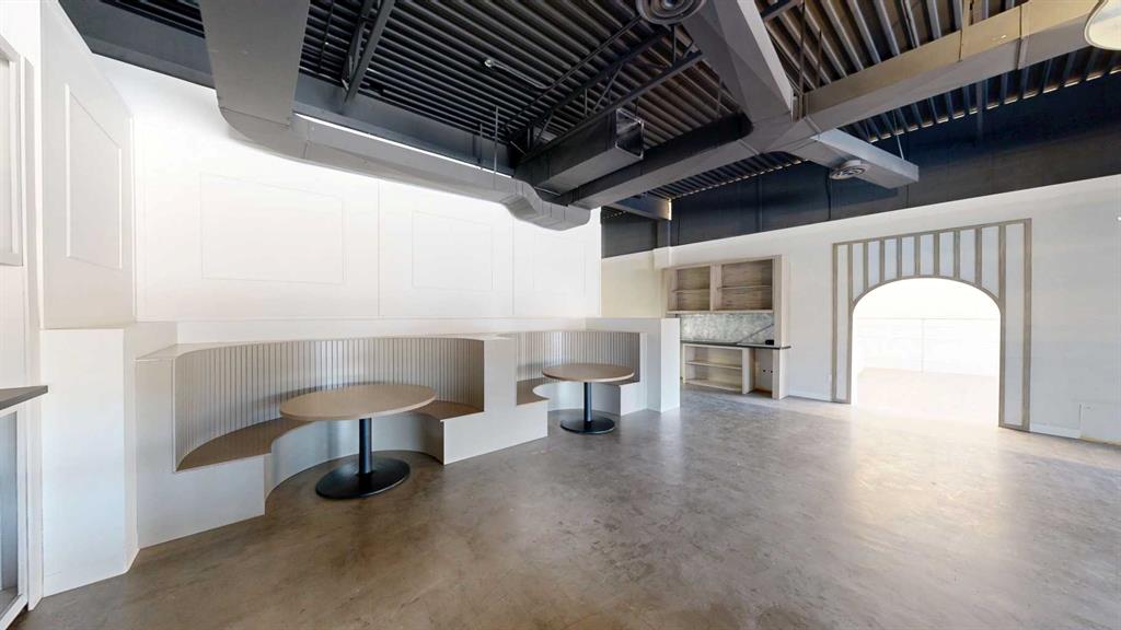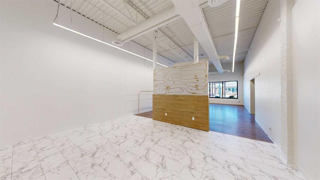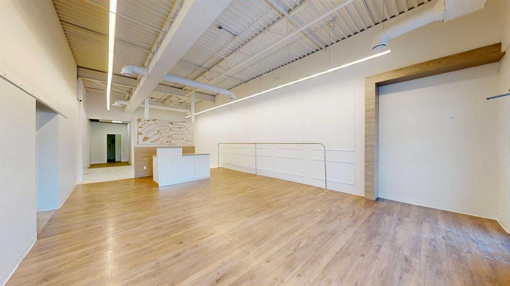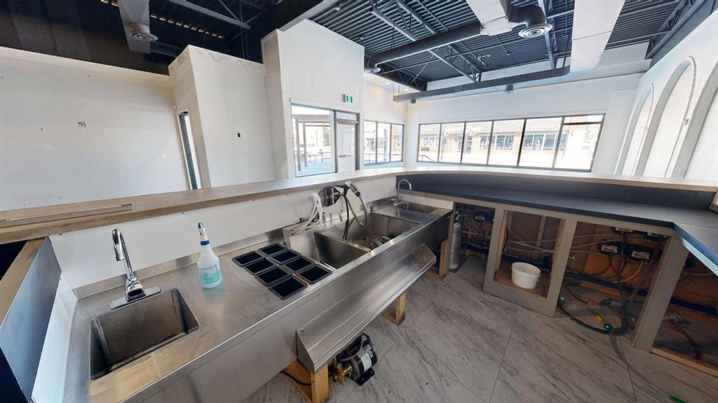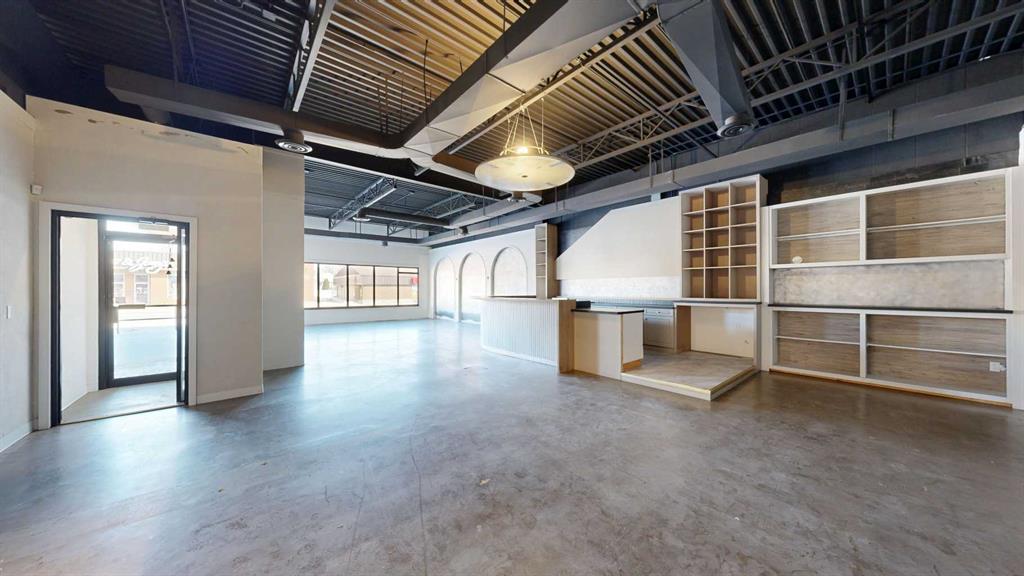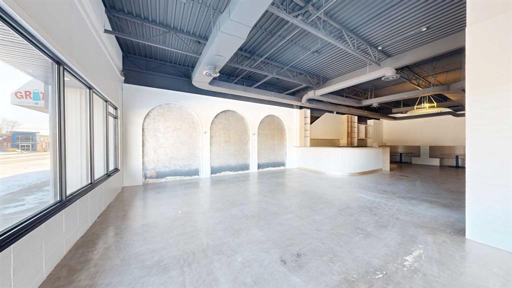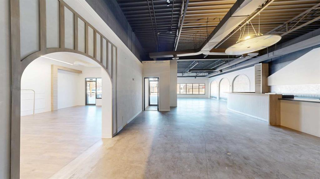This expansive commercial property on main street in Stettler features a visually appealing and versatile layout suitable for a variety of business styles. The interior blends industrial and modern design, highlighted by exposed beams and ductwork in the high ceilings. Large windows fill the space with natural light for an open, airy feel. This property is partitioned into two main spaces, each with their own front and back doors. The south side has an open area with polished concrete floors, making the space well suited for retail or event use. There is an existing bar with stainless steel commercial sinks, plenty of counterspace, and display shelving. This space currently has two tables with built in seating. The kitchen area adjacent is ready for development. An arched doorway leads you to a bright space with warm wood-look flooring and windows along the front. This could potentially provide a comfortable setting for retail, offices, or meeting areas. Beyond this is another space with marble-look flooring for even more flexibility. There is a large office or storage room as well as a comfortable washroom just around the corner. The hall, which divides the two main spaces, has storage room with shelving and two modern washrooms. With its blend of open concept areas and private rooms, this property can easily accommodate creative studios, professional offices, retail operations, or multi-use commercial ventures. The landlord is open to demising the space with an acceptable lease.