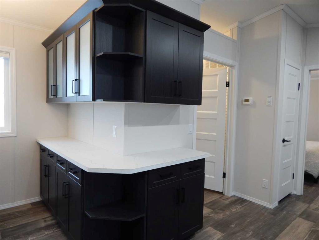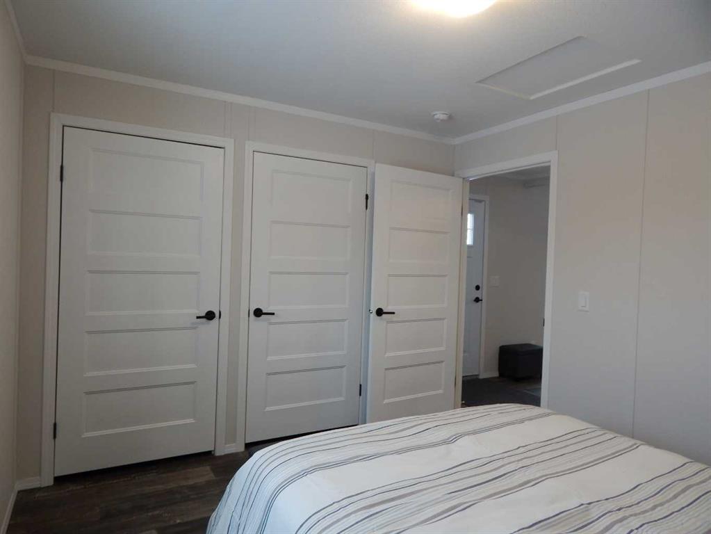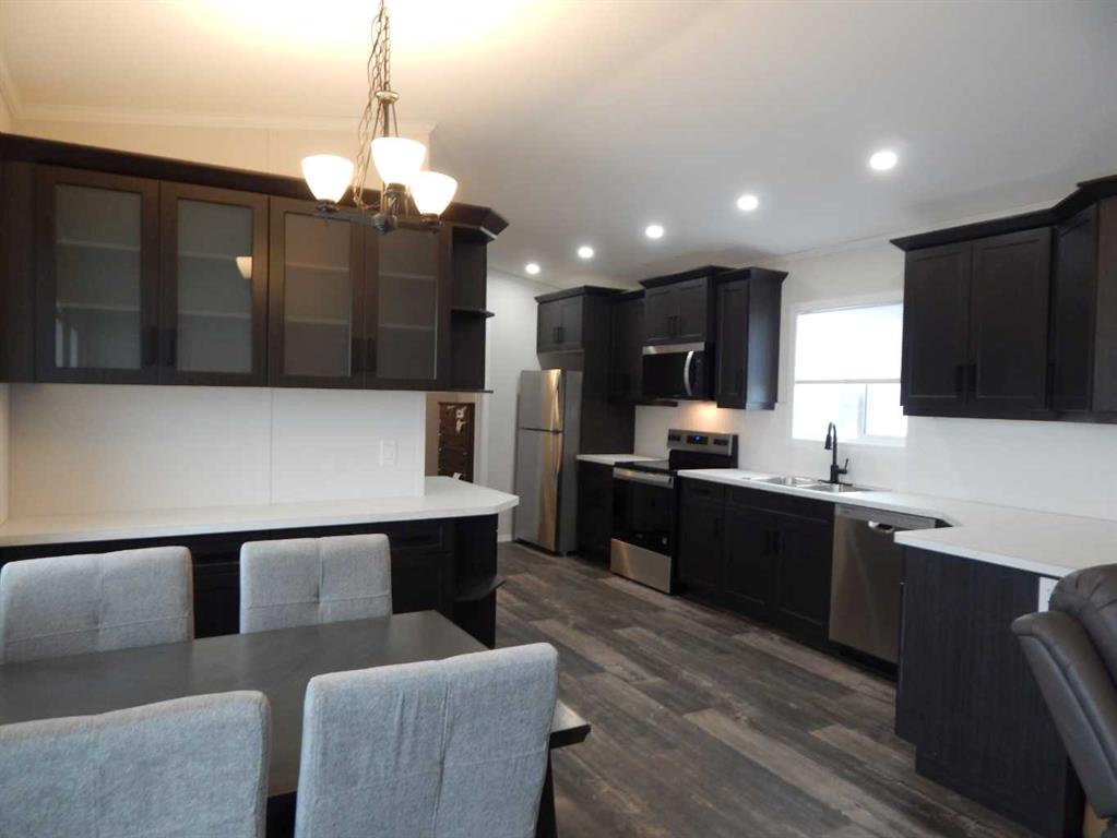 Wow! This is rare opportunity to own a NEW home in the Silverlynx adult living community. Beautiful Moduline Homes Mansura model recently was placed at it's new address of #11 5210 65 Avenue Olds. Plan to be impressed with the modern warm tones and lay out of this 2 bedroom home. The dining area and kitchen blend seamlessly with the living room making visiting easy and provides for an ideal flow. The chef of the house is sure to enjoy their brand new kitchen that is thoughtfully laid out and filled with plenty of cabinets, counter space, stainless appliances and pantry. Many windows thru-out allow for the natural light to stream in. The spacious primary bedroom with walk-in closet and a 3 pce ensuite boasting lots of cabinets, countertops and a stand alone shower stall with 2 seats. The 2nd bedroom is also well set up with a double closet and is located at the opposite end of the primary bedroom providing plenty of privacy. Conveniently set beside the second bedroom is a 4 pce bathroom. Lastly the laundry pair is found nestled in the utility room where you will find the hotwater tank and furnace as well as the back door. Outside is an oversized deck, a larger storage shed and parking pad for 2 vehicles. Conveniently located close to shopping, eateries, walking paths and numerous other amenities. Park Approval is a requirement of this park. It is a 55+ community with pet restrictions and they must be approved by Park Management. This is a modular home on a leased lot, current lot rent is $617.00/mo and 2025 taxes are $1,035.00.