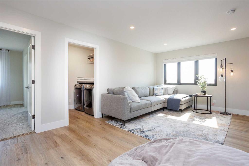 A brand new fully developed Larkaun Homes show home in desirable Evergreen. The curb appeal is accented by the aggregate front driveway & steps, the metal roof accents & vertical board & baton features. The front entryway greets you with towering 18' ceilings in the foyer & main floor office that overlooks the custom staircase with solid wood treads, two tone risers & custom glass guard rails. Ceiling height, soft close kitchen cabinets are accented by a massive island with an eating bar, full chevron tile backsplash, a Franke peak undermount granite bowl sink, a built in fridge/freezer combo, a gas stove with a pot filler, wine storage, a pantry style cabinet with pullouts, a custom wood hood fan & quartz countertops. Walk through the butler's pantry with a prep sink & beverage centre to the back entryway that has mirrored sliding closet doors, a bench seat & built in cabinetry for storage. The powder room has decorative wallpaper, a furniture style vanity accented by a hammered stainless steel under mount sink. The eating area has patio doors to the 14'x8' + 16'x14' composite rear deck. Relax in the living room next to the british fires forest 48" electric fireplace featuring matte black quartz slab surround. Follow the stunning custom staircase up to the bonus room that adjoins to the desk stations with a custom welded wall with glass inserts that overlook the main floor. The king sized primary bedroom has a large window that overlooks the back path & trees, a fan, reading lights on each side of the bed & an oversized walk in custom closet. The gorgeous 5 piece ensuite features heated tiled floors, a 60"x36" curbless walk in tile shower with a built in storage niche, dual heads including a rain head & a sliding hand shower, a freestanding tub below the picture window, double sinks, a makeup counter with an LED mirror, and a water closet with a window. There are two additional bedrooms, a 4 piece bathroom & a laundry room (smart drain under the washing machine) with builtins including baskets & a folding counter. The fully finished basement has operational in floor heat with a family room featuring a sports bar (includes a built-in ice maker & beverage centre), a 4th bedroom, an exercise room with full glass wall and a 4 pc bathroom. The fully landscaped yard backs onto a walking path & treed area. The oversized garage has premium flake epoxy floors, a gas heater, floor drains, a smart car plug in & a rear garage shed with backyard access through the 7'x7' overhead door. Features of the home include: Central air conditioning, basement & ensuite has in floor heat, window blinds, luxury vinyl plank flooring, high quality carpet with an 8lb underlay, solar panel ready, Lutron smart home system connects to the power blinds, pot lights and Sonos system, video doorbell and security cameras, Sonos speaker in the kitchen, living room and sun deck, central vac with floor sweeps & more! Evergreen is an HOA and the fees are $100/year at this time.