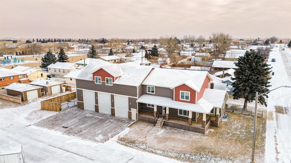 Welcome to a truly one-of-a-kind property that offers unmatched space, versatility, and income potential — all just 15 minutes from Lethbridge. Situated on a large corner lot in the quiet community of Shaughnessy, this exceptional home is ideal for families, investors, tradespeople, or anyone craving room to live, work, and grow. The main residence offers nearly 2,200 sq. ft. above grade with 6 bedrooms (4 up, 2 down) and 4 bathrooms, complemented by a fully finished basement featuring an impressive 32-foot recreation room with space for a pool table or games area. The open-concept main floor is filled with natural light and showcases a spacious living room with an electric fireplace, a dining area large enough for a 10-seat table, and a highly functional kitchen with pantry, ample storage, and direct access to the wraparound porch — perfect for entertaining or quiet country evenings. Durable luxury vinyl plank flooring and soft carpet create a warm, low-maintenance living environment throughout. The primary suite is a standout, featuring a 12-foot walk-in closet and a sleek 5-piece ensuite. Convenient interior access to the garage and a separate man door add everyday functionality. The 45' x 32' triple heated garage is truly exceptional — large enough to fit a semi-truck — and includes 10' x 14' overhead doors, a workbench, and a 3-piece bathroom, making it ideal for business owners, hobbyists, or serious toy storage. Above the garage sits a fully legal carriage suite, offering approximately 1,500 sq. ft., 3 bedrooms, and 2 full bathrooms, with a private entrance and designated parking. This income-generating suite can significantly reduce the required income to qualify for the property, making it as practical as it is impressive. Built in 2019, the home offers peace of mind with original furnace, hot water tank, central A/C, and roof. Located steps from a park, playground, and basketball court (which doubles as an outdoor rink in winter), this property blends quiet small-town living with quick access to city amenities. Whether you need space, rental income, or a lifestyle upgrade — this property delivers it all. Contact your favourite REALTOR® to book a showing today.