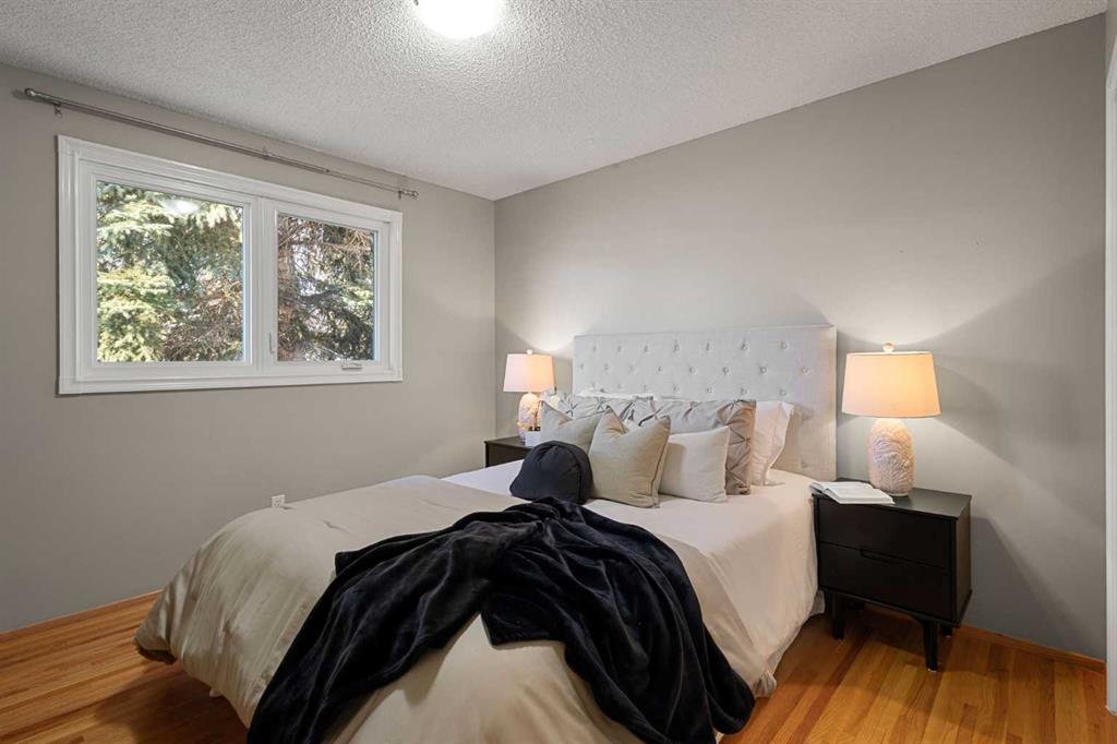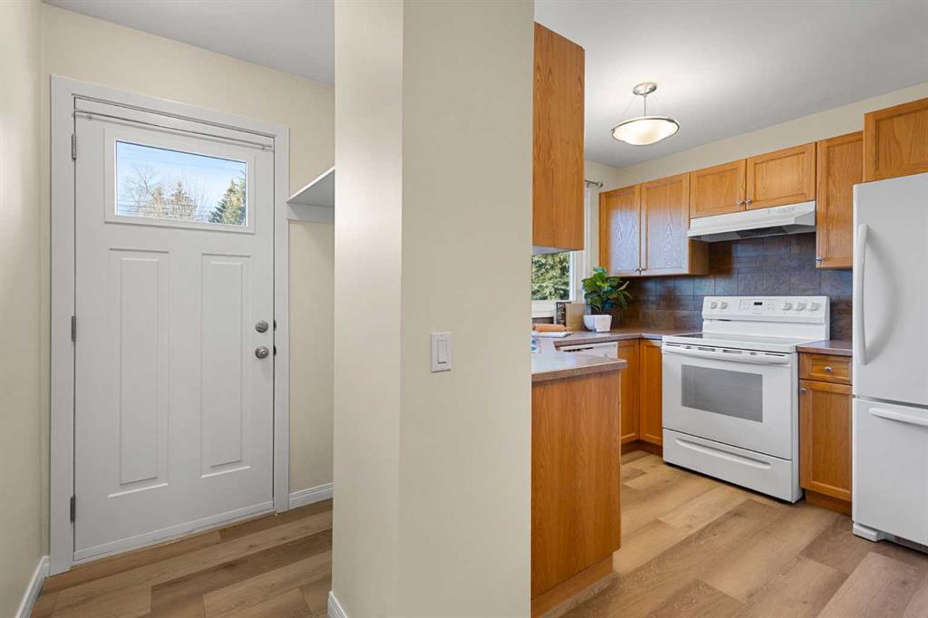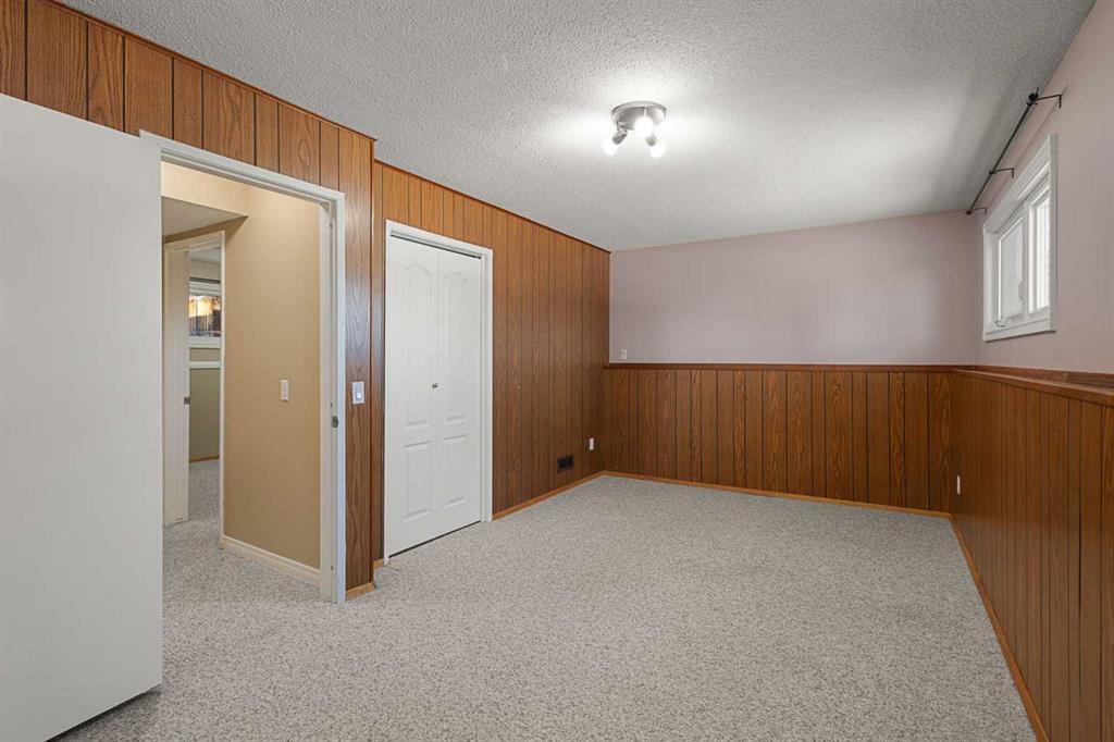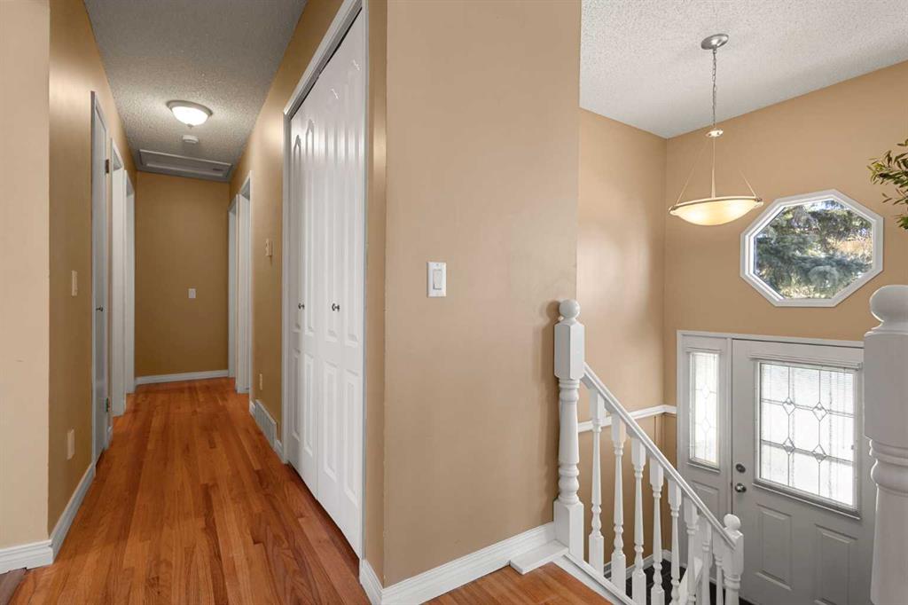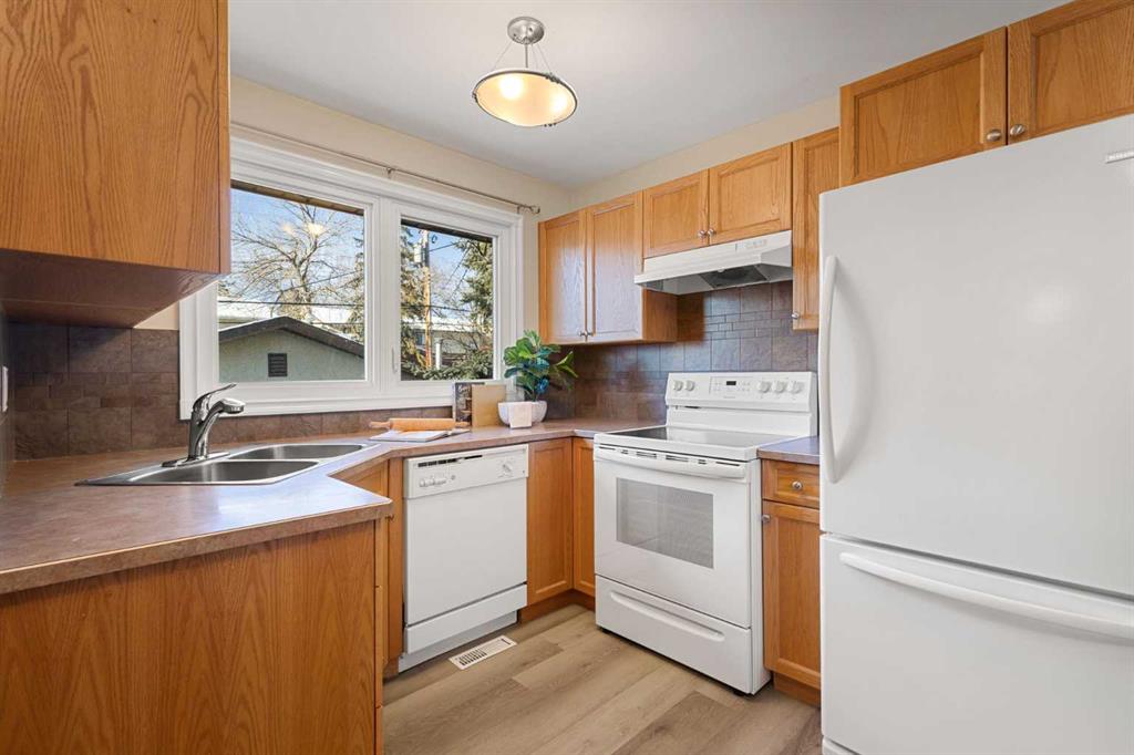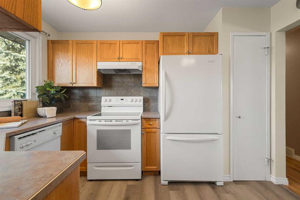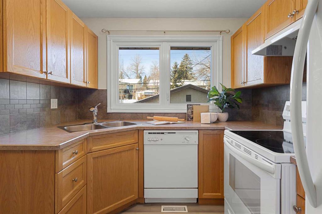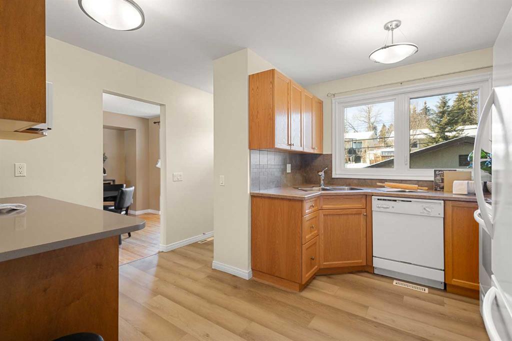 Welcome to this move-in ready family home, ideally situated on a very quiet street while still being close to all amenities, schools, parks, shopping, and more. The main floor welcomes you into a cozy yet spacious living room that flows seamlessly into the dining area, featuring a bay window and a perfect nook for a cabinet/hutch. The functional kitchen offers added cabinetry and extra counter space, a pantry with a built-in spice rack, a corner sink, and a lovely window overlooking the deck and backyard. A rear foyer off the kitchen provides convenient access to the yard, with coat hooks and space for shoe storage. A separate hallway coat closet keeps the front entry neat and clutter-free for guests. The spacious main-floor bathroom includes a window for plenty of natural light, and three bedrooms complete this level. The fully developed basement features a large family room with a play or office area and nice windows. A gas fireplace is set into a striking brick feature wall with ample display space for family photos. Two additional bedrooms—one generously sized—a full bathroom with a window, under-the-stairs storage, and a laundry room complete the lower level. Park your vehicle in the double garage and enjoy the backyard, thoughtfully divided into private areas. Gardening tools and additional storage can be conveniently located under the deck. Excellent value for a five-bedroom home in a desirable location.