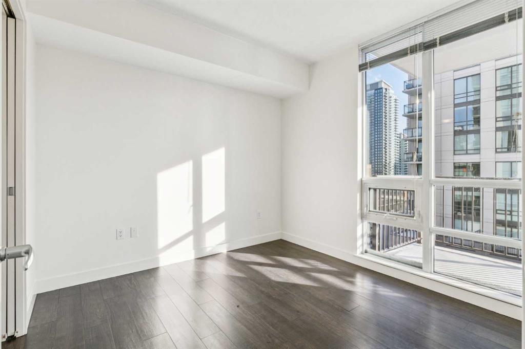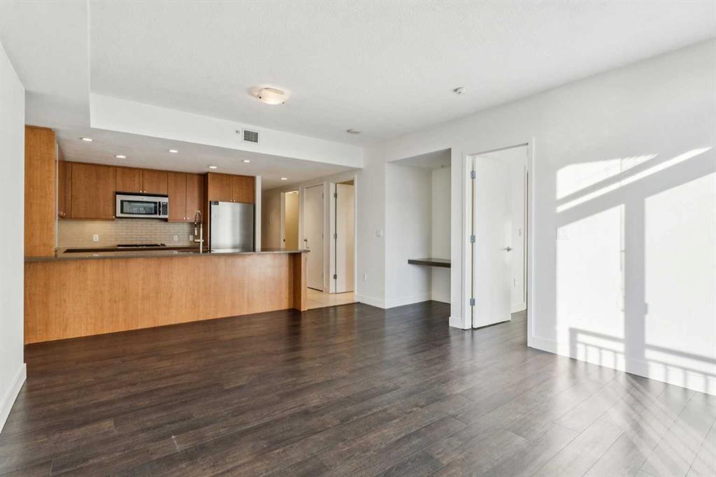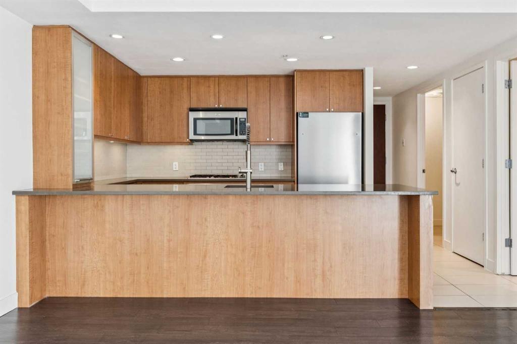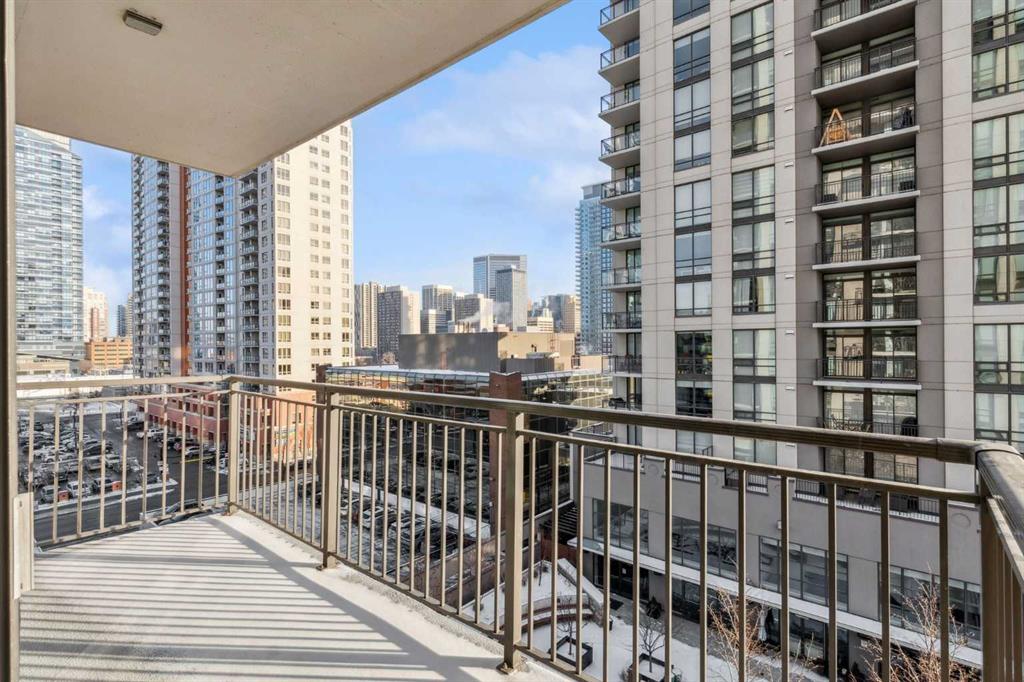 comfort, well-maintained air-conditioned 1-bedroom + den condo, located in the heart of Calgary’s Beltline . An efficient open-concept layout seamlessly connects the kitchen, dining, and living areas. The U-shaped kitchen is equipped with a gas cooktop, oven, microwave hood fan, refrigerator, dishwasher, tiled backsplash, ample cabinetry, and a breakfast bar island. Sliding doors from the living room open onto a generously sized balcony. floor-to-ceiling windows complete the bright bedroom and living room. The den/storage provides excellent flexibility to set up an office. Refrigerator is brand new. The unit includes titled heated underground parking . Building amenities include full time concierge, bike storage room, guest suites, fitness room, party room, in building visitor parking.