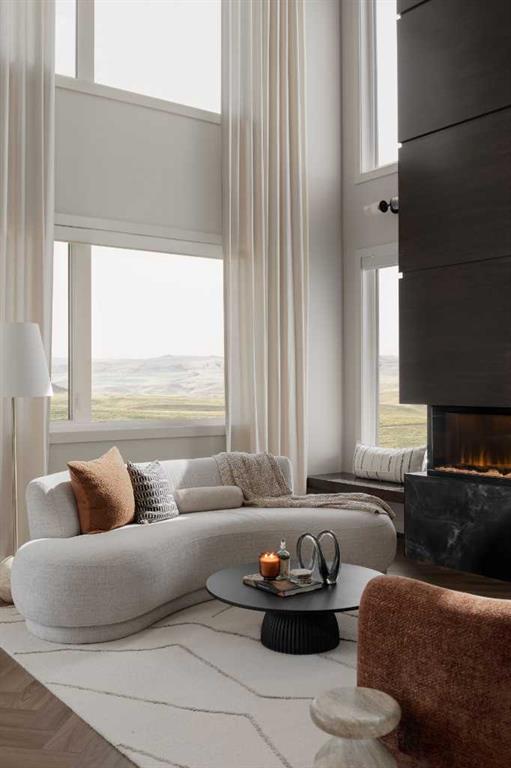 Purchase this extraordinary show home at today’s prices while benefiting from the leaseback program—a rare opportunity that blends investment savvy with exceptional design. This is more than a home; it’s a lifestyle experience. Offering just over 5,000 sq. ft. of meticulously designed living space, every detail has been crafted with one purpose: living beautifully. Step inside to elegant herringbone flooring, where natural light floods the home from every angle. The kitchen is a true statement of elevated design, featuring modern yet inviting cabinetry, refined porcelain countertops, a full spice kitchen, and chef-grade appliances that make even daily rituals feel indulgent. The main level is anchored by a spacious great room highlighted by a dramatic two-storey walnut fireplace feature—equally suited for hosting unforgettable gatherings or enjoying quiet evenings at home. A main-floor bedroom and formal sitting room complete this level with thoughtful versatility. Upstairs, the primary retreat is a serene escape. The spa-inspired ensuite offers heated tile floors, a steam shower, and a generous walk-in closet, complemented by expertly curated custom built-ins. Three additional bedrooms—one with a private ensuite—along with a separate full bathroom and a tucked-away bonus room create a perfectly balanced upper floor. The fully finished basement elevates the lifestyle even further, featuring an expansive recreation room, sleek wet bar, private gym, and an additional guest suite. Whether it’s a cocktail evening, game night, or extended family stay, this level is designed to host it all with ease. Throughout the home, custom woodwork, designer lighting, and luxurious finishes set this show home apart. Add to that an attached three-car garage and a prime location offering small-town charm with quick access to Calgary, and you have convenience without compromise. This isn’t just a show home—it’s the new standard for luxury living in Balzac.