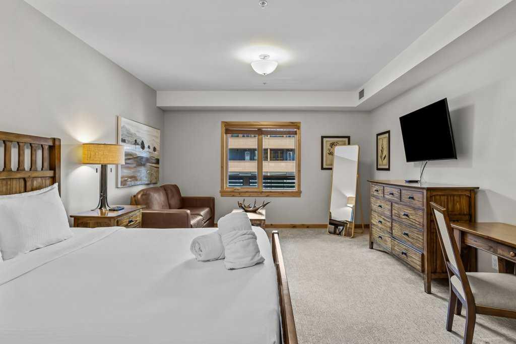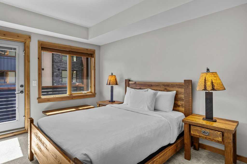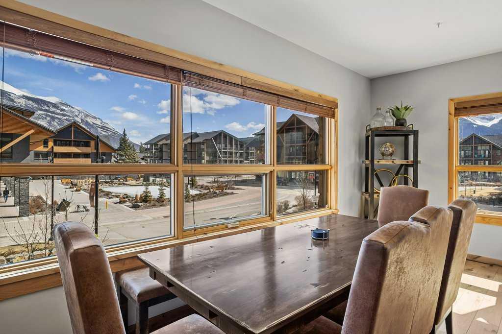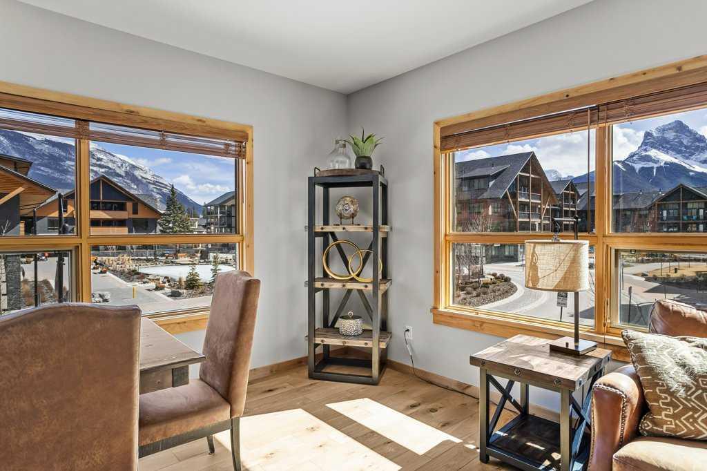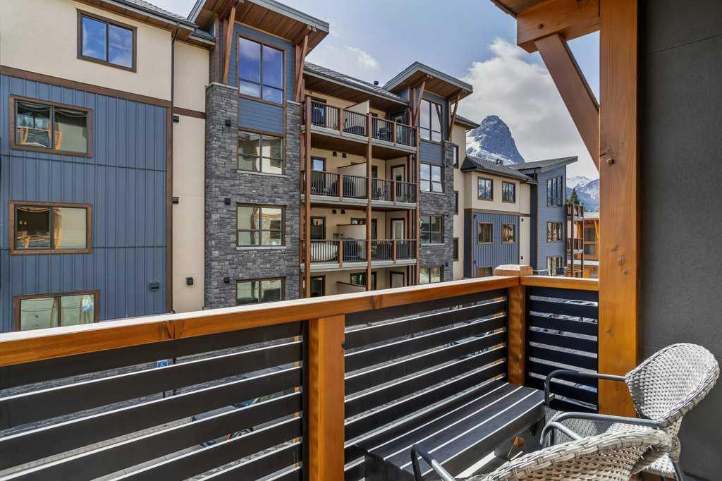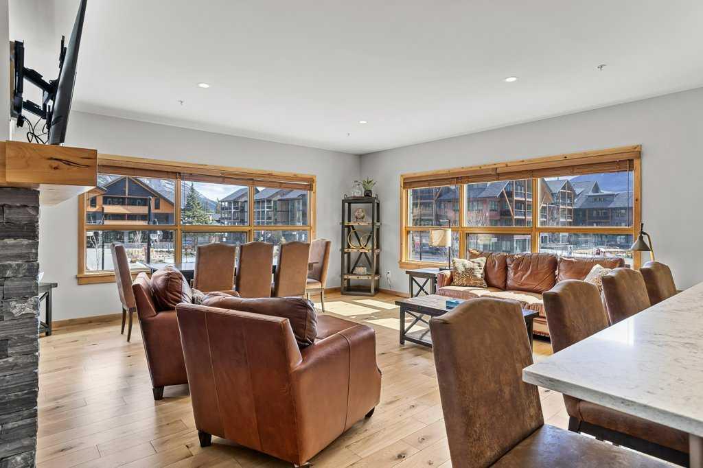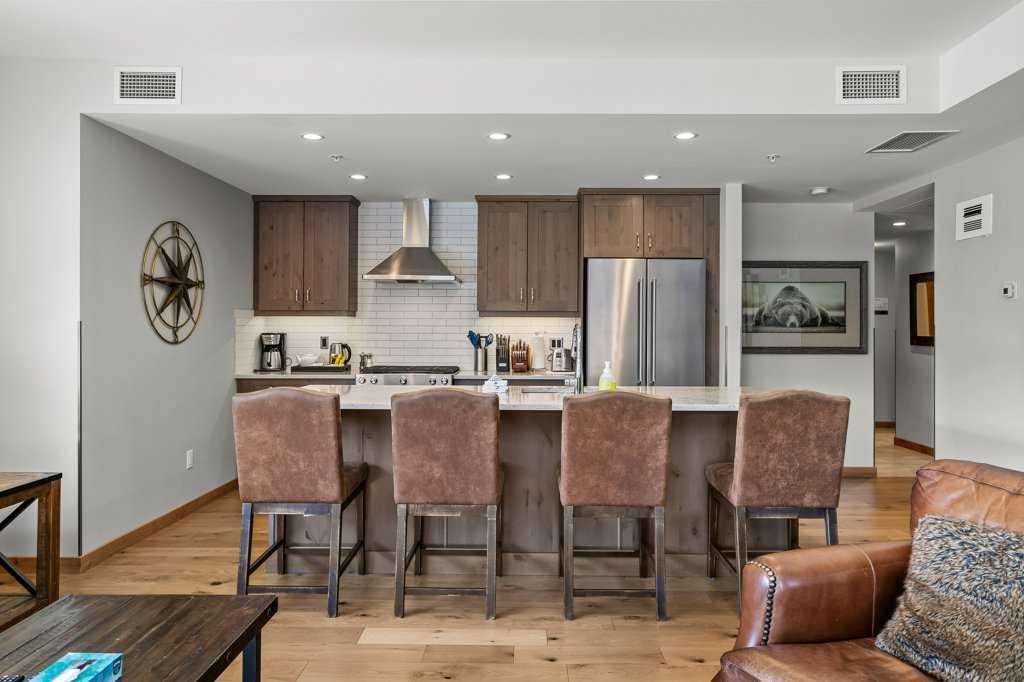 this property is a rare Tourist Home designated 2-bedroom + den (3rd bedroom) investment opportunity in White Spruce Lodge located in Spring Creek in downtown Canmore. This property is turn-key and sold fully furnished, with rentals on the books for 2026. This lovely corner unit has windows on all sides bringing in abundant natural light, great views, and is located on the highly sought after Spring Creek Plaza overlooking the pond and steps from the Bridgette Bar restaurant, other great retail amenities, parks, paths and walking distance to Main Street Canmore. The large gourmet kitchen and living area are ideal for family gatherings complete with stainless appliances, large quartz counters, hardwood floors, and a stone gas fireplace. The primary bedroom features a king bed, walk in closet and a 5-piece spa inspired ensuite bathroom. White Spruce Lodge has an inviting courtyard hot tub, an exercise room on the main level, with an underground titled parking stall and assigned storage cage for the condo.