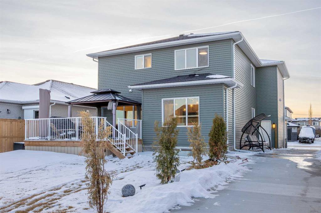 Are you looking for the perfect home that feels like an acreage, but is located right in town? This is it. Set on a large 0.2 acre lot, this customized home offers exceptional space, thoughtful upgrades, a front attached garage, and a 180-foot concrete driveway leading to an impressive detached SHOP — a rare combination in an in-town setting. This 5 BEDROOM, 4.5 BATHROOM home features a highly desirable layout, including DUEL PRIMARY SUITES ON UPPER LEVEL each with own ensuite, for a total of 4 bedrooms up plus bonus room, making it ideal for multi-generational living, extended family, or guests. The main primary ensuite is thoughtfully designed with a spacious 60” shower and a freestanding tub, offering a private retreat. Extra care and expense was made to ensure all areas of the home have matching granite countertops. The kitchen was changed extensively from builder plans to boast more counterspace, extended 40” kitchen cabinetry, and professional-grade appliances. The spacious pantry was also a blueprint change that you won't find anywhere else in this Model. Working from home is a dream in the spacious main floor office with custom cabinetry. The home is also equipped with central air conditioning for year-round comfort. Additional built-ins were added to the base plan to elevate everyday living including custom cabinetry and bench at the garage entry, a built-in TV stand, upgraded laundry shelf and storage, and fully customized walk-in closet organizers. The fully developed basement provides excellent additional living space, perfect for family use, guests, or recreation. Outside, the property truly shines with thoughtfully designed spaces for both privacy and entertaining, including a poured concrete front patio and an oversized rear deck with pergola, ideal for hosting, relaxing or watching the Northern Lights at night and sunrises in the morning. In addition to the detached double garage, the 28’ x 26’ shop with 10’ interior height is built on an 8” concrete pad with curb wall, fully insulated and wired, featuring storage trusses and OSB-sheeted walls, making it ideal for hobbyists, trades, or a home-based business. This is a gorgeous, well-planned home that delivers on layout, upgrades, and functionality, all within a welcoming small-town community, offering the space of an acreage with the convenience of being right in town. Langdon is a growing town with two elementary schools and a new high school. All just a short drive east of Calgary! Come experience space, clean air, and small town feel!