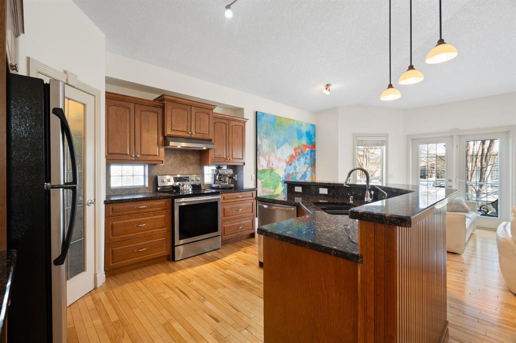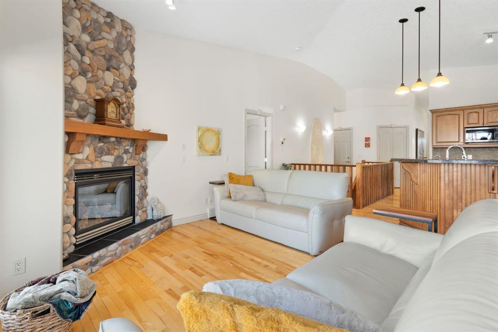 Welcome to this immaculately maintained 3 bedroom, 2.5 bathroom walkout bungalow villa, tucked into an exceptionally well-managed and peaceful condominium community in Okotoks’ desirable Air Ranch. Designed for comfort and ease, the main floor offers everything you need for day to day living, including a spacious primary bedroom, 1.5 bathrooms, laundry, and an open concept kitchen and living area. Vaulted ceilings, original hardwood floors, and granite countertops create a sense of warmth and openness that feels both timeless and inviting. A natural gas fireplace anchors the living space, making it equally suited for quiet evenings or entertaining. The fully developed walkout lower level expands your living space beautifully, with two additional bedrooms, a full bathroom, and an exceptionally large recreation room, all enhanced by in floor heating, a feature you’ll truly appreciate year round. Privacy here is outstanding. Enjoy quiet and friendly neighbours, and easy access to the scenic walking paths surrounding the ponds throughout the Air Ranch community and beyond. Outdoor living is equally thoughtful: a west facing front porch welcomes afternoon sun, while the east facing upper deck is perfect for morning coffee. The lower patio, also east facing, features a natural gas BBQ hookup and ample space for outdoor dining and relaxation. This home is in excellent condition and truly move-in ready, with thoughtful upgrades including a new hot water tank (December 2024) and a recently serviced furnace (December 2025) that received a strong bill of health.