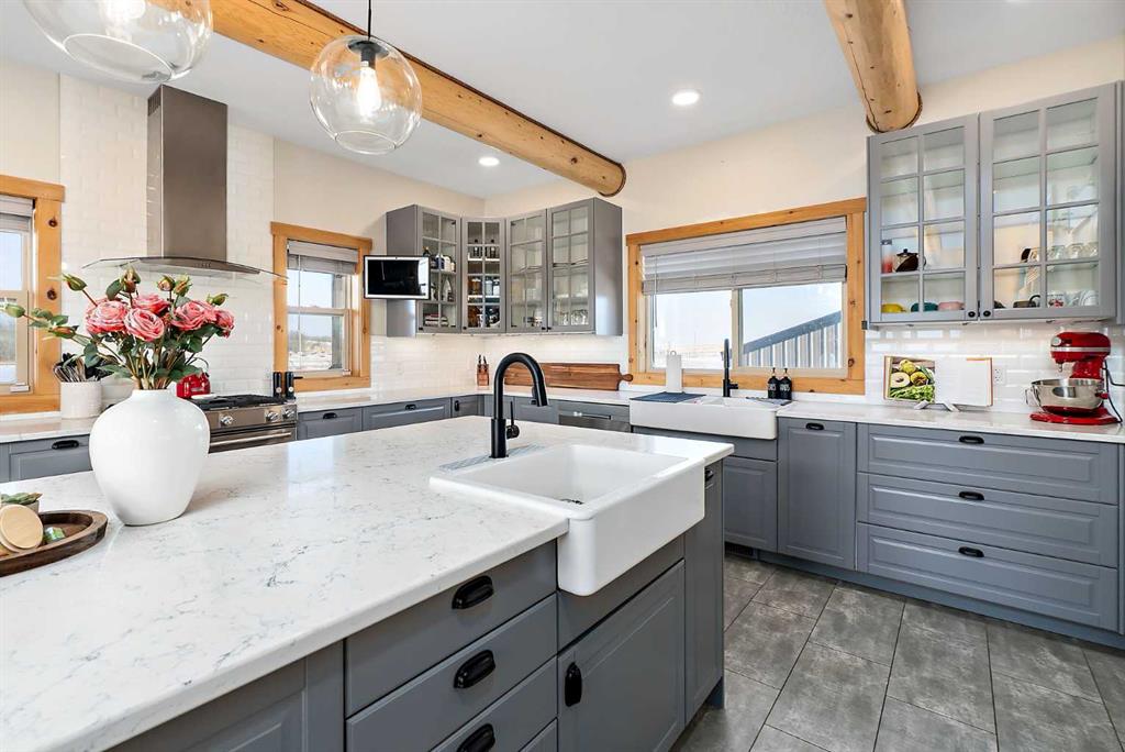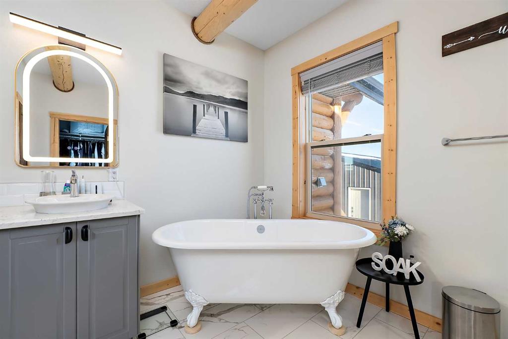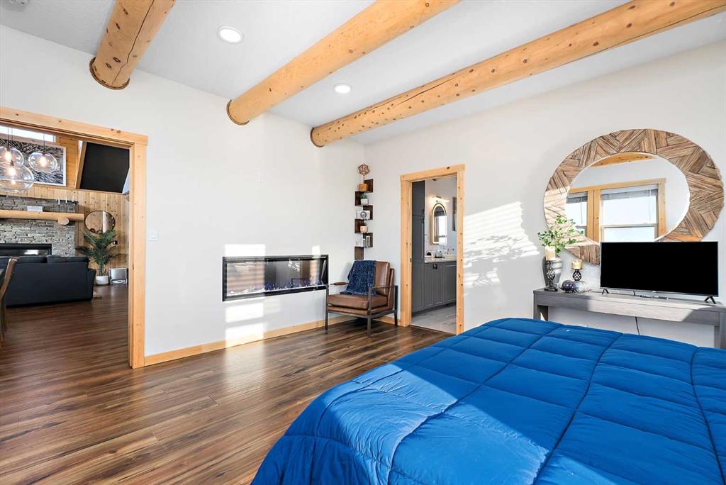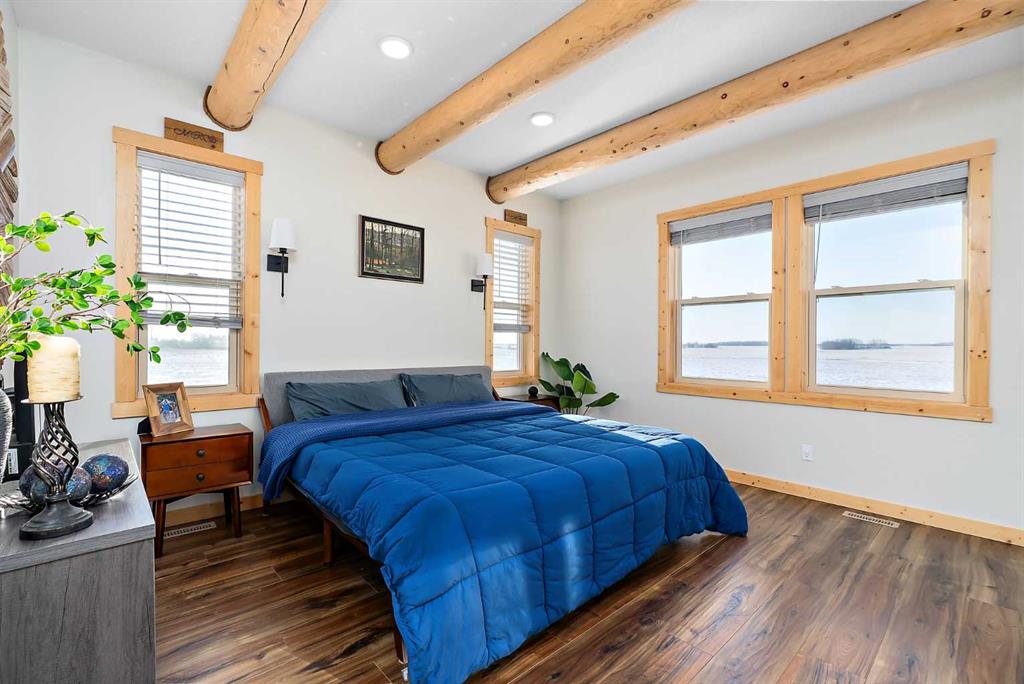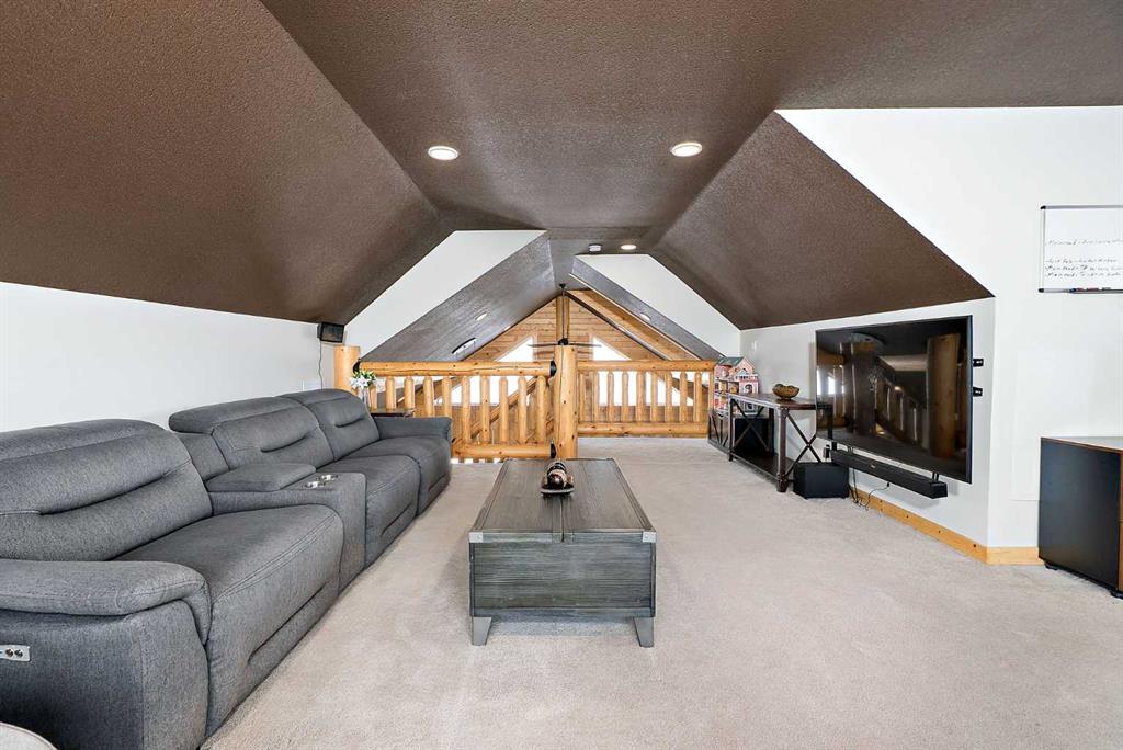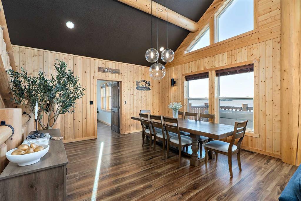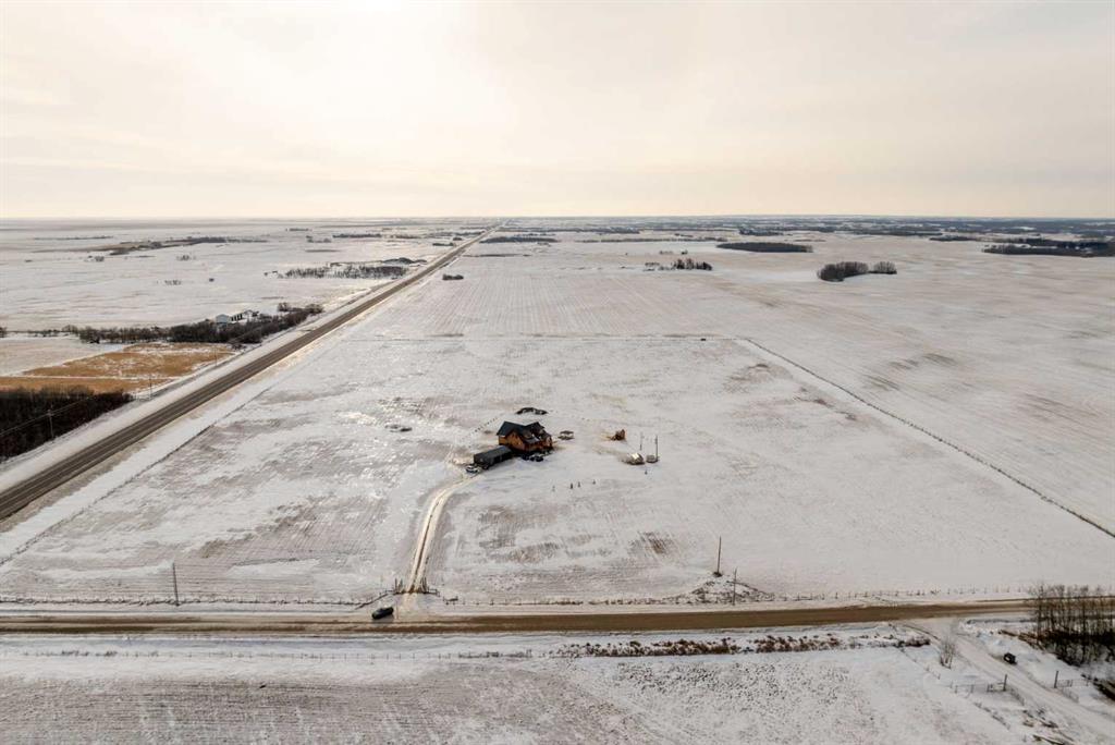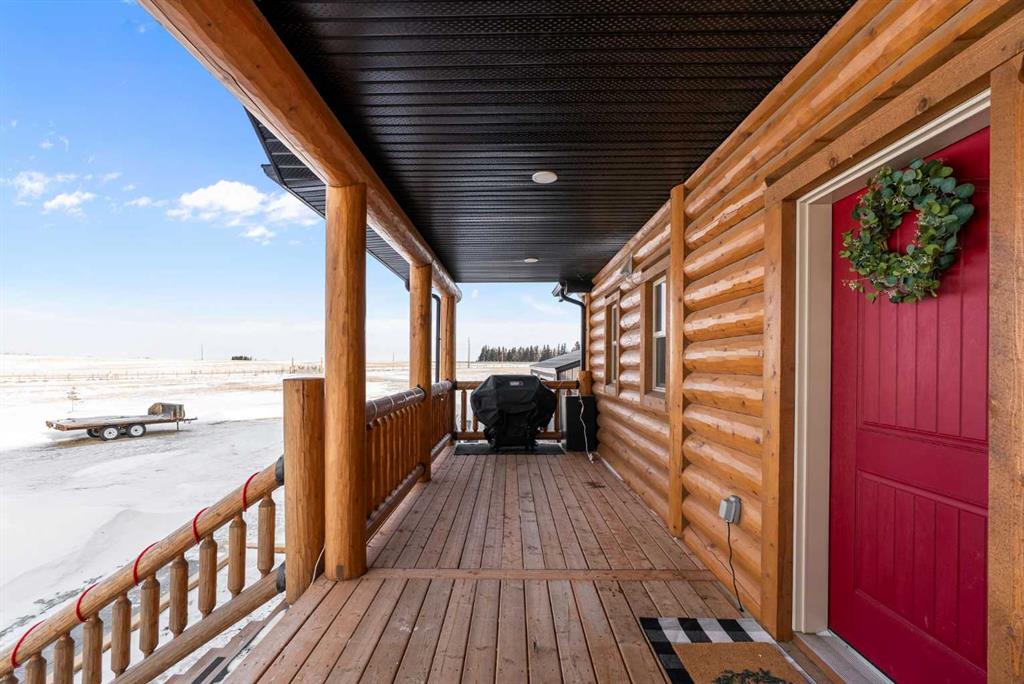 Custom-built Whisper Creek Kodiak Mountain Hybrid on 28.49 acres in Beaver County, featuring a triple detached garage designed to offer an exceptional blend of rustic luxury and modern comfort. This open-concept home welcomes you with soaring 20' vaulted ceilings, striking log accents, and expansive windows that fill the space with natural light. A stunning stone fireplace with log mantel anchors the living room, while the loft above overlooks the dining and living area, enhancing the home's grand yet inviting feel. The Kitchen is designed for both everyday living and entertaining, featuring abundant soft-close cabinetry, quartz countertops, a commercial sized fridge, gas cooktop, walk-in pantry with a coffee bar, and a large prep island with seating. The primary suite is a private retreat with an elegant 5-piece ensuite, complete with a classic clawfoot soaker tub and walk in shower. A 60” electric fireplace with numerous settings creates a relaxing atmosphere in the primary. The main level also includes a spacious mudroom/laundry room with locker-style storage and a convenient 2-piece bath. Smart light switches throughout the home. The lower level offers three additional bedrooms, a generous rec room, Kitchenette, 4-piece bath and walkout access to a covered patio and covered firepit area, extending your living space outdoors year-round. Enjoy peaceful country views from the wraparound deck and welcoming covered front porch. An oversized triple car garage with 60 amp sub panel -ideal for workshop use, or additional powered equipment. The property is landscaped with a green space, kids' playground, and hay field, providing both function and room to roam. There is a separate 100 amp panel next to the greenhouse with a 30 amp RV shore power. Built with attention to detail, this home showcases quality craftsmanship throughout-an incredible opportunity for those seeking space, privacy and mountain inspired living. Just a 30 minute commute to Sherwood Park and Edmonton. A must see!