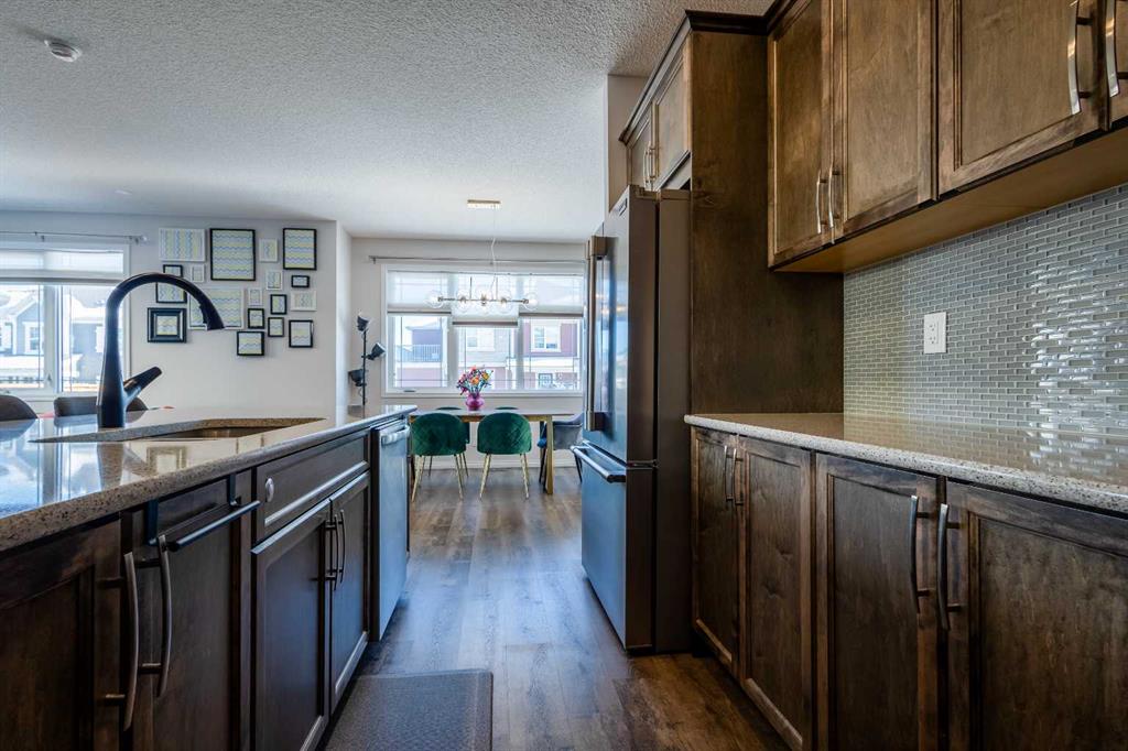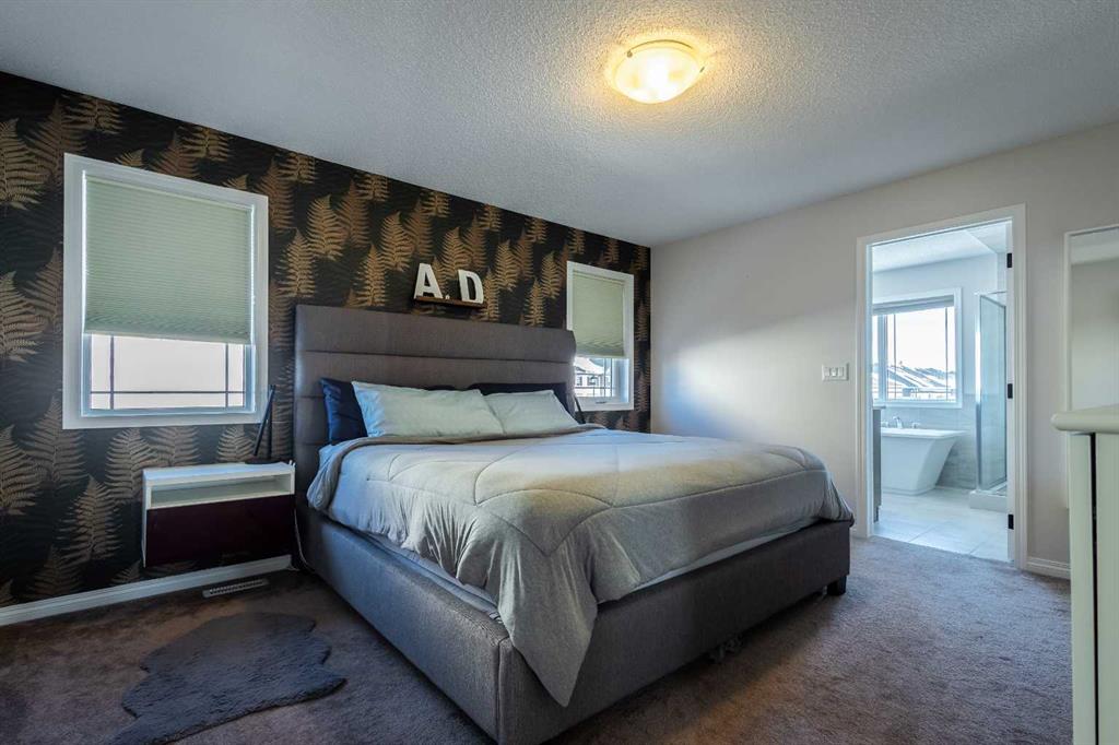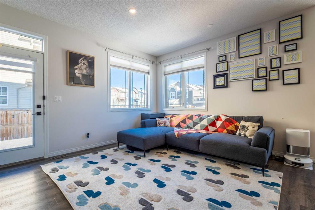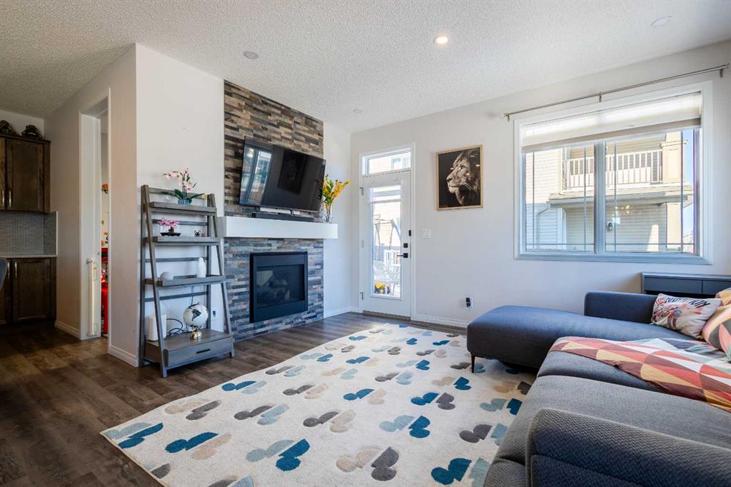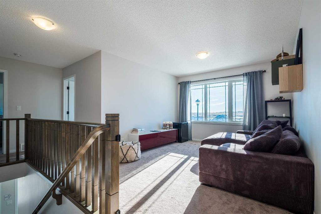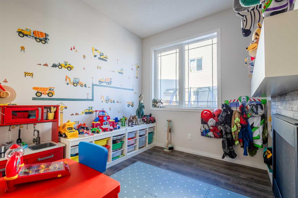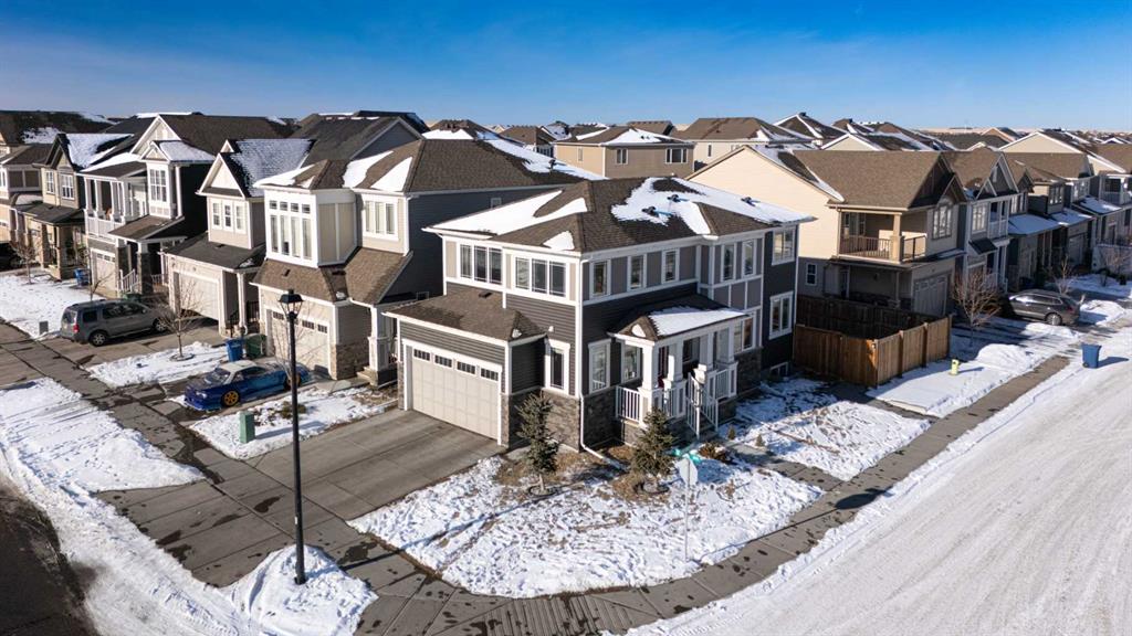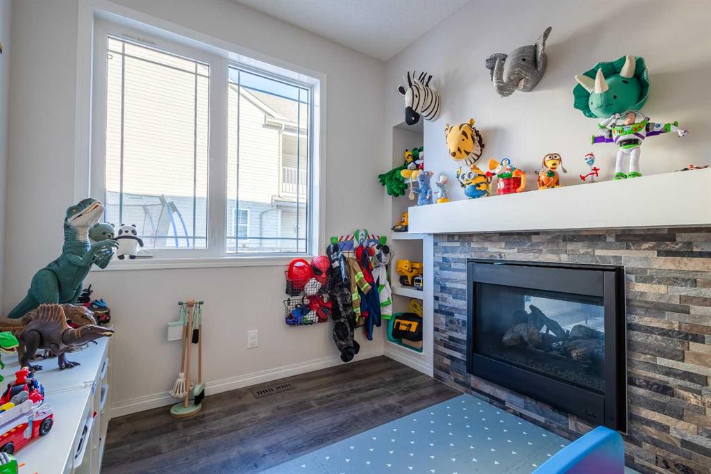 This beautifully maintained corner home is filled with natural light and thoughtfully designed to maximize space, flow, and everyday functionality. With windows on multiple exposures, soaring 9-foot ceilings, and 8-foot doors with transom details, the home feels bright, open, and welcoming from the moment you step inside. A spacious foyer opens to luxury vinyl plank flooring that runs throughout the main level. The kitchen is both stylish and practical, offering expansive quartz countertops, stainless steel appliances, and generous cabinetry—ideal for daily living and entertaining. The oversized dining area flows seamlessly into the open-concept living space, where a dual-sided gas fireplace adds warmth and definition. Large glass doors lead to a fully fenced backyard and deck, extending the living space outdoors. A main-floor office enjoys the glow of the dual-sided fireplace, creating a comfortable work-from-home environment. A functional mudroom provides access to the insulated, drywalled double attached garage, while the large driveway offers excellent additional parking—an added benefit of this corner unit. Upstairs, a sun-filled bonus room is surrounded by walls of windows and accented by a wraparound wood railing, creating a bright and airy retreat. A large upper-level laundry room and linen storage enhance everyday convenience. The primary bedroom comfortably accommodates a king-sized bed and features a walk-in closet and a spa-inspired ensuite with a floating soaker tub, glass walk-in shower, and extra-tall quartz-topped vanity. Two additional generously sized bedrooms and a well-appointed main bath continue the home’s light-filled design. The fully finished lower level, completed by the builder, offers exceptional versatility with a walk-up separate entrance, second laundry area, and wet bar/kitchenette. A spacious fourth bedroom and full four-piece bathroom complete this level, along with a large finished storage room—ideal for guests, extended family, or future suite potential. Located in a vibrant, family-friendly community with multiple playgrounds—including a rock-climbing park—just steps away, as well as nearby shopping, services, and convenient access to major commuter routes. This bright corner home truly stands out and is a must-see.