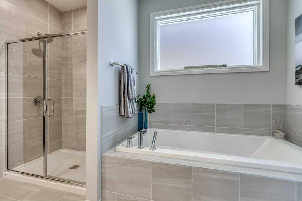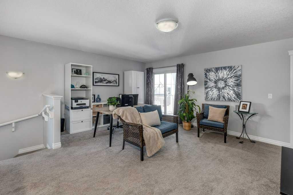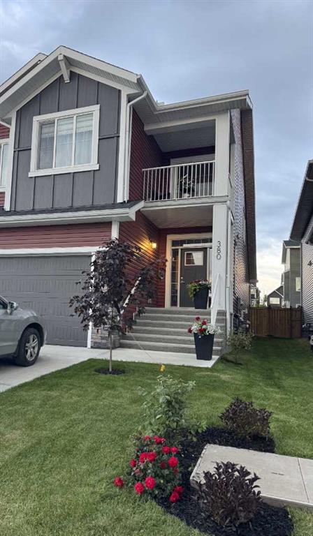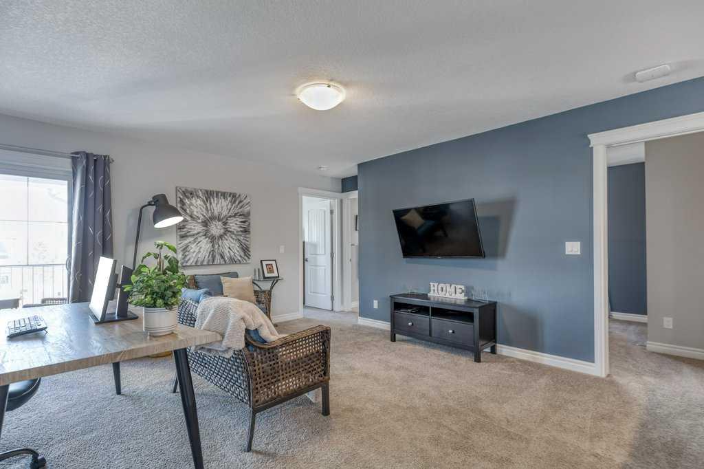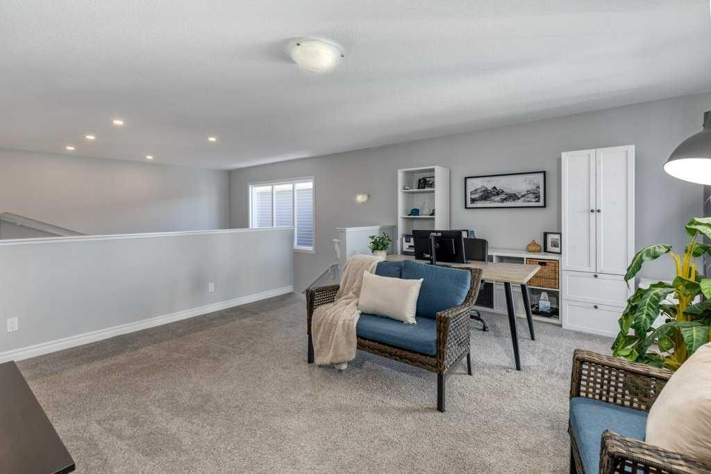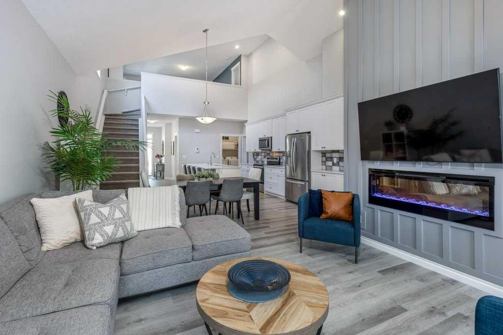 If you’re searching for bungalow-style living with a bonus, this thoughtfully designed one-and-a-half storey home offers exceptional comfort, functionality, and style. With the primary bedroom and laundry located on the main floor, this home lives like a bungalow while still providing valuable additional space above. The primary bedroom is a true retreat, featuring beautiful vaulted ceilings, large windows, and an abundance of natural light. A custom barn door leads to the spa-inspired ensuite, complete with quartz countertops, double vanity, separate shower, and a deep soaker tub. The elegant white kitchen showcases quartz countertops, ample cabinetry, a large flat island, stainless steel appliances, and a walk-in pantry, making it ideal for both everyday living and entertaining. Soaring vaulted ceilings carry through the open-concept kitchen, dining, and living areas, where the electric fireplace is framed by a stunning floor-to-ceiling feature wall with paneled millwork, creating a warm and sophisticated focal point. Luxury Vinyl Plank flooring flows throughout the main level, with cozy carpet in the primary bedroom and upper floor. The upper level offers a private, dedicated space for family or guests, featuring two well-appointed bedrooms that share a nicely finished Jack-and-Jill bathroom with quartz countertops. The family/bonus room, wired for a wall-mounted TV and offering access to an upper deck with mountain views and sunsets , is a versatile space perfectly suited for work, rest, or relaxation.